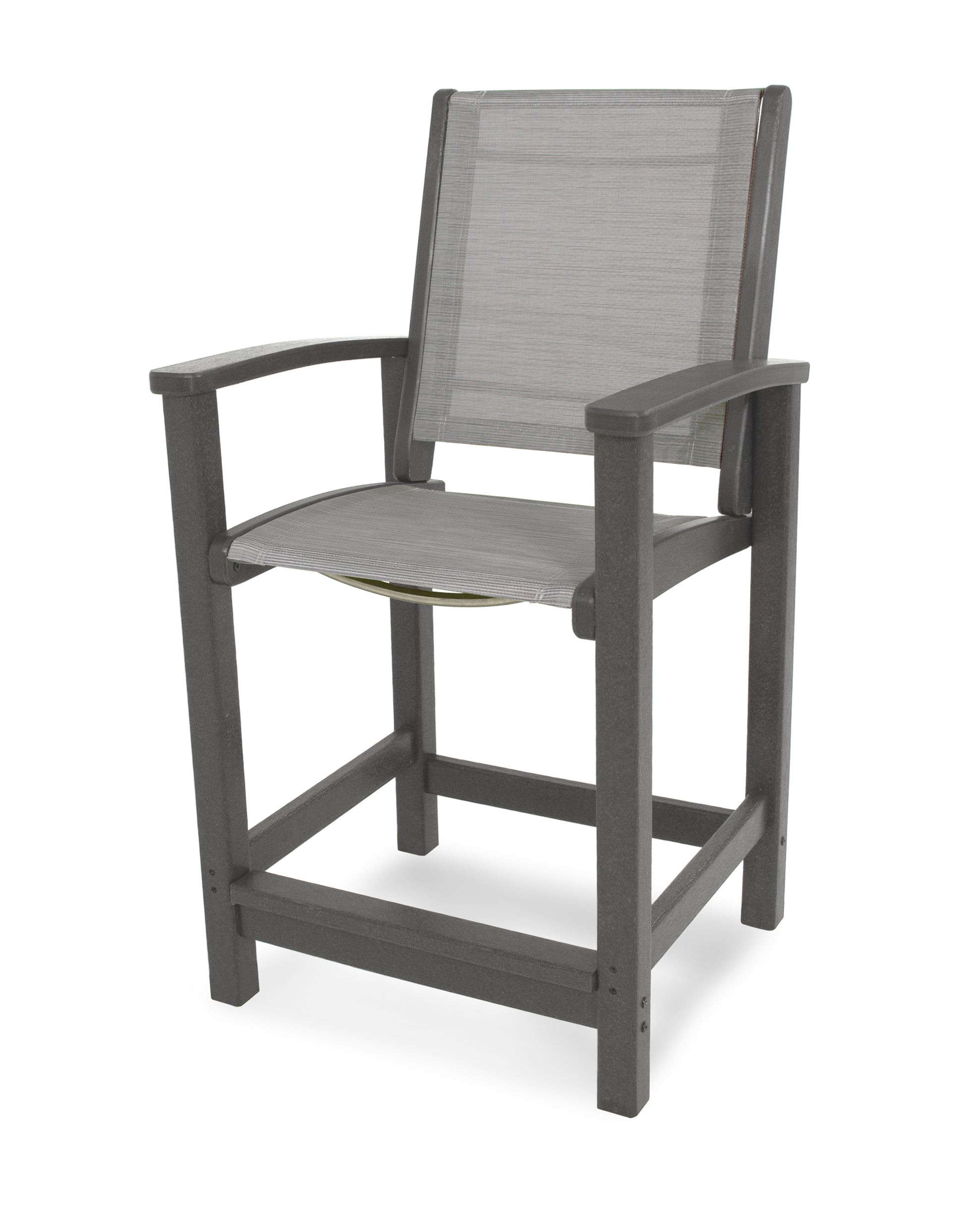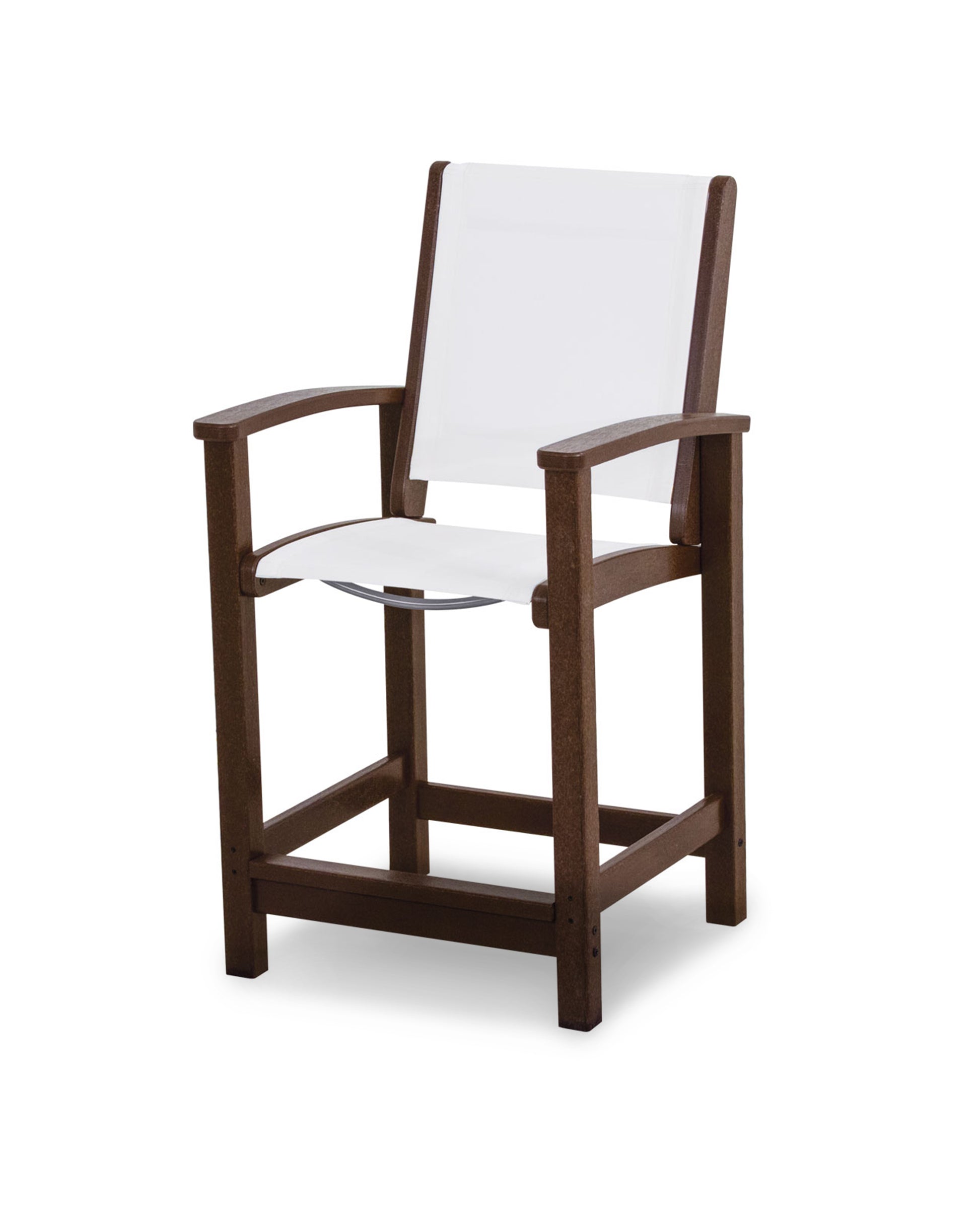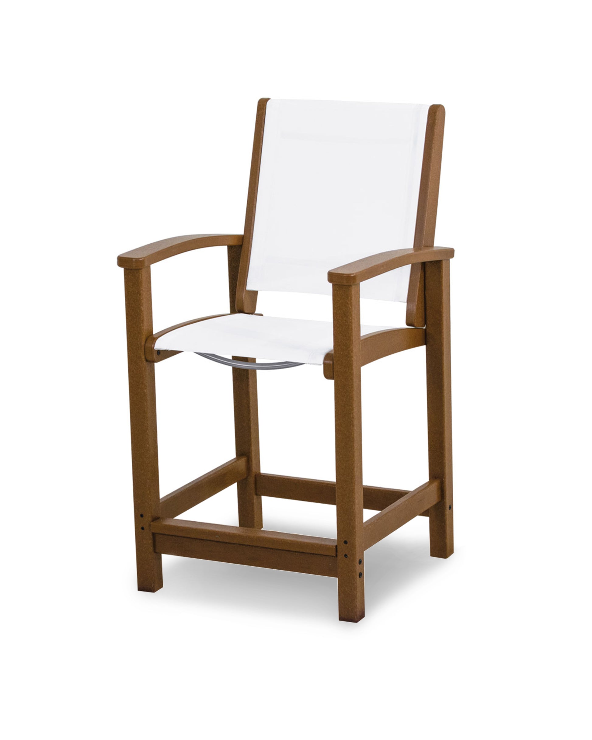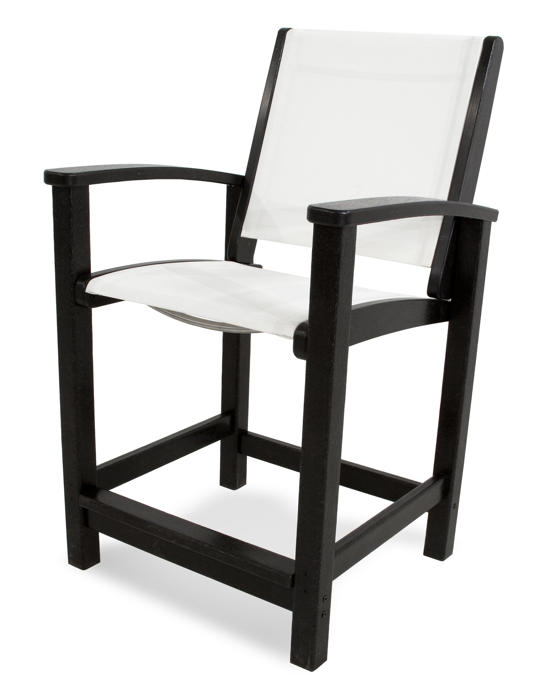 Sit back and relax in the Coastal Counter Arm Chair. This contemporary counter-height chair is available in a variety of attractive, fade-resistant frame colors paired with comfortable, all-weather sling. Not only will you enjoy the comfort of this stylish chair, but you'll love how easy it is to keep clean. Constructed with genuine POLYWOOD lumber, you can enjoy the look of painted wood without the maintenance of natural wood. Not to mention, the heavy-duty sling fabric dries quickly after a rainstorm and is resistant to tearing, mildew, and fading.