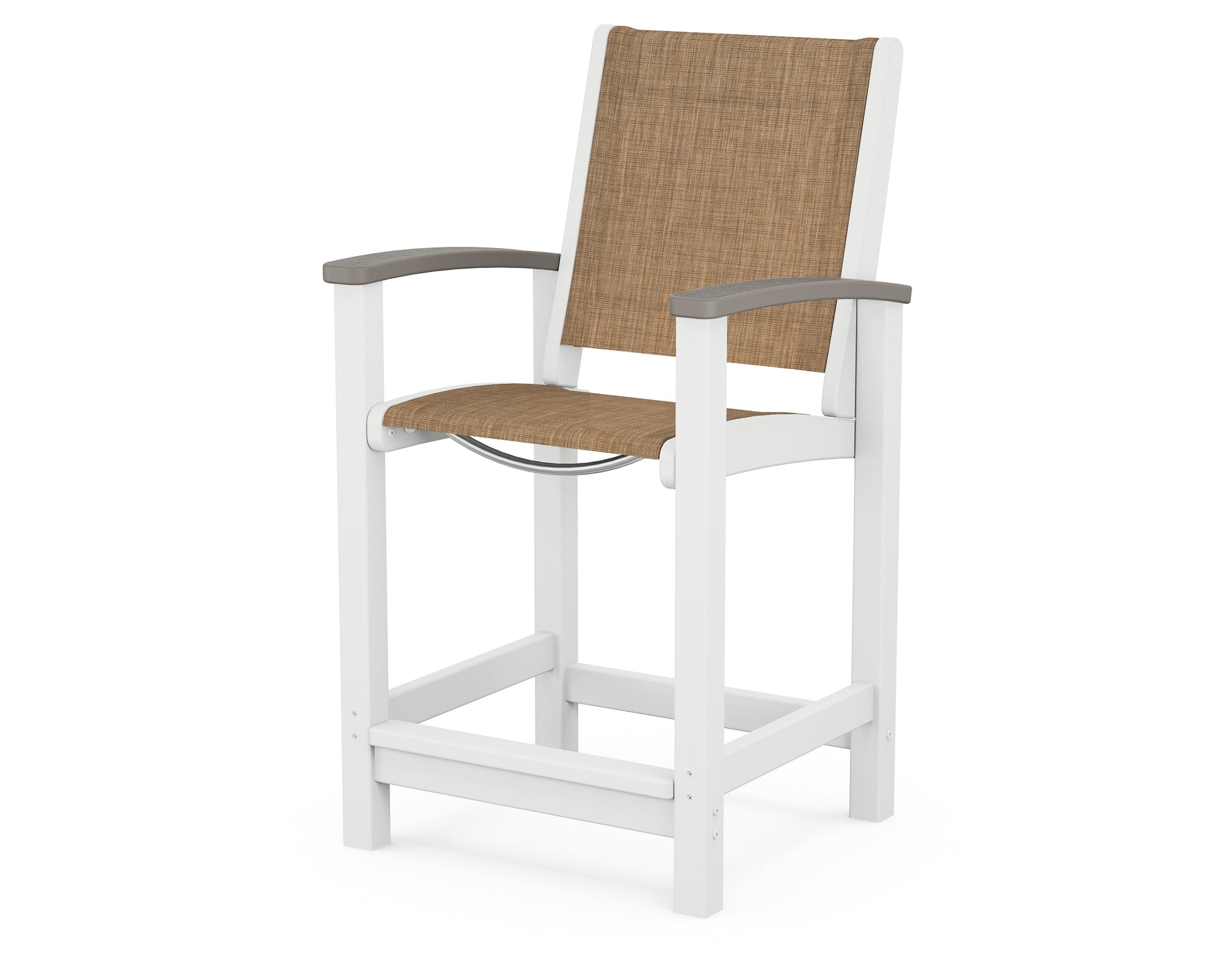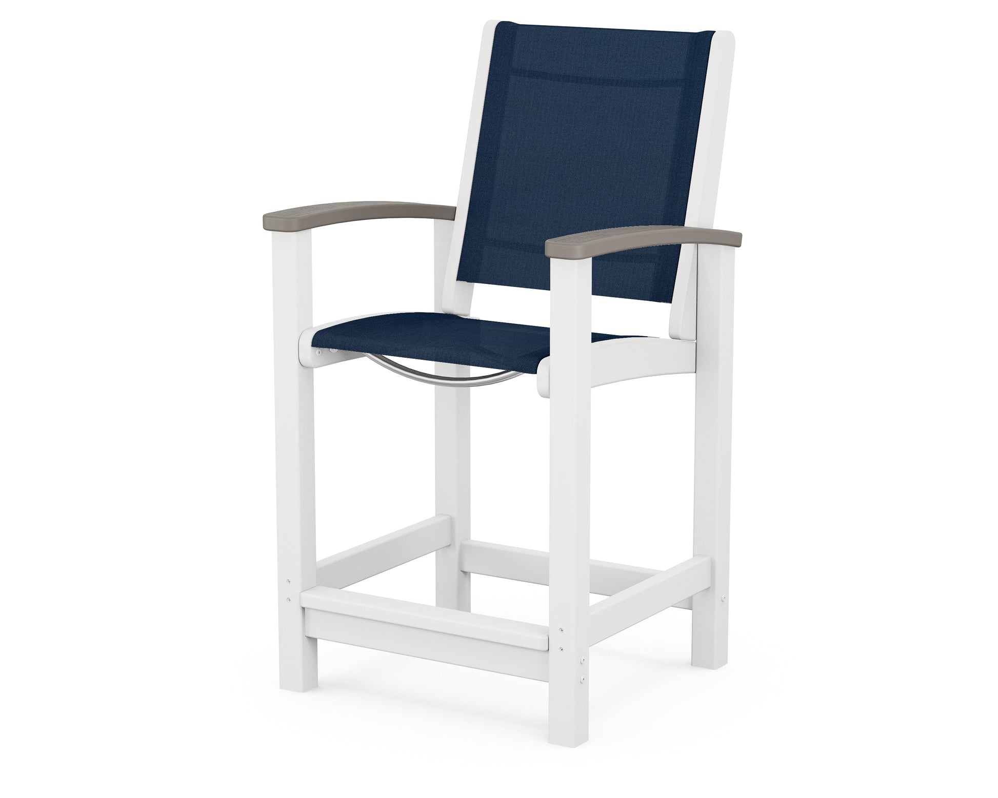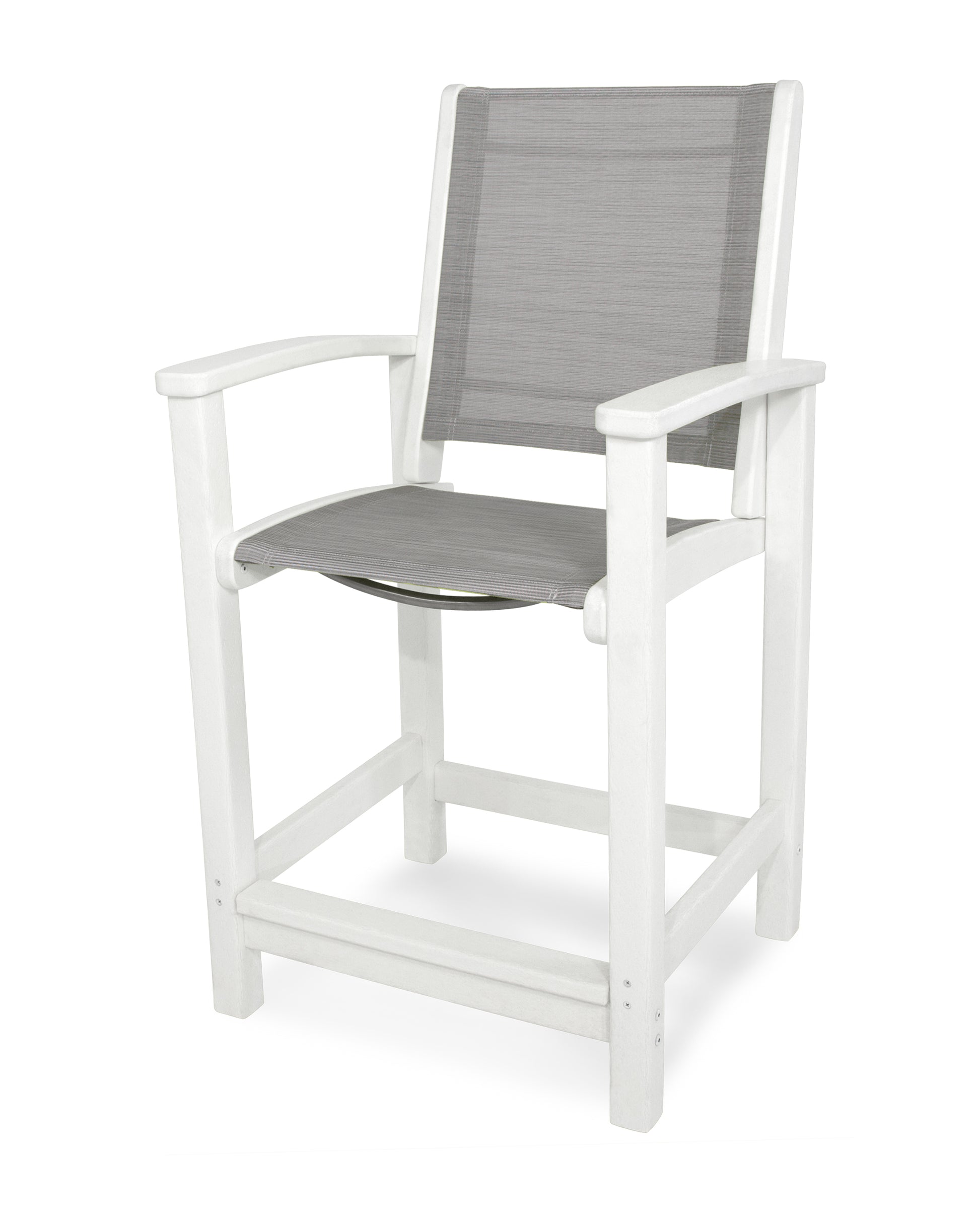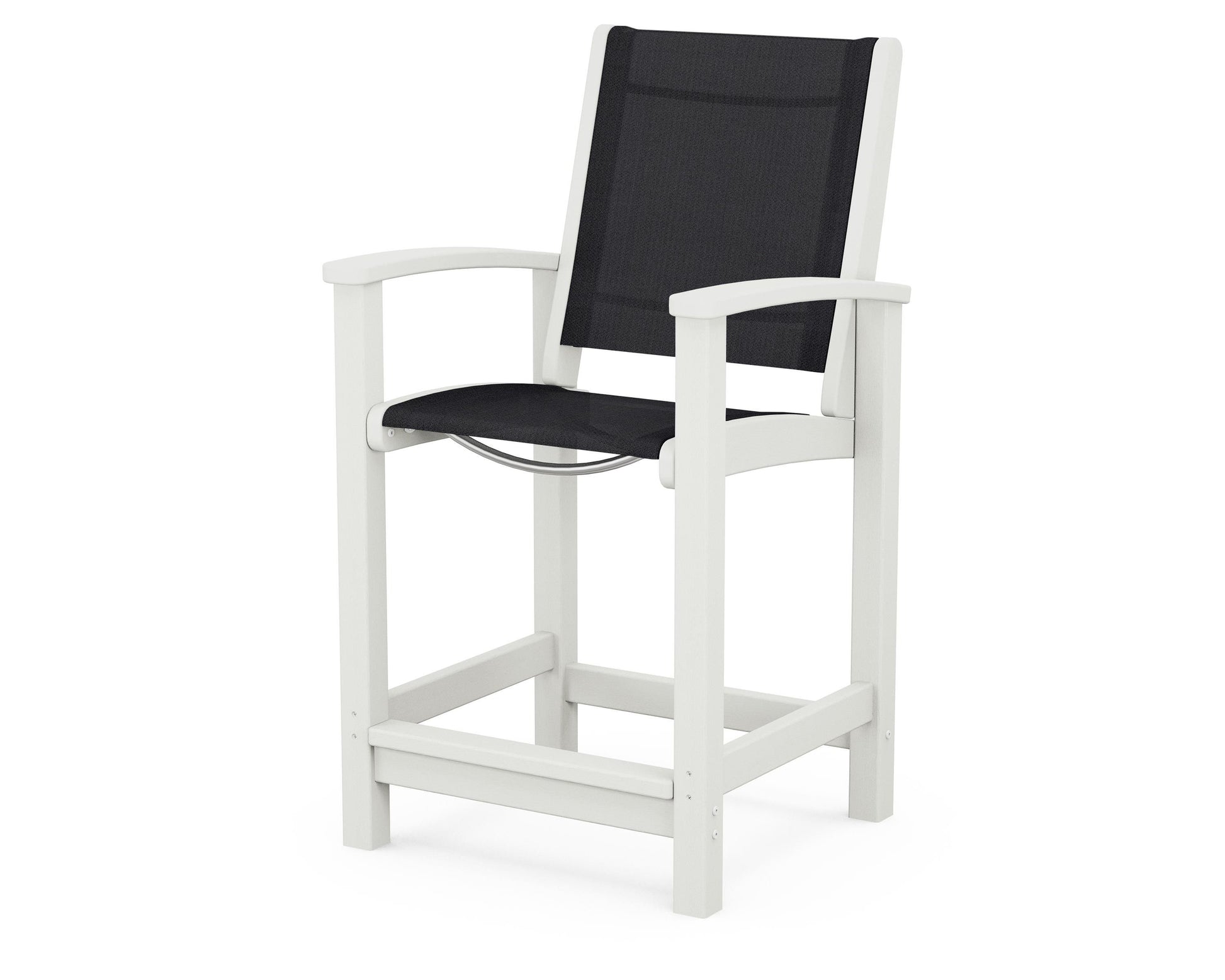 Sit back and relax in the Coastal Counter Arm Chair. This contemporary counter-height chair is available in a variety of attractive, fade-resistant frame colors paired with comfortable, all-weather sling. Not only will you enjoy the comfort of this stylish chair, but you'll love how easy it is to keep clean. Constructed with genuine POLYWOOD lumber, you can enjoy the look of painted wood without the maintenance of natural wood. Not to mention, the heavy-duty sling fabric dries quickly after a rainstorm and is resistant to tearing, mildew, and fading.