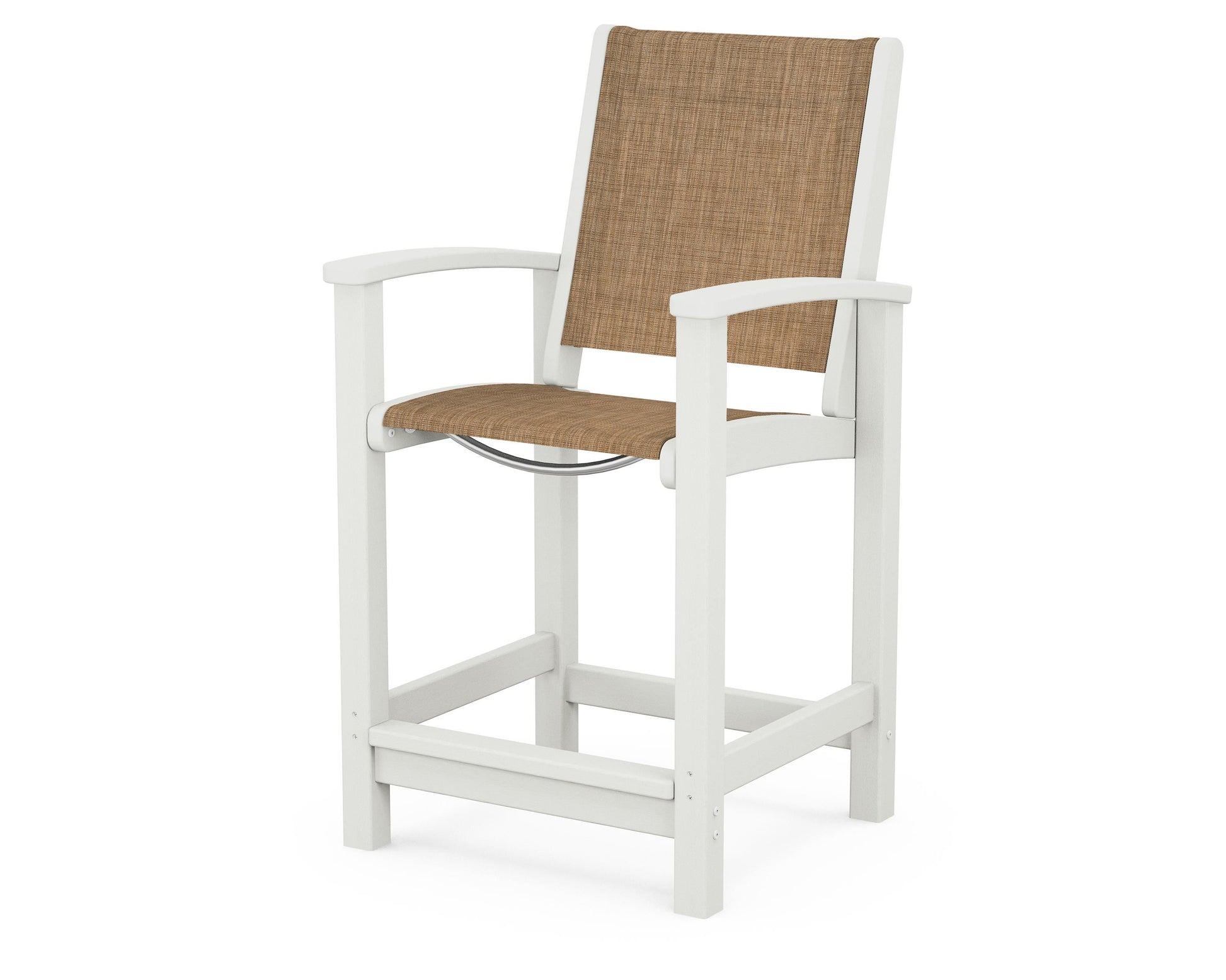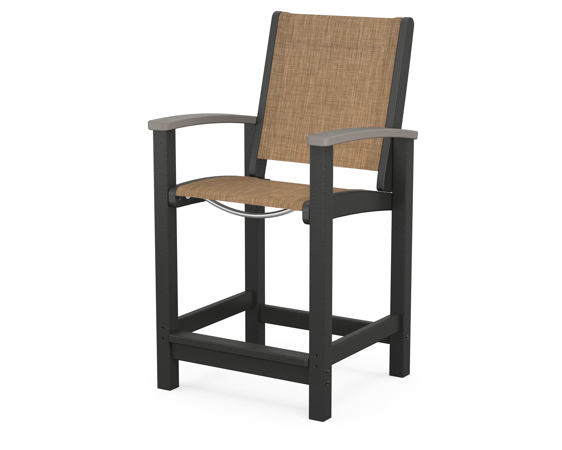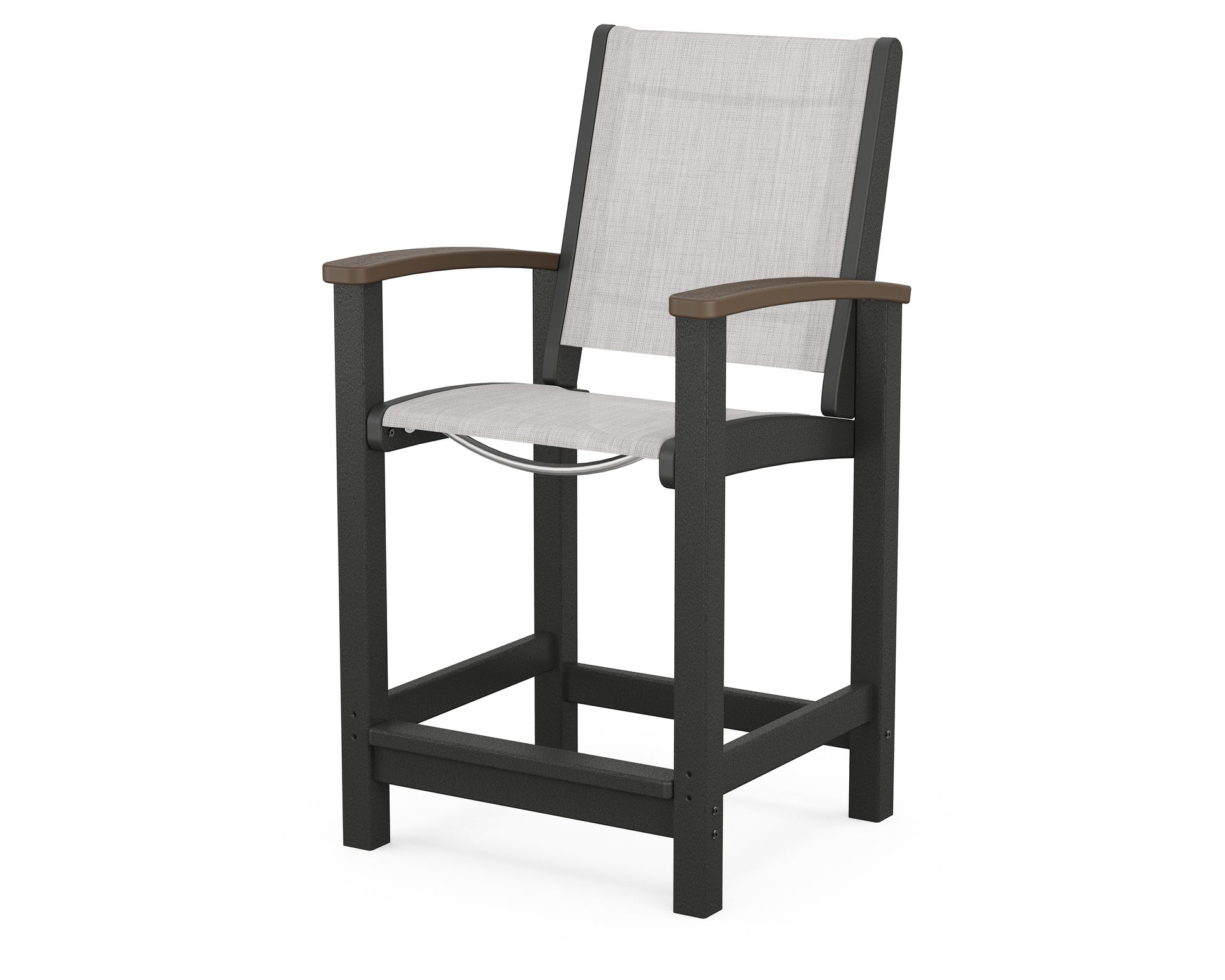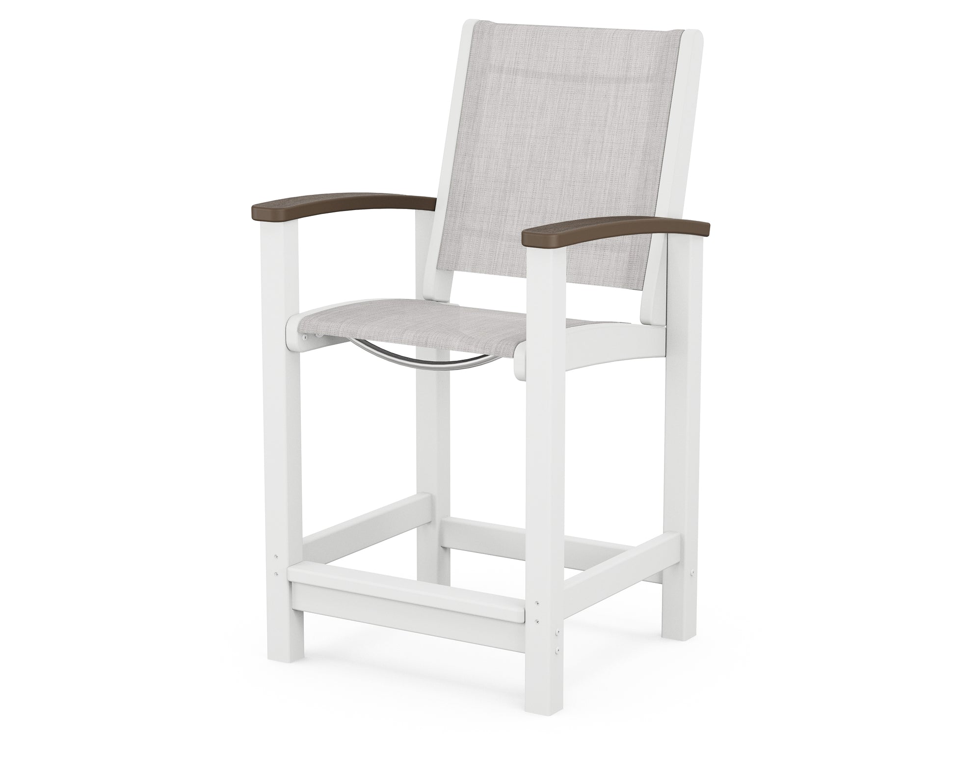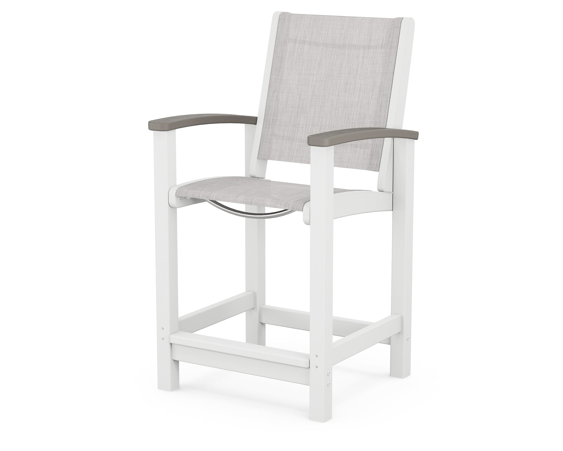 Sit back and relax in the Coastal Counter Arm Chair. This contemporary counter-height chair is available in a variety of attractive, fade-resistant frame colors paired with comfortable, all-weather sling. Not only will you enjoy the comfort of this stylish chair, but you'll love how easy it is to keep clean. Constructed with genuine POLYWOOD lumber, you can enjoy the look of painted wood without the maintenance of natural wood. Not to mention, the heavy-duty sling fabric dries quickly after a rainstorm and is resistant to tearing, mildew, and fading.