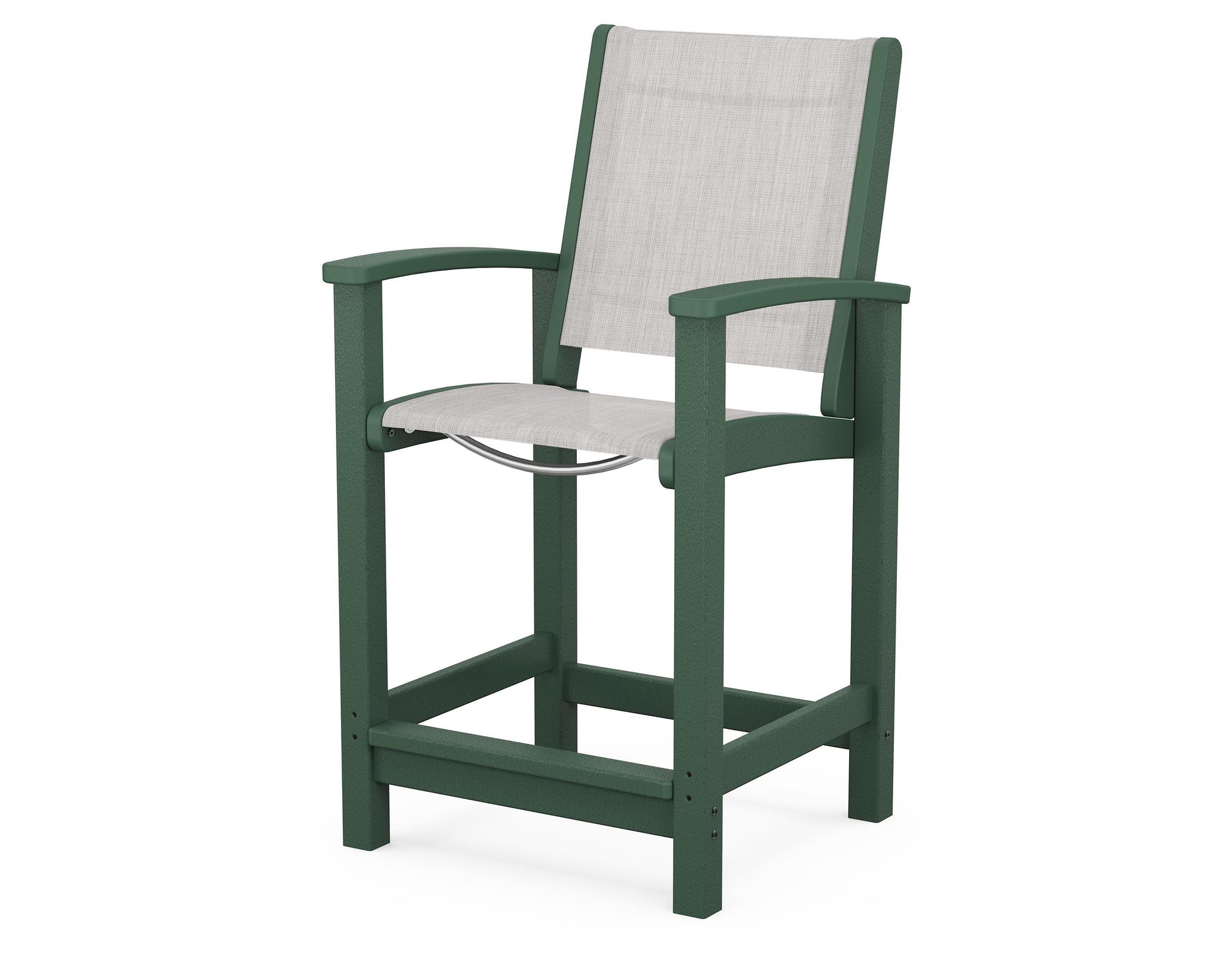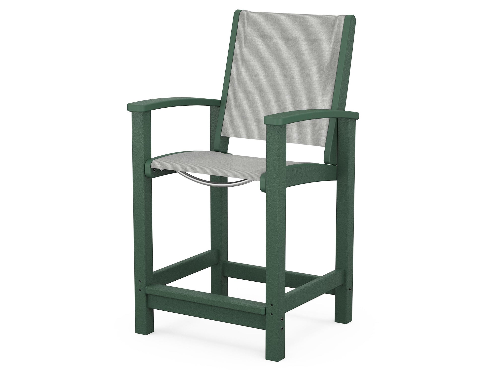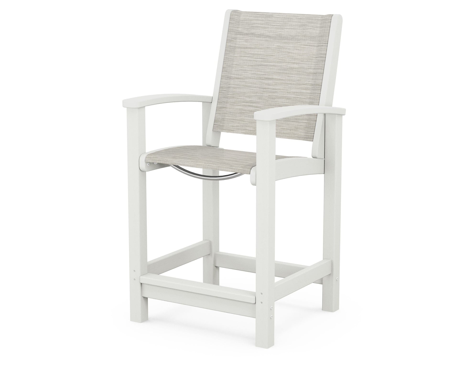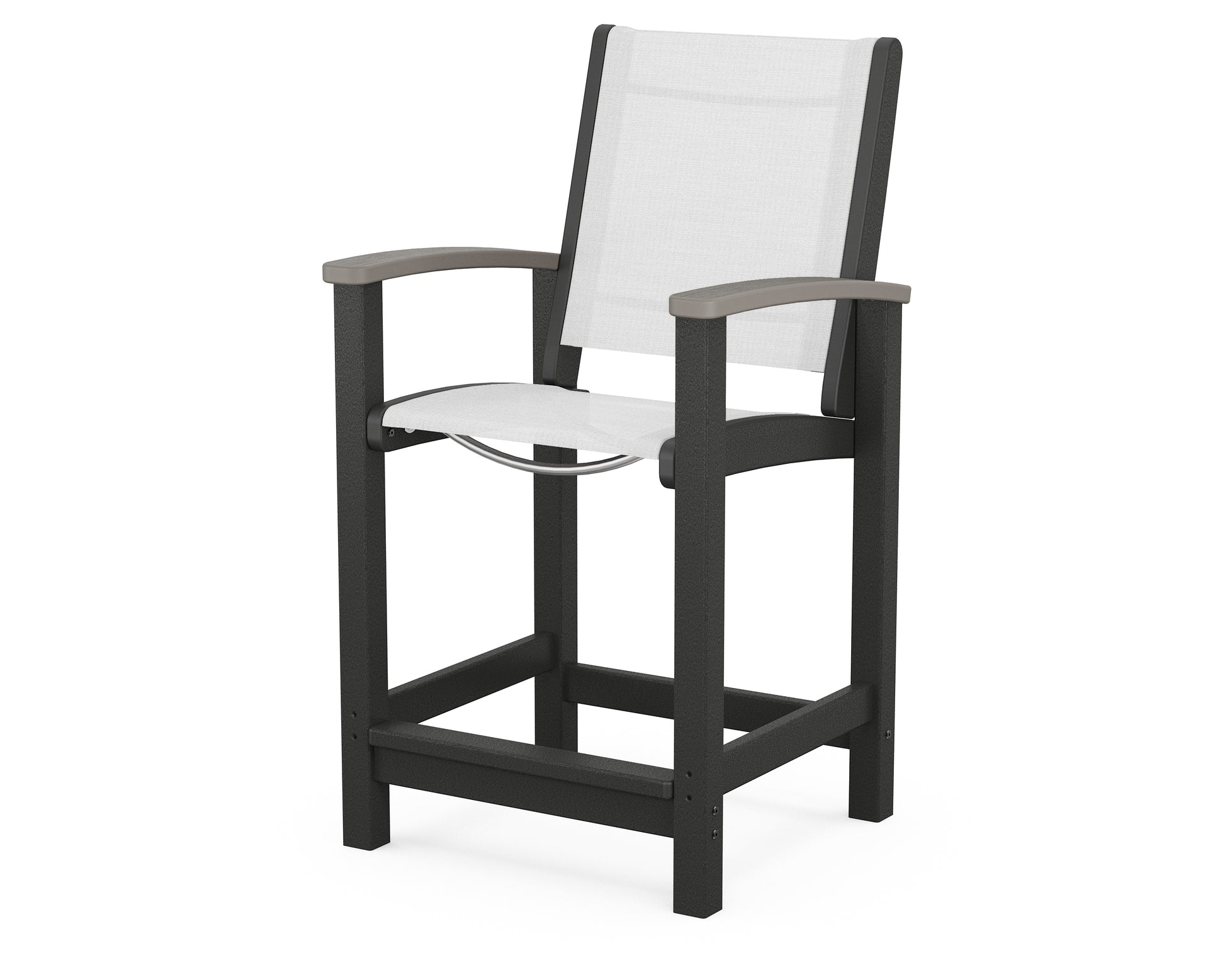 Sit back and relax in the Coastal Counter Arm Chair. This contemporary counter-height chair is available in a variety of attractive, fade-resistant frame colors paired with comfortable, all-weather sling. Not only will you enjoy the comfort of this stylish chair, but you'll love how easy it is to keep clean. Constructed with genuine POLYWOOD lumber, you can enjoy the look of painted wood without the maintenance of natural wood. Not to mention, the heavy-duty sling fabric dries quickly after a rainstorm and is resistant to tearing, mildew, and fading.