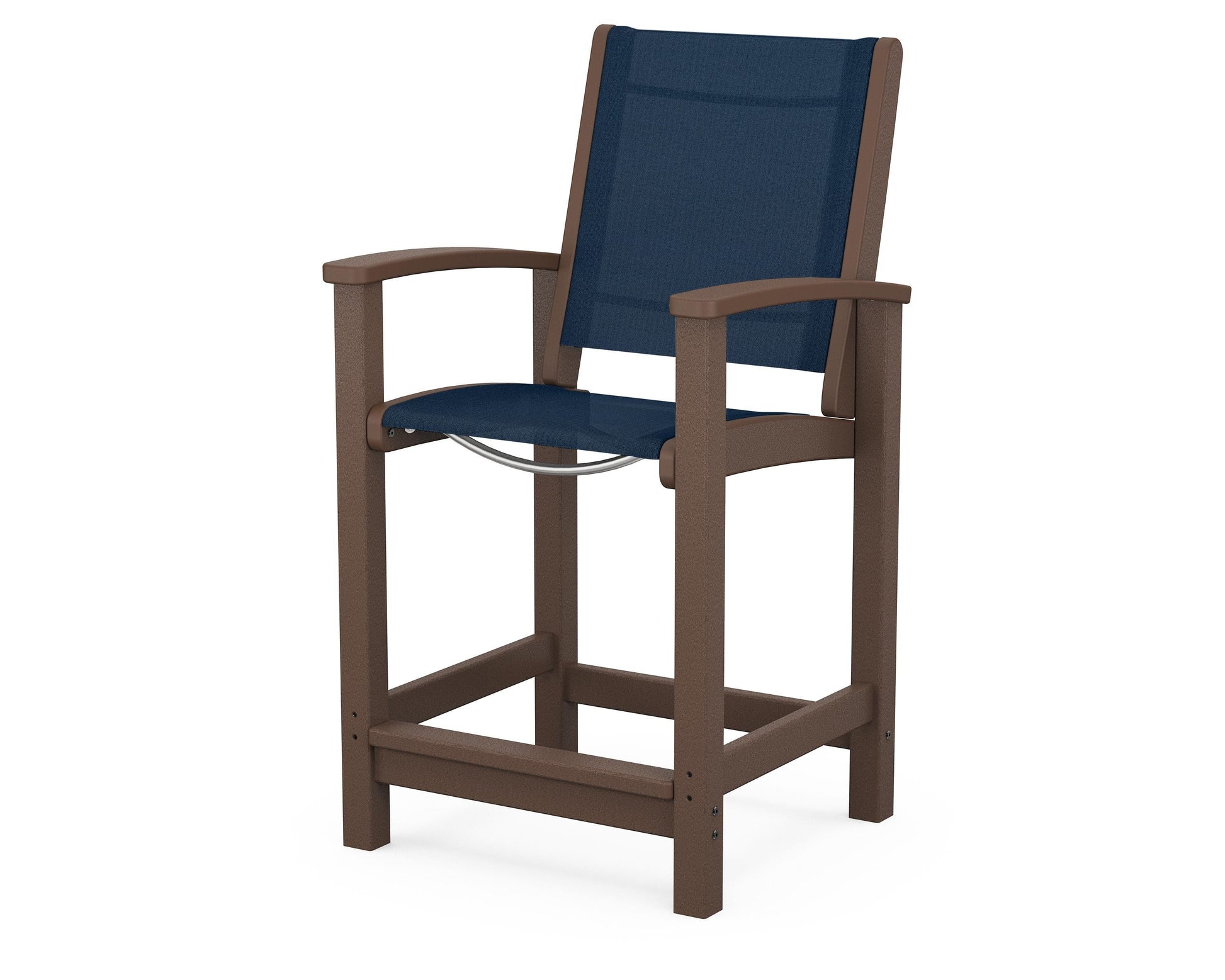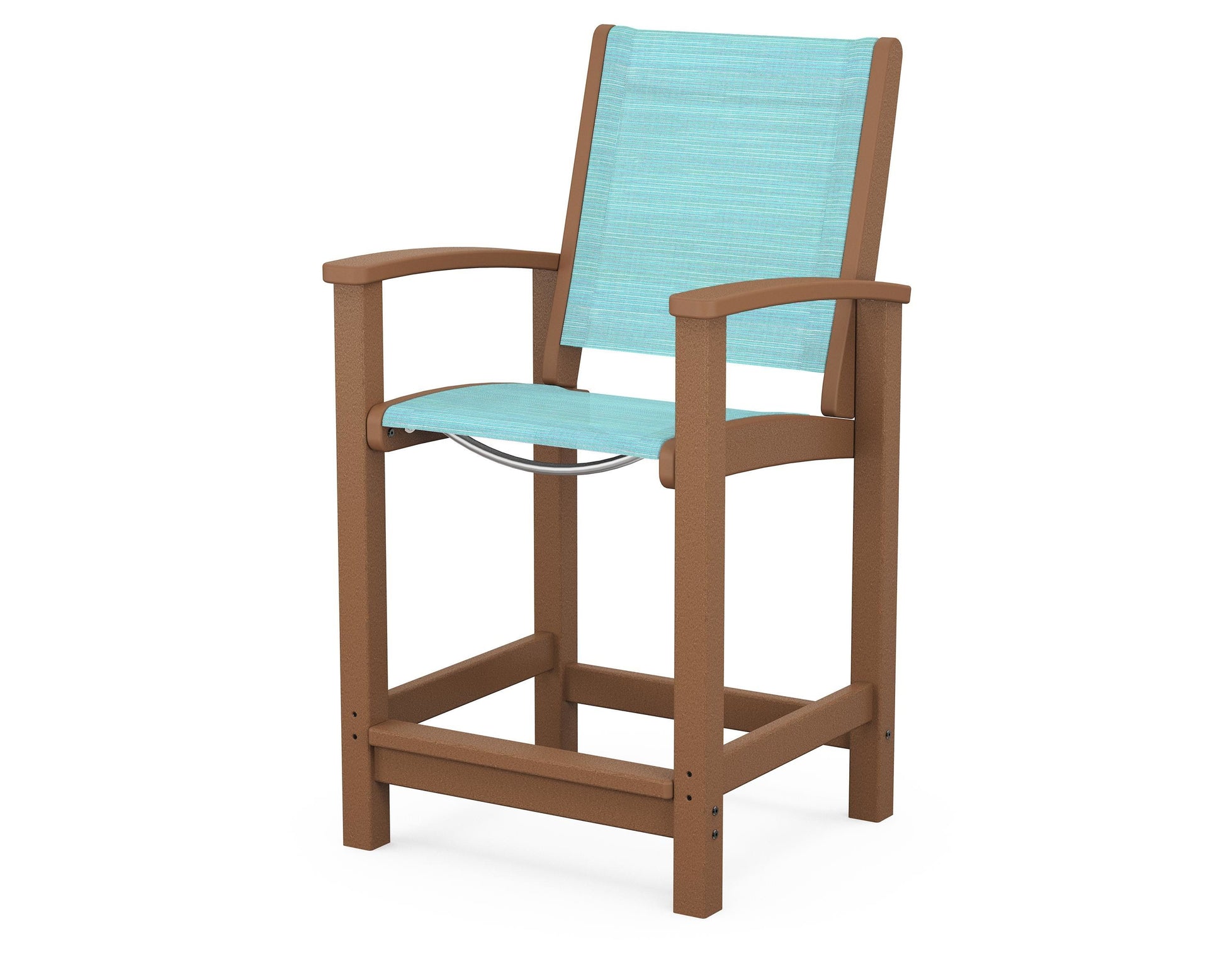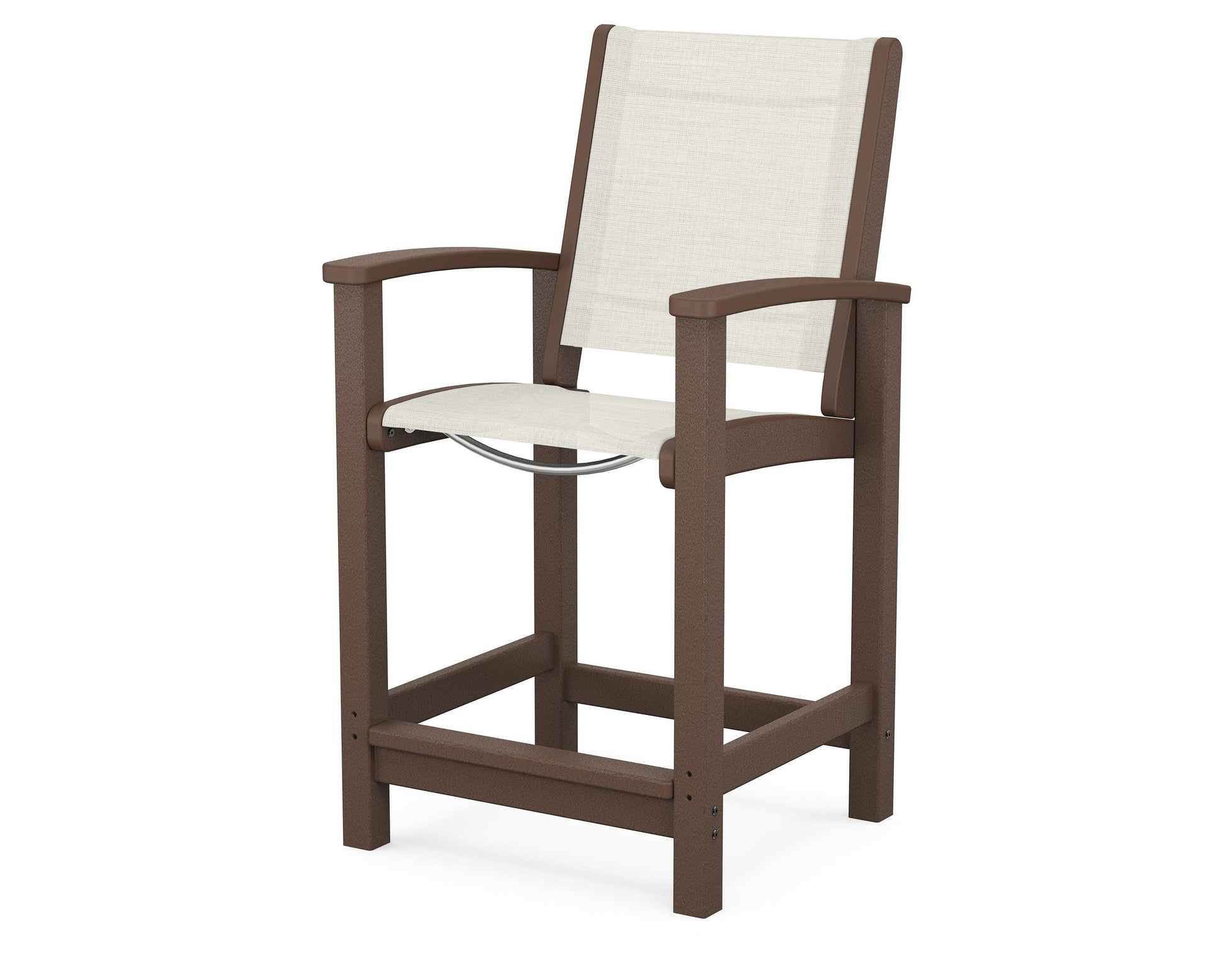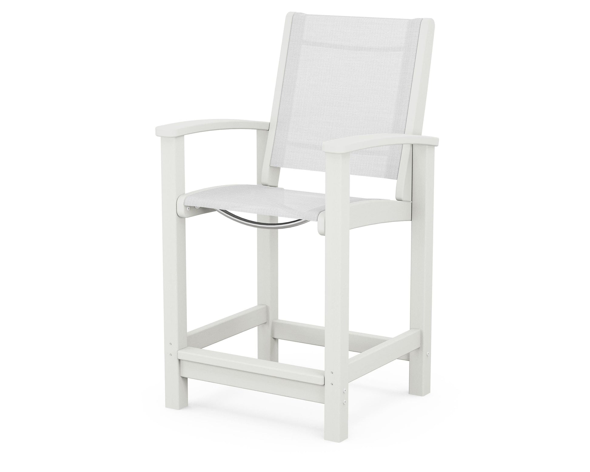 Sit back and relax in the Coastal Counter Arm Chair. This contemporary counter-height chair is available in a variety of attractive, fade-resistant frame colors paired with comfortable, all-weather sling. Not only will you enjoy the comfort of this stylish chair, but you'll love how easy it is to keep clean. Constructed with genuine POLYWOOD lumber, you can enjoy the look of painted wood without the maintenance of natural wood. Not to mention, the heavy-duty sling fabric dries quickly after a rainstorm and is resistant to tearing, mildew, and fading.