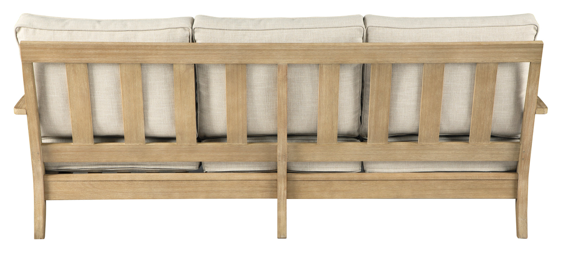 An effortlessly elegant choice in outdoor furniture, the Clare View outdoor sofa marries sturdiness and style in such a delightful way. For that much more weather protection, the sofa’s eucalyptus wood frame with tapered touches and slat styling is treated to a 5-step finishing process. Sumptuously soft yet remarkably durable, the included cushions and colorful throw pillows are wrapped in a high-performing, low-maintenance Nuvella® fabric you’re sure to love.- Made of eucalyptus wood