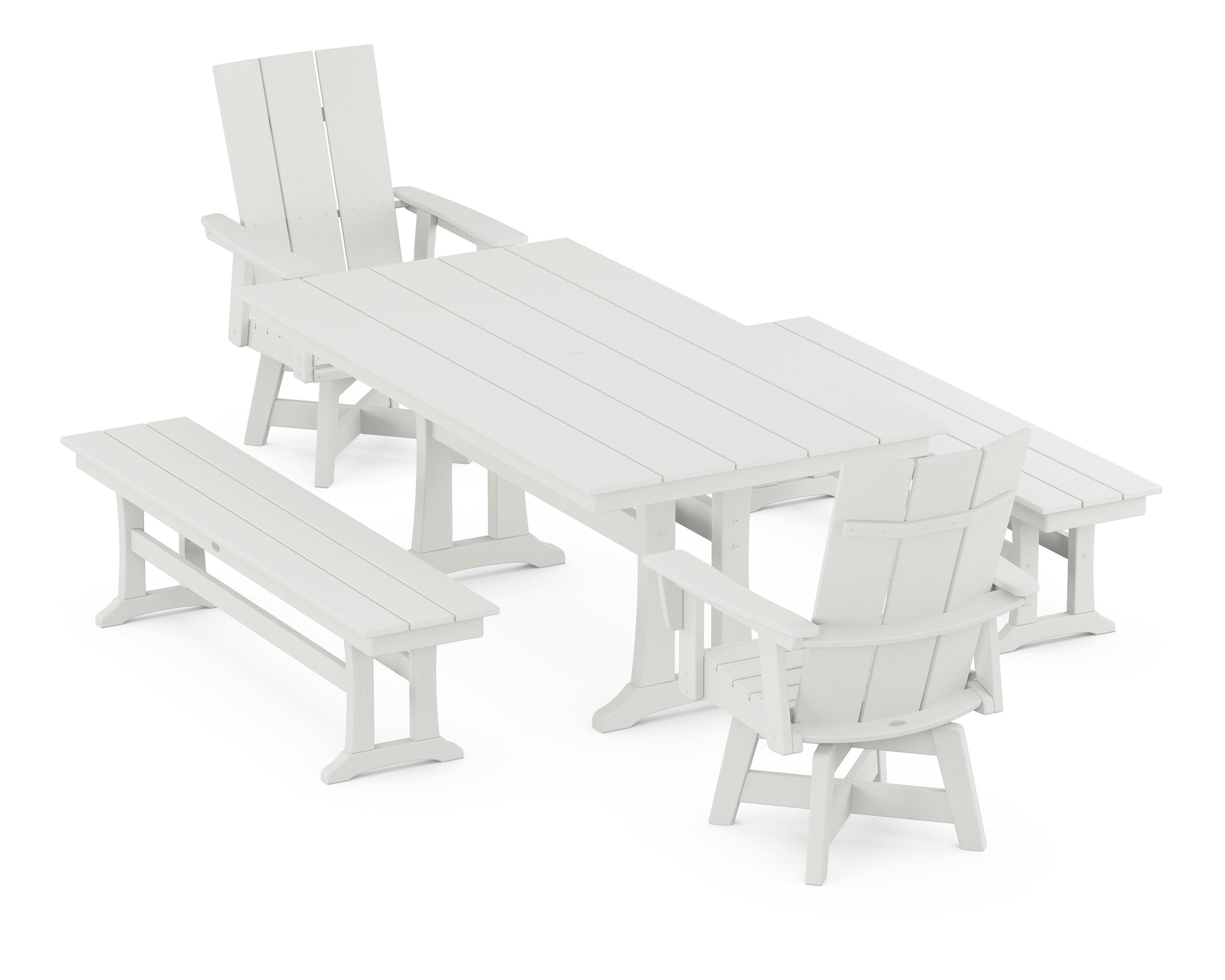 The Modern Curveback Adirondack Swivel Chair 5-Piece Farmhouse Dining Set With Trestle Legs and Benches offers comfortable seating around a sleek, plank-style table. Set out a charcuterie board, invite your best friends over, and savor more moments together?this all-weather set serves as the perfect backdrop for casual outdoor entertaining.