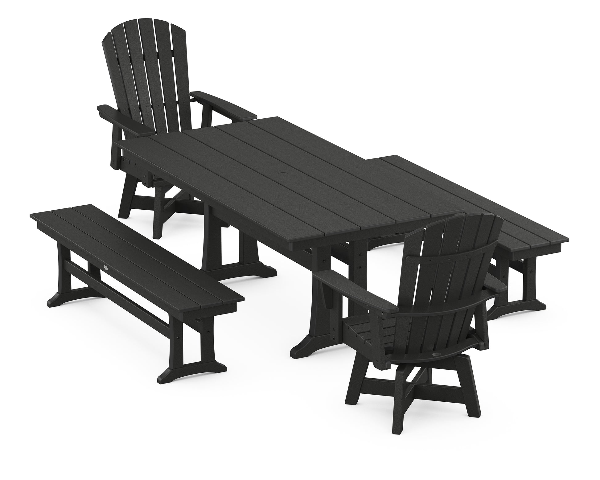 Get away in your own backyard with the Nautical Collection. Offering a marina-inspired aesthetic with its signature curved headboards and reclined profiles, every piece is designed to stand out on any deck. Bring the shore to your outdoors with the all-weather Nautical Curveback Adirondack Swivel Chair 5-Piece Farmhouse Dining Set With Trestle Legs and Benches, a family-friendly setup with mixed seating styles.