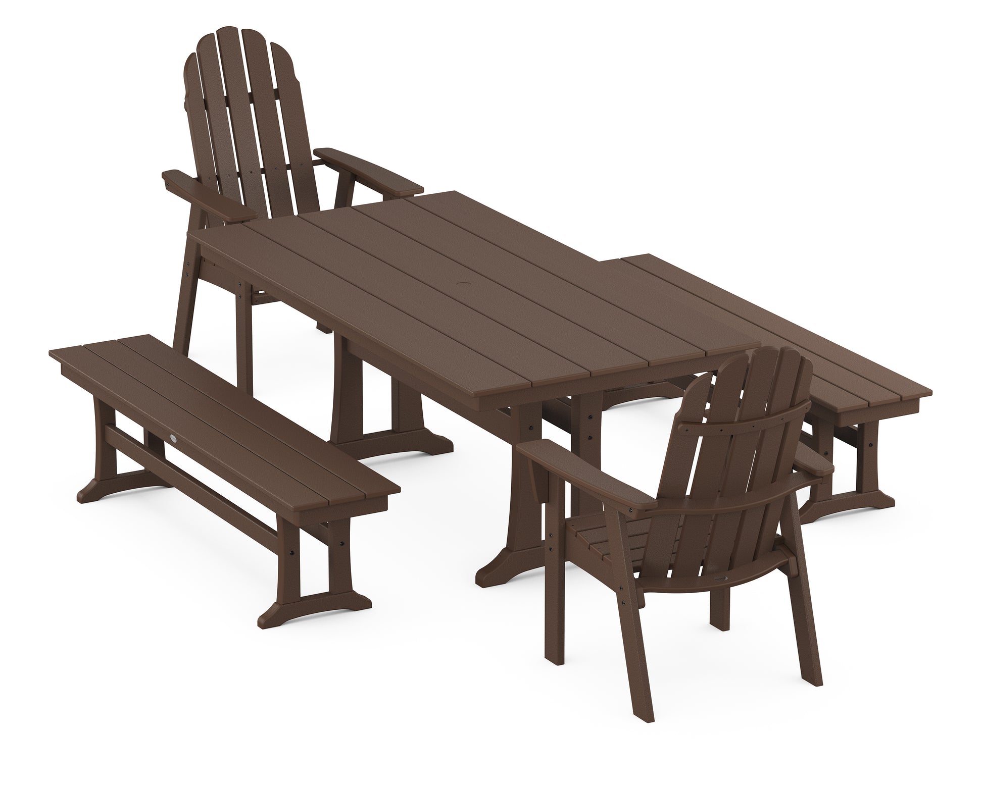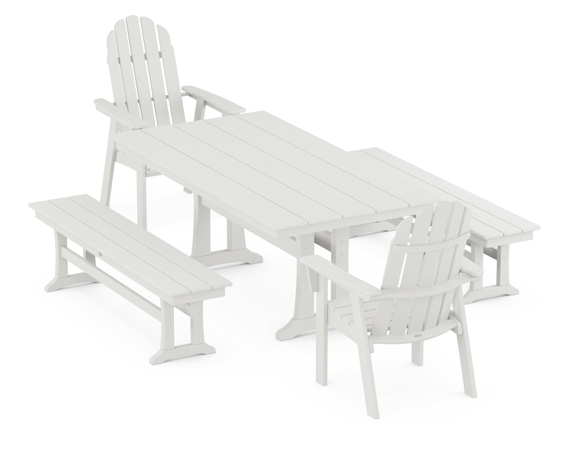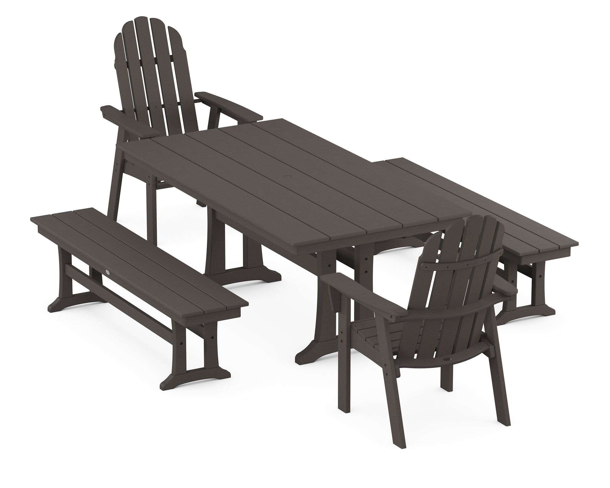 These enduring designs balance classic style with supportive, stay-all-day comfort, encouraging lingering conversations and more meals al fresco. Ideal for larger gatherings, the Vineyard Adirondack 5-Piece Farmhouse Dining Set With Trestle Legs includes a rectangle dining table, two armchairs, and two benches. We'll raise a glass to that.