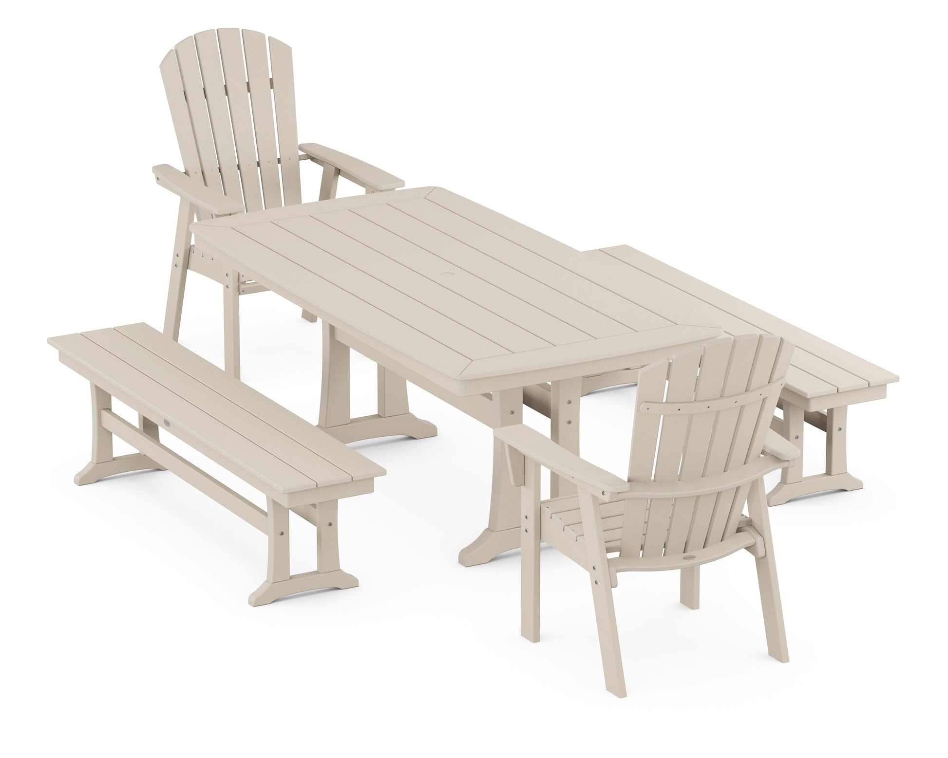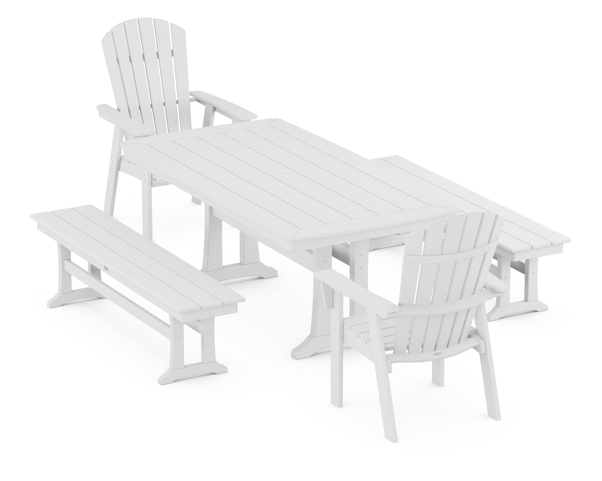 Get away in your own backyard with the Nautical Collection. Offering a marina-inspired aesthetic with its signature curved headboards and reclined profiles, every piece is designed to stand out on any deck. Bring the shore to your outdoors with the all-weather Nautical Adirondack 5-Piece Dining Set with Trestle Legs ? two armchairs and two benches surrounding a rectangle dining table.