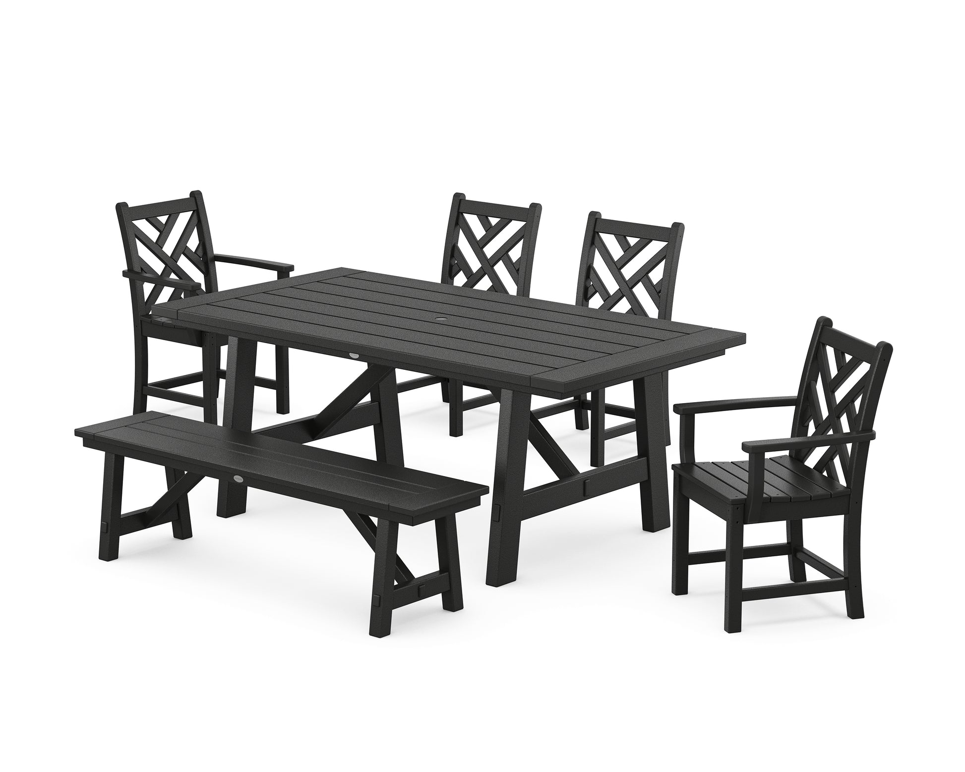 Inspired by the iconic English furniture design of the 18th century, Chippendale's elaborate yet inviting all-weather pieces allow you to transform any area into a stylish social setting. Distinctive details and intricate patterns add sophistication to your space, while well-placed contours invite loved ones to linger a little longer. The Chippendale 6-Piece Rustic Farmhouse Dining Set With Bench makes outdoor entertaining seamless, with its spacious rectangle dining table surrounded by two side chairs, two armchairs, and a bench.