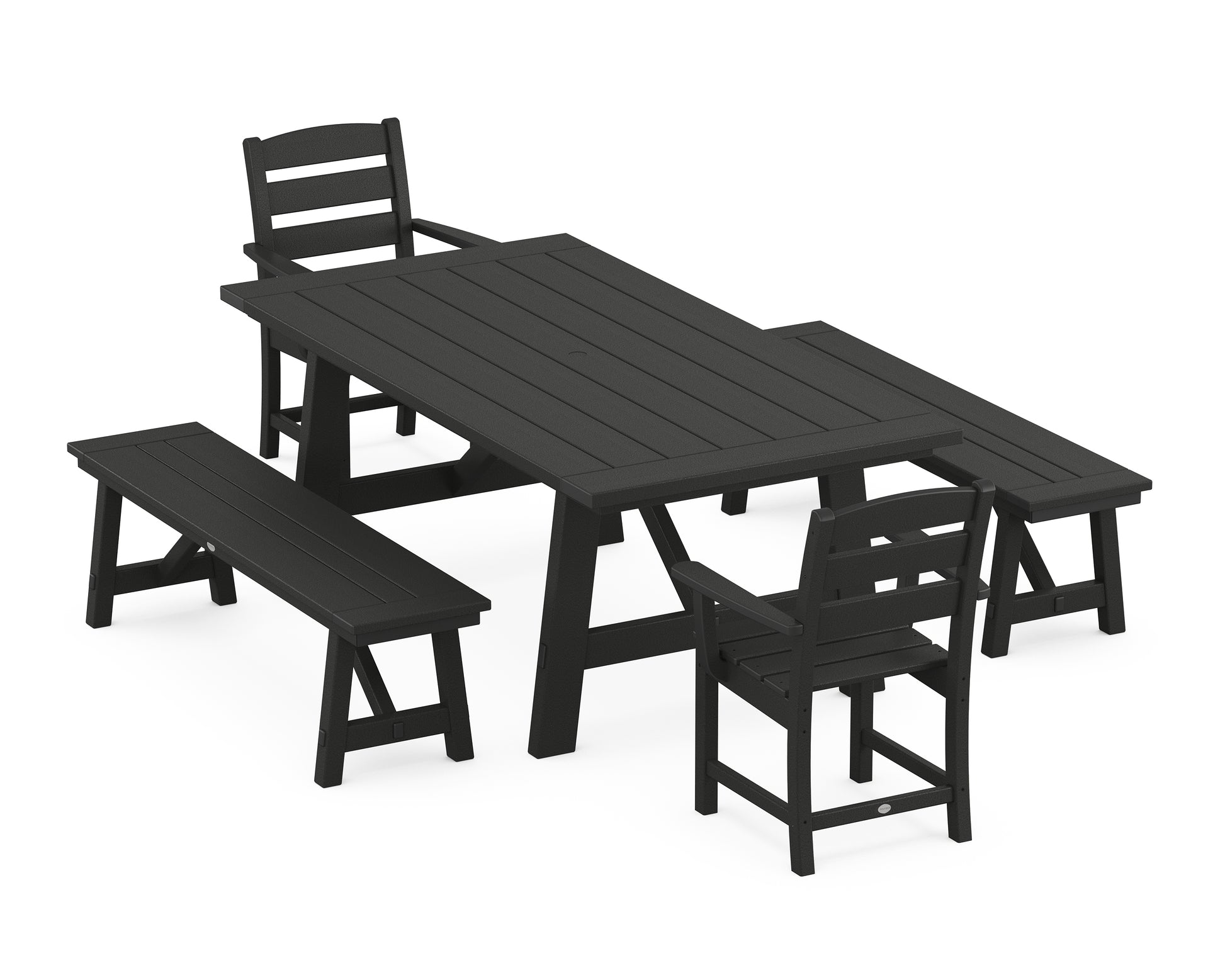 Made for comfort and four-season durability, our Lakeside Collection does outdoor entertaining flawlessly—whether you're hosting summertime barbecues or sipping coffee with friends on a crisp, quiet morning. Highlighted by subtle curves and clean lines, every piece brings the relaxing ambiance of lakeshore living to your backyard. Gather everyone around the all-weather Lakeside 5-Piece Rustic Farmhouse Dining Set With Benches, a dynamic design pairing that includes two armchairs and two benches sitting pretty around a rectangle dining table.