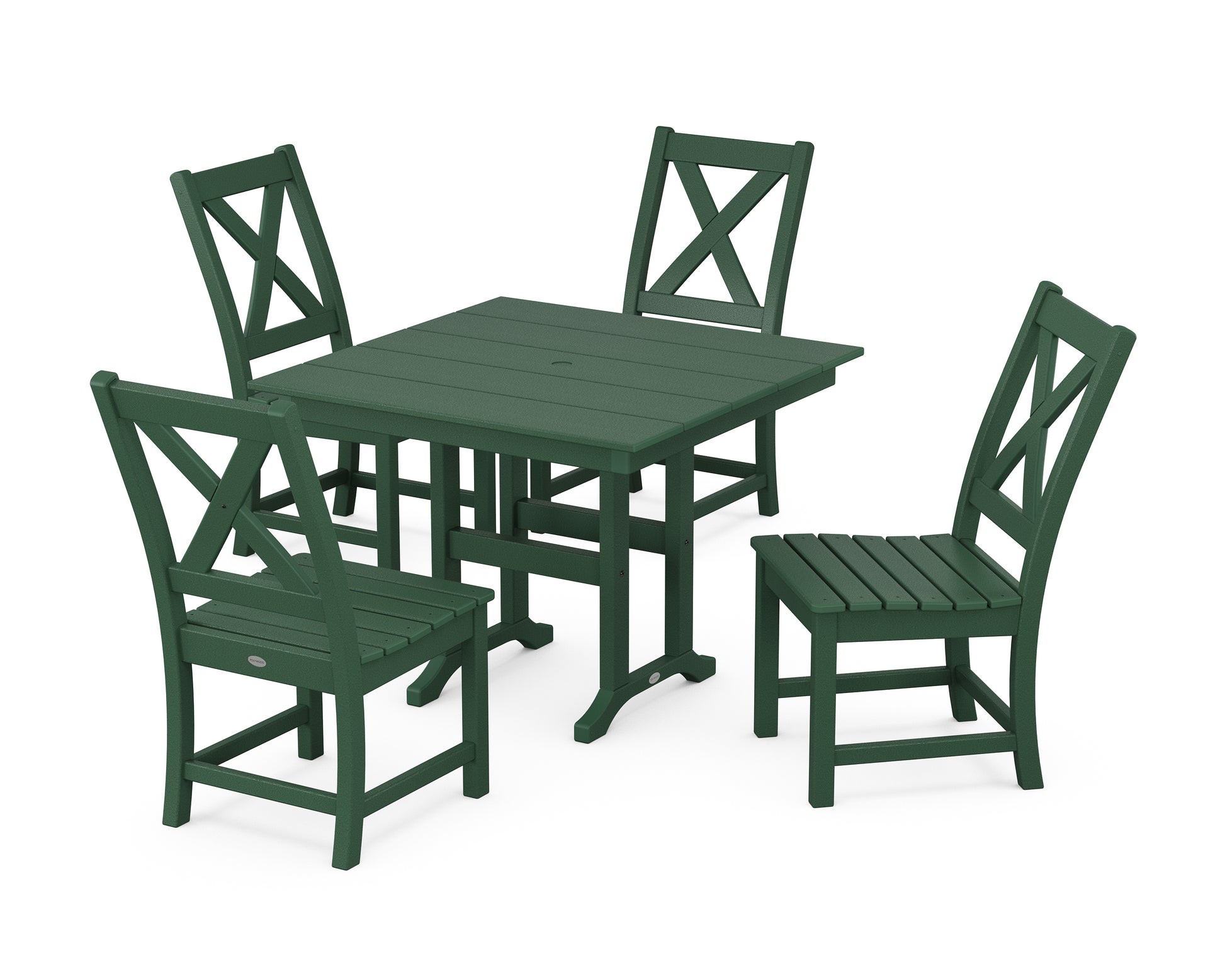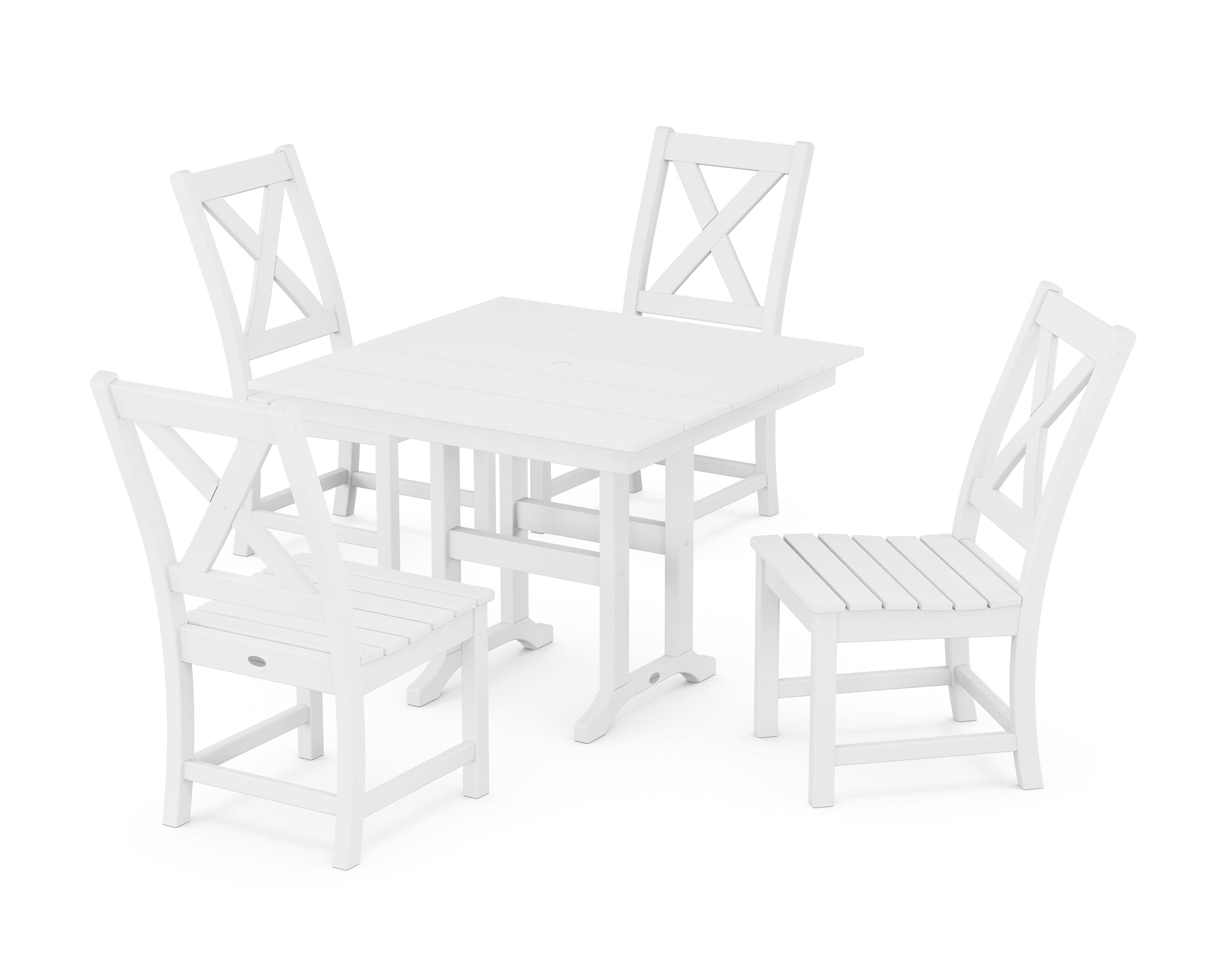 A blend of modern design and rustic elements, the Braxton Collection is always a conversation starter. Forever in season and forever in style, this all-weather collection finds its balance with clean lines, curved profiles, and farmhouse-inspired x-back design. Set an inviting dinner scene for family and friends with our Braxton Side Chair 5-Piece Farmhouse Dining Set, shown here with four side chairs sitting pretty around a square dining table.