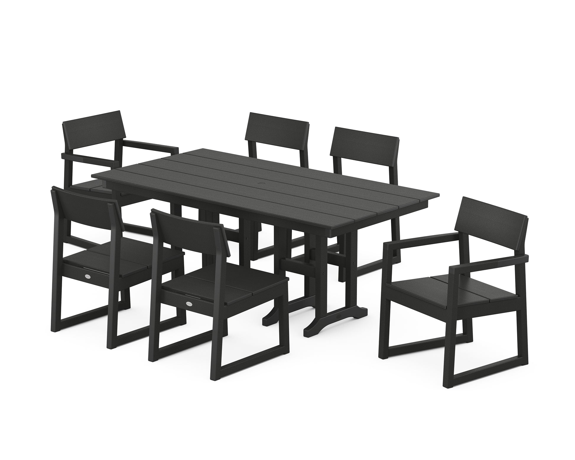 The EDGE Collection merges minimalism with sustainable design, creating all-weather furniture that leaves a lasting impression. With options sized just right for any layout, our modern outdoor dining collection seats everyone comfortably, whether you're hosting dinner on a spacious patio or an intimate balcony. The sleek EDGE 7-Piece Farmhouse Dining Set includes one rectangle table, four side chairs, and two armchairs that boast wide seats and gently contoured backrests.