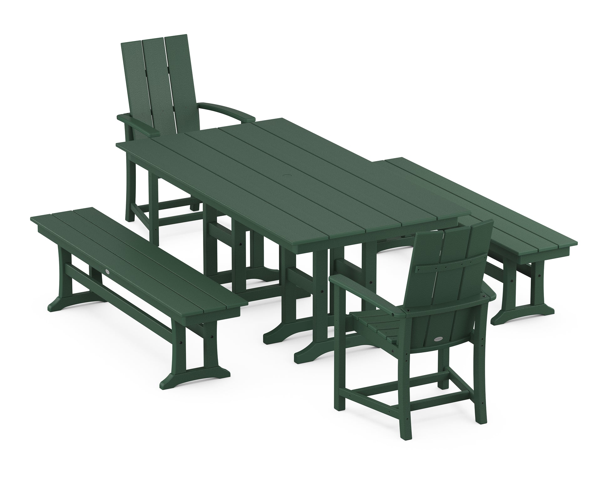 Our best-selling Modern Adirondack Collection reimagines an iconic design in clean, symmetrical lines inspired by minimalist style. The Modern Adirondack 5-Piece Farmhouse Dining Set with Benches offers comfortable seating around a plank-style table. Set out a charcuterie board, invite the friend group over, and savor more moments together?this all-weather set serves as the perfect backdrop for casual outdoor entertaining.