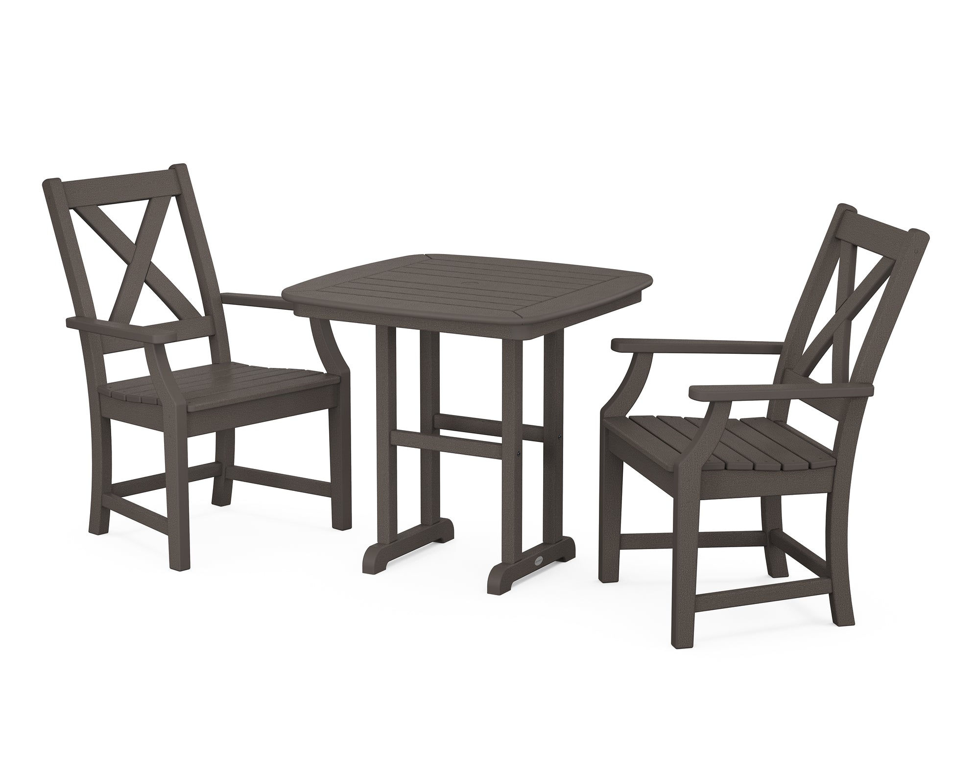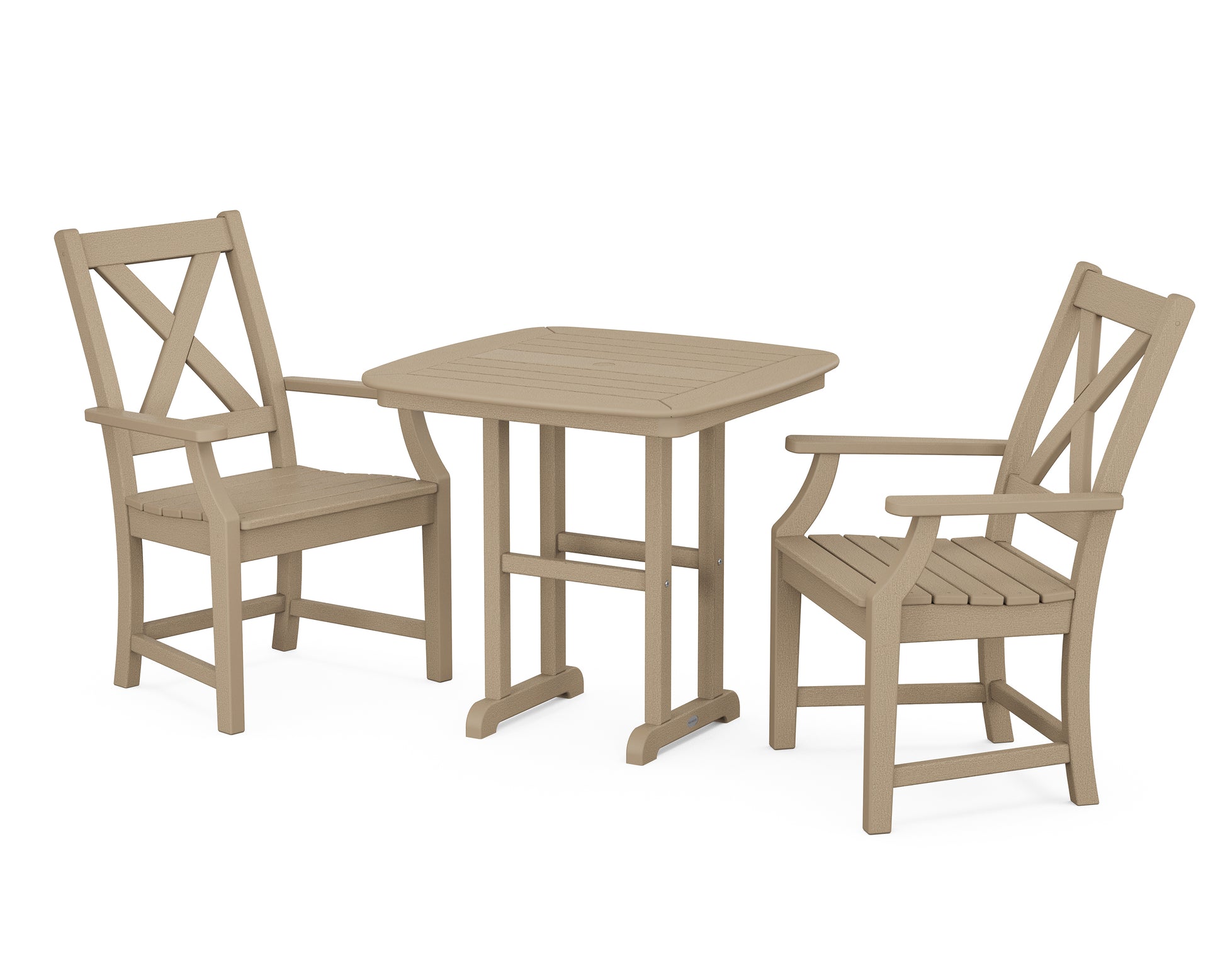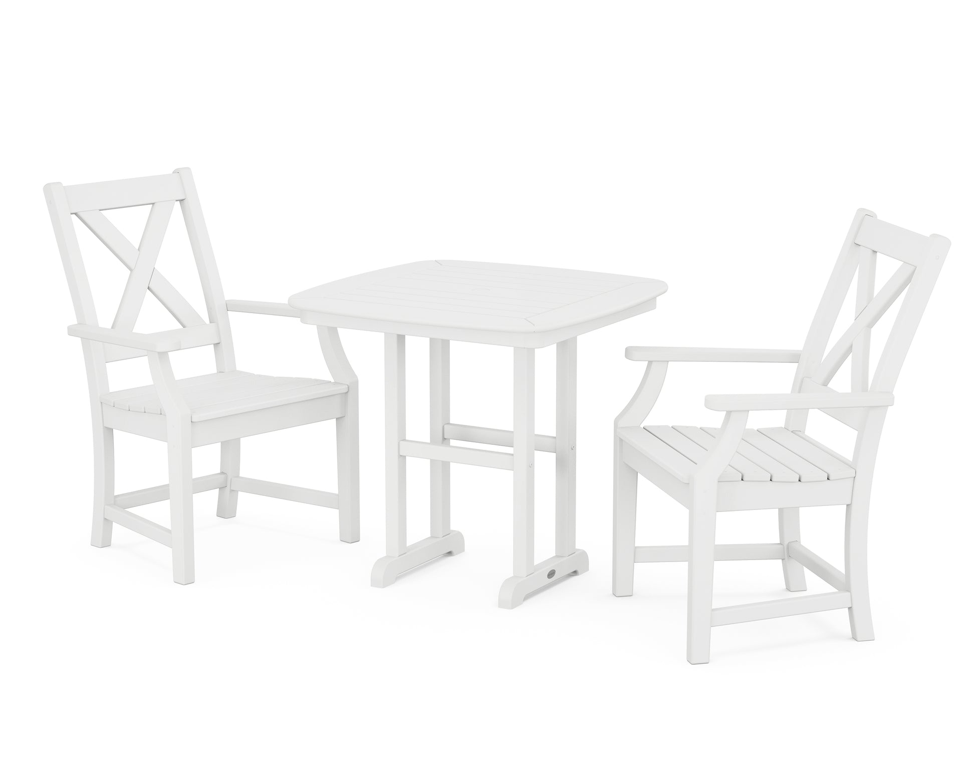 A blend of modern design and rustic elements, the Braxton Collection is always a conversation starter. Forever in season and forever in style, this all-weather collection finds its balance with clean lines, curved profiles, and farmhouse-inspired x-back design. Set an inviting dinner scene for family and friends with our Braxton 3-Piece Dining Set, shown here with two armchairs sitting pretty around a square dining table.