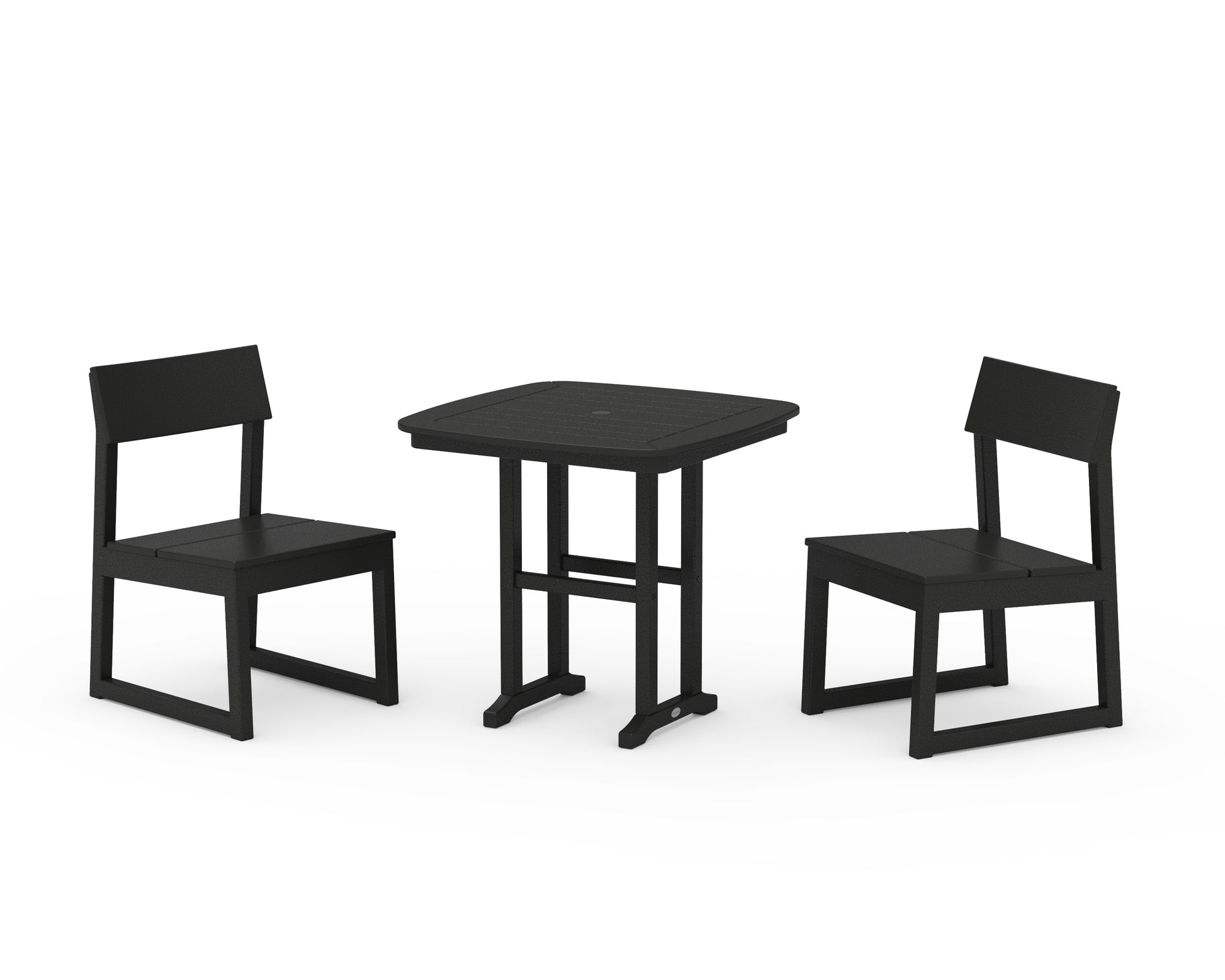 The EDGE Collection merges minimalism with sustainable design, creating all-weather furniture that leaves a lasting impression. With options sized just right for any layout, our modern outdoor dining collection seats everyone comfortably, whether you're hosting dinner on a spacious patio or an intimate balcony. The sleek EDGE Side Chair 3-Piece Dining Set includes one square table and two side chairs that boast wide seats and gently contoured backrests.