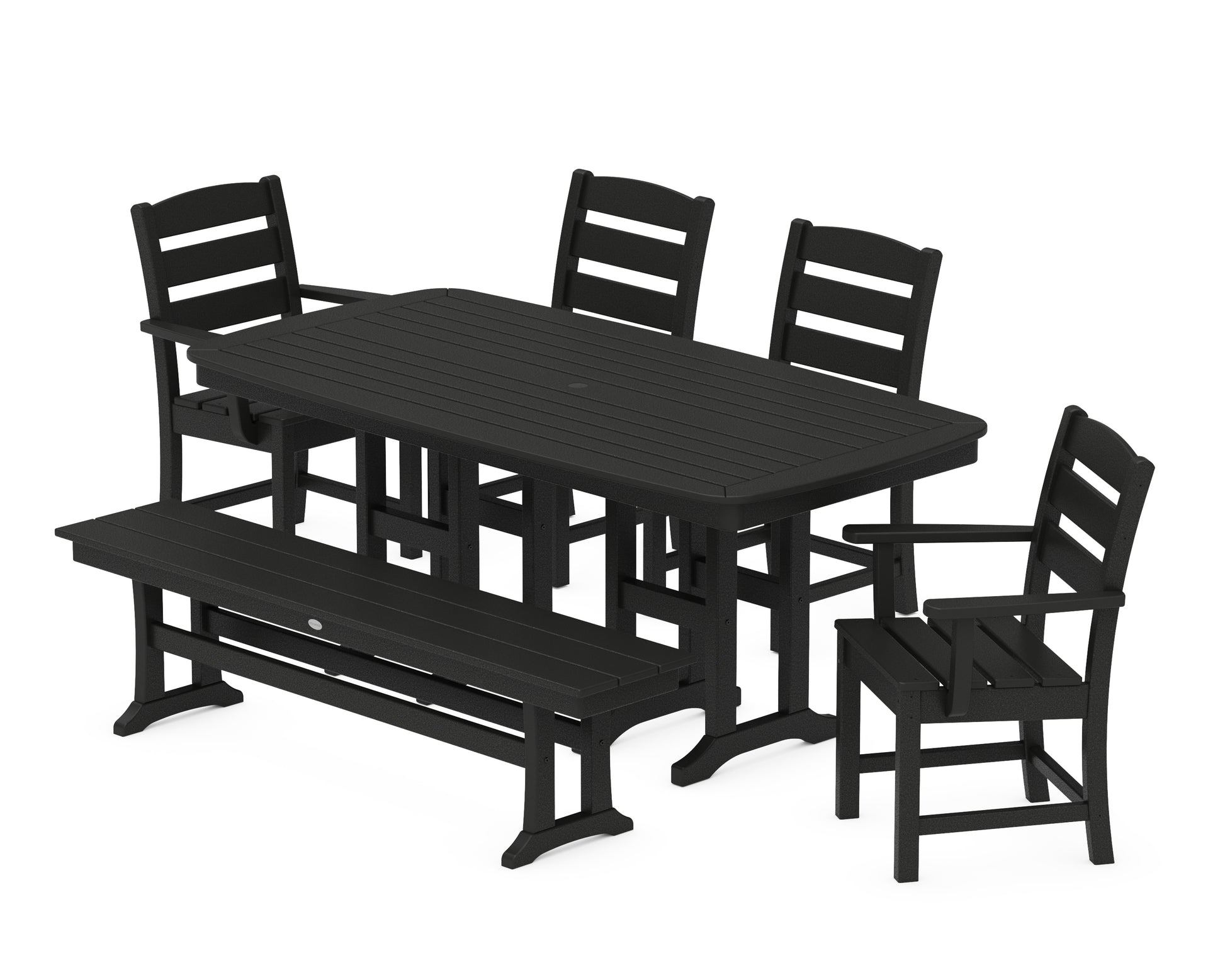 Made for comfort and four-season durability, our Lakeside Collection does outdoor entertaining flawlessly—whether you're hosting summertime barbecues or sipping coffee with friends on a crisp, quiet morning. Highlighted by subtle curves and clean lines, every piece brings the relaxing ambiance of lakeshore living to your backyard. Gather everyone around the all-weather Lakeside 6-Piece Dining Set with Bench, a dynamic design pairing that includes two side chairs, two armchairs, and a bench sitting pretty around a rectangle dining table.