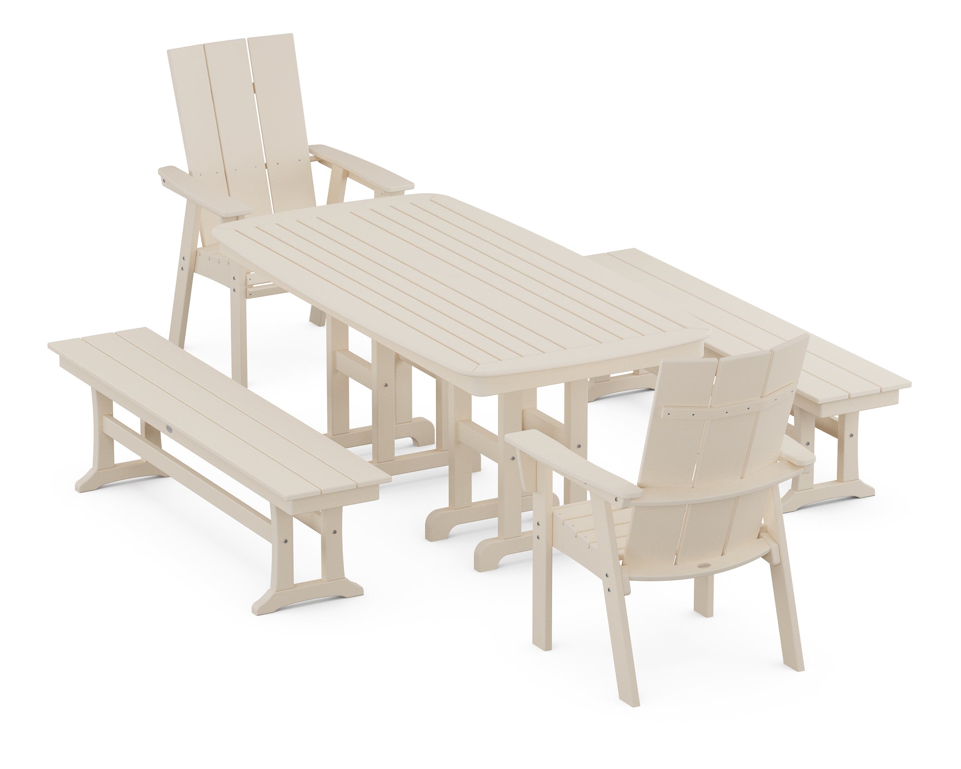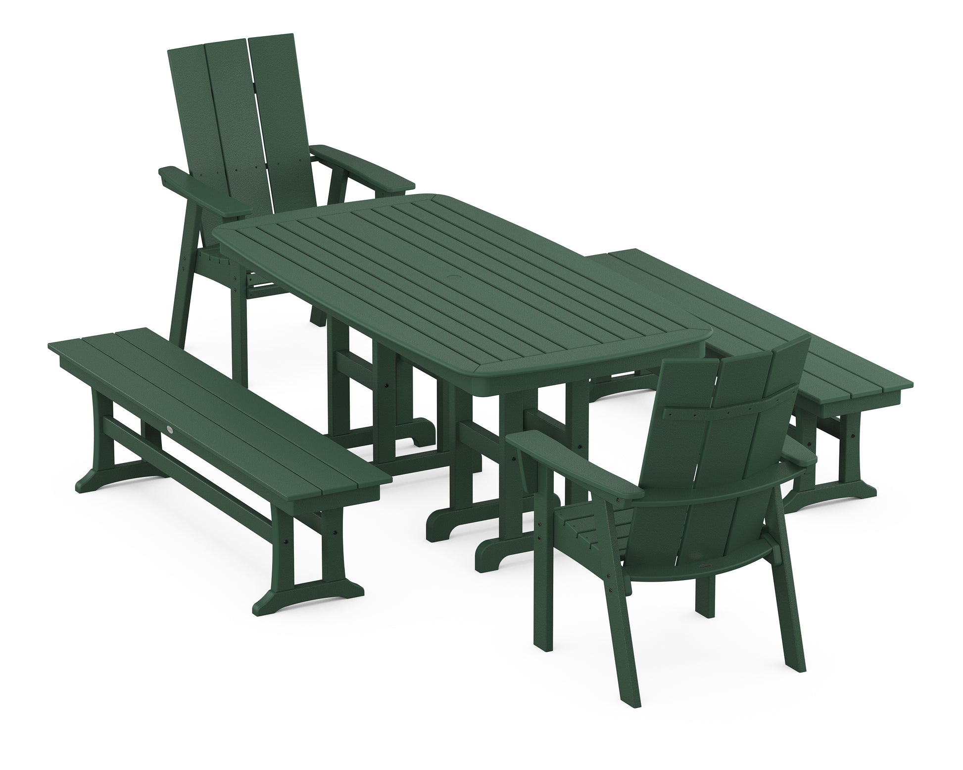 The Modern Curveback Adirondack 5-Piece Dining Set with Benches offers comfortable seating around a spacious, spill-proof table. Set out a charcuterie board, invite your best friends over, and savor more moments together?this all-weather set serves as the perfect backdrop for casual outdoor entertaining.