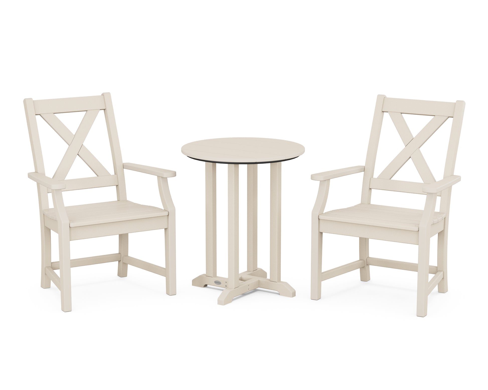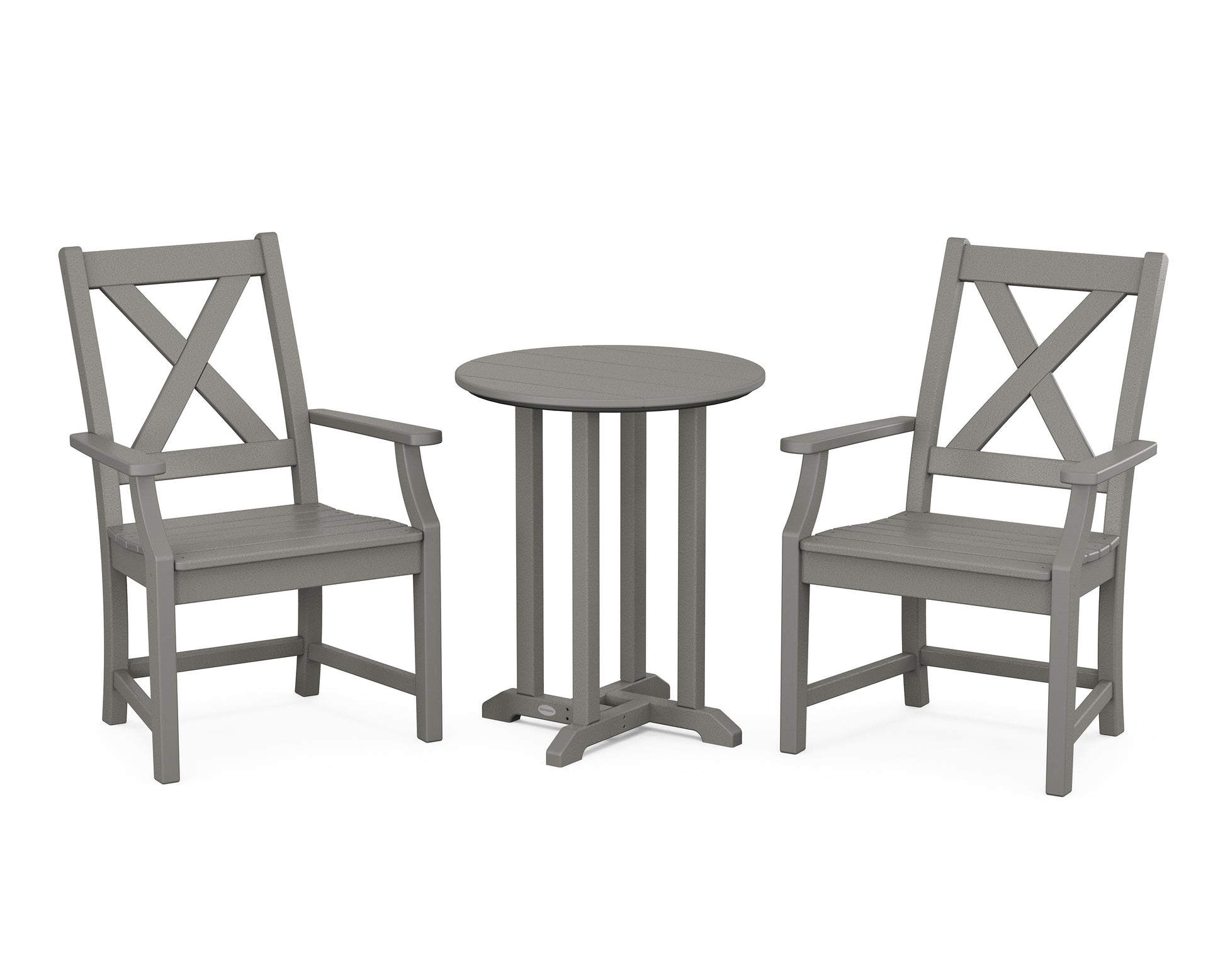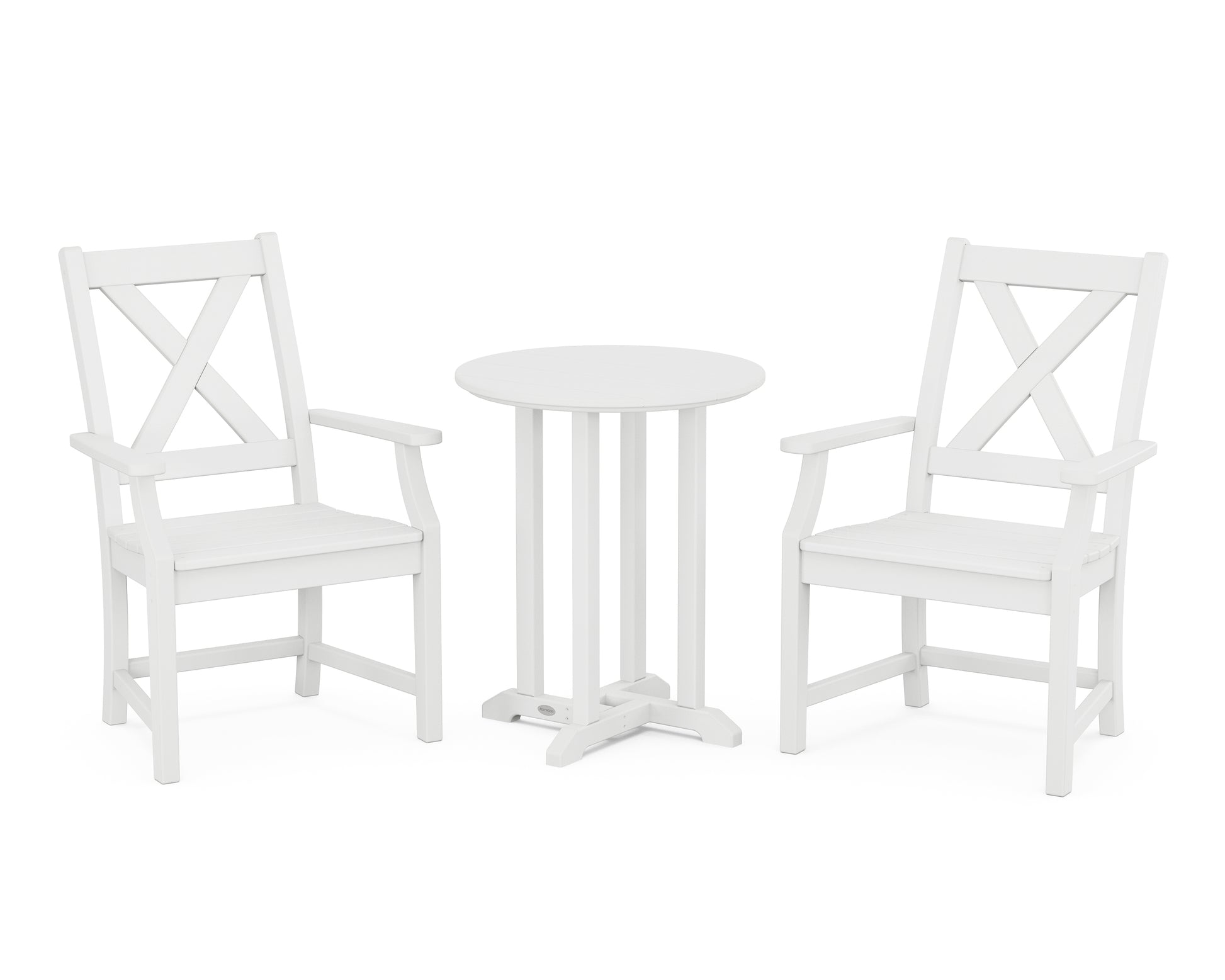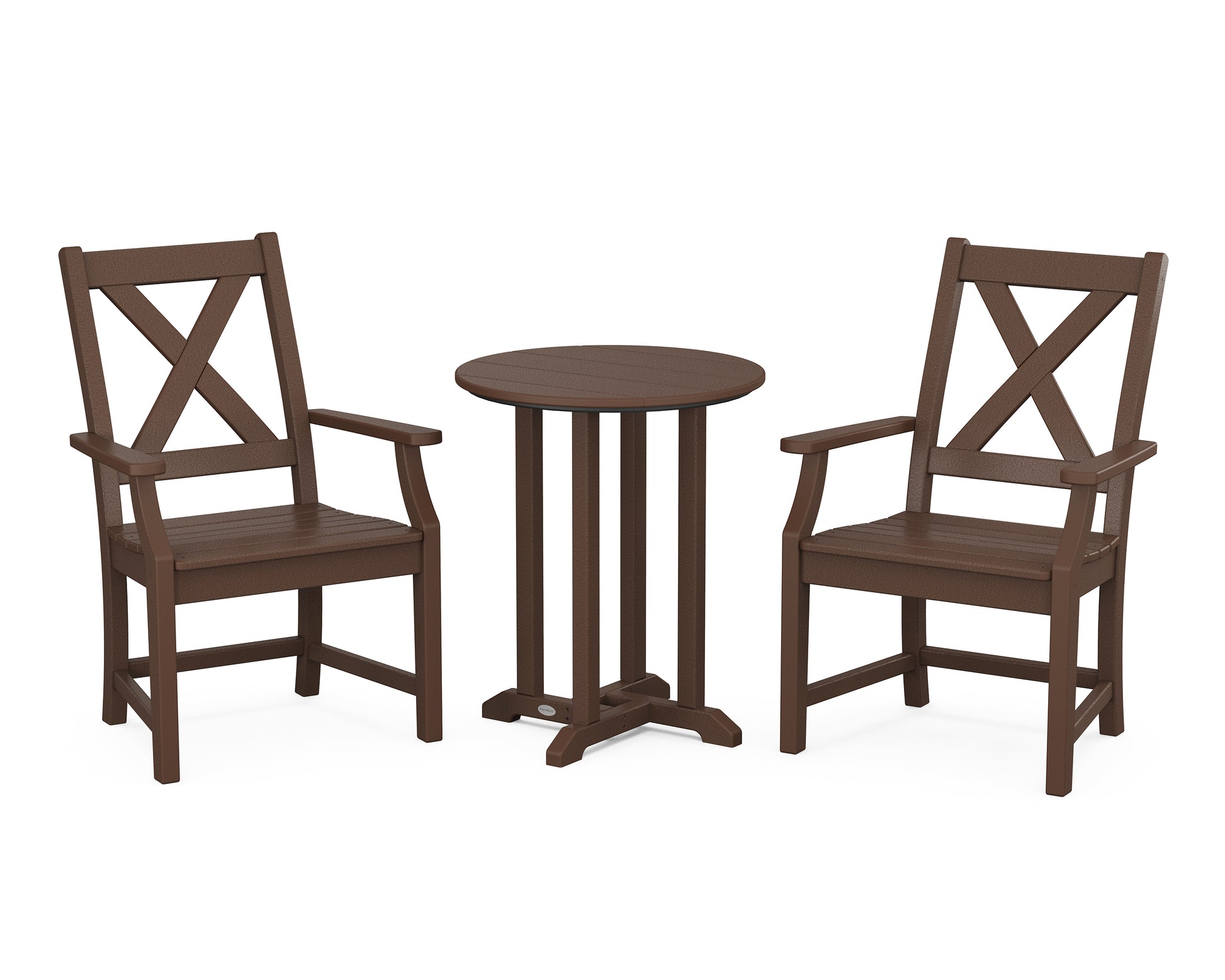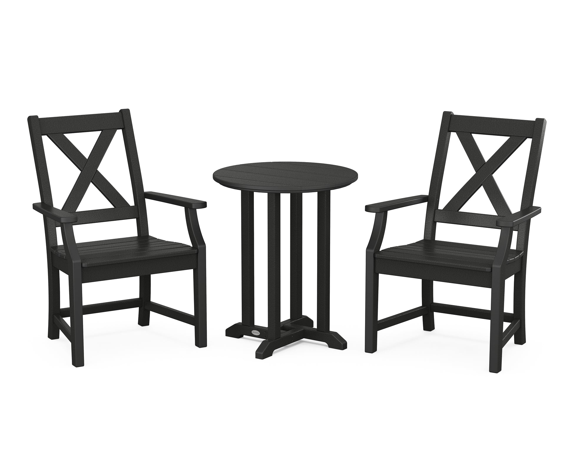 A blend of modern design and rustic elements, the Braxton Collection is always a conversation starter. Forever in season and forever in style, this all-weather collection finds its balance with clean lines, curved profiles, and farmhouse-inspired x-back design. Set an inviting dinner scene for family and friends with our Braxton 3-Piece Round Bistro Dining Set, shown here with two armchairs sitting pretty around a round bistro table.