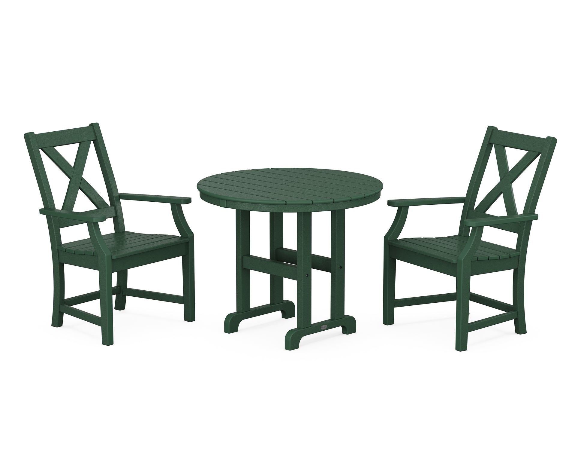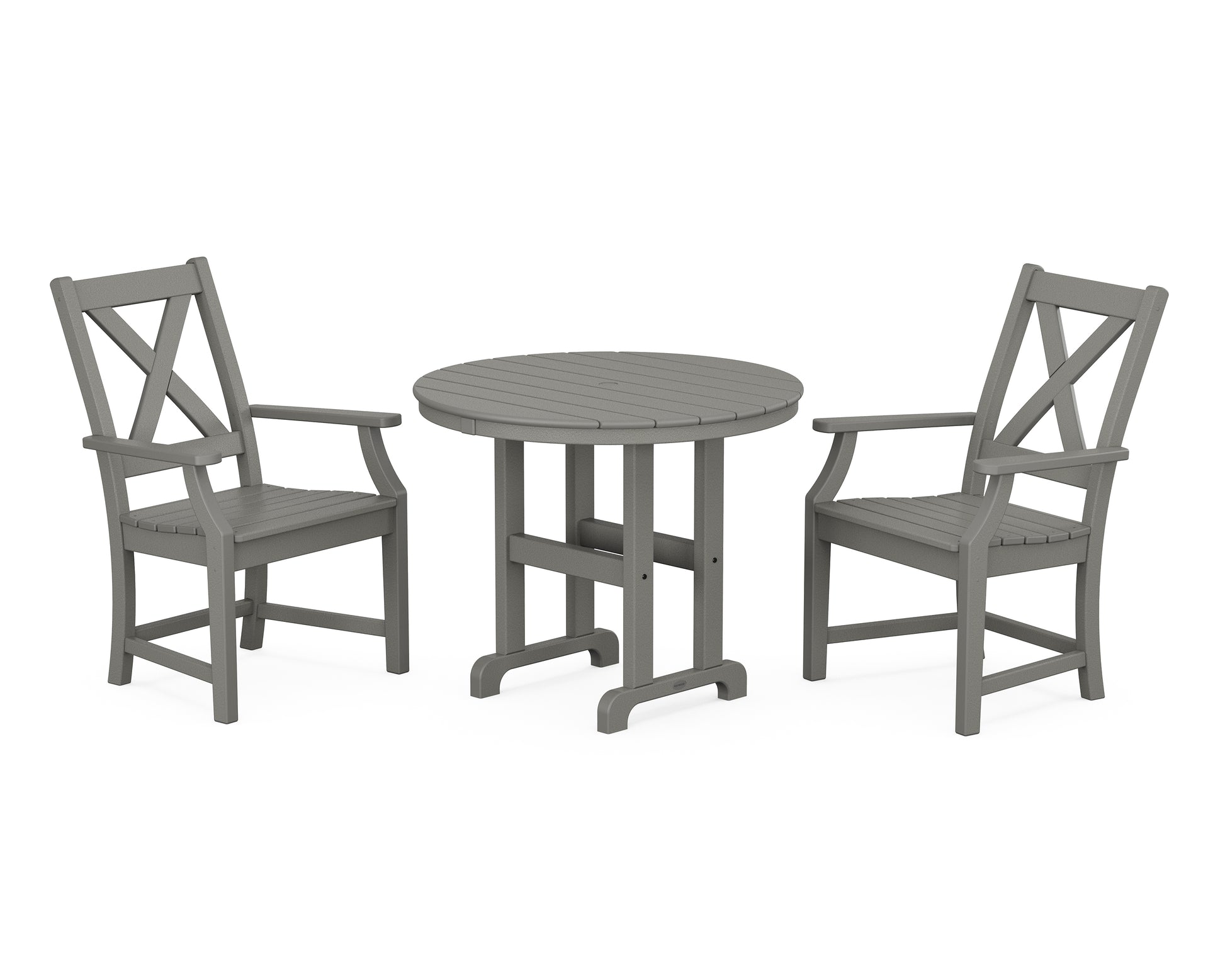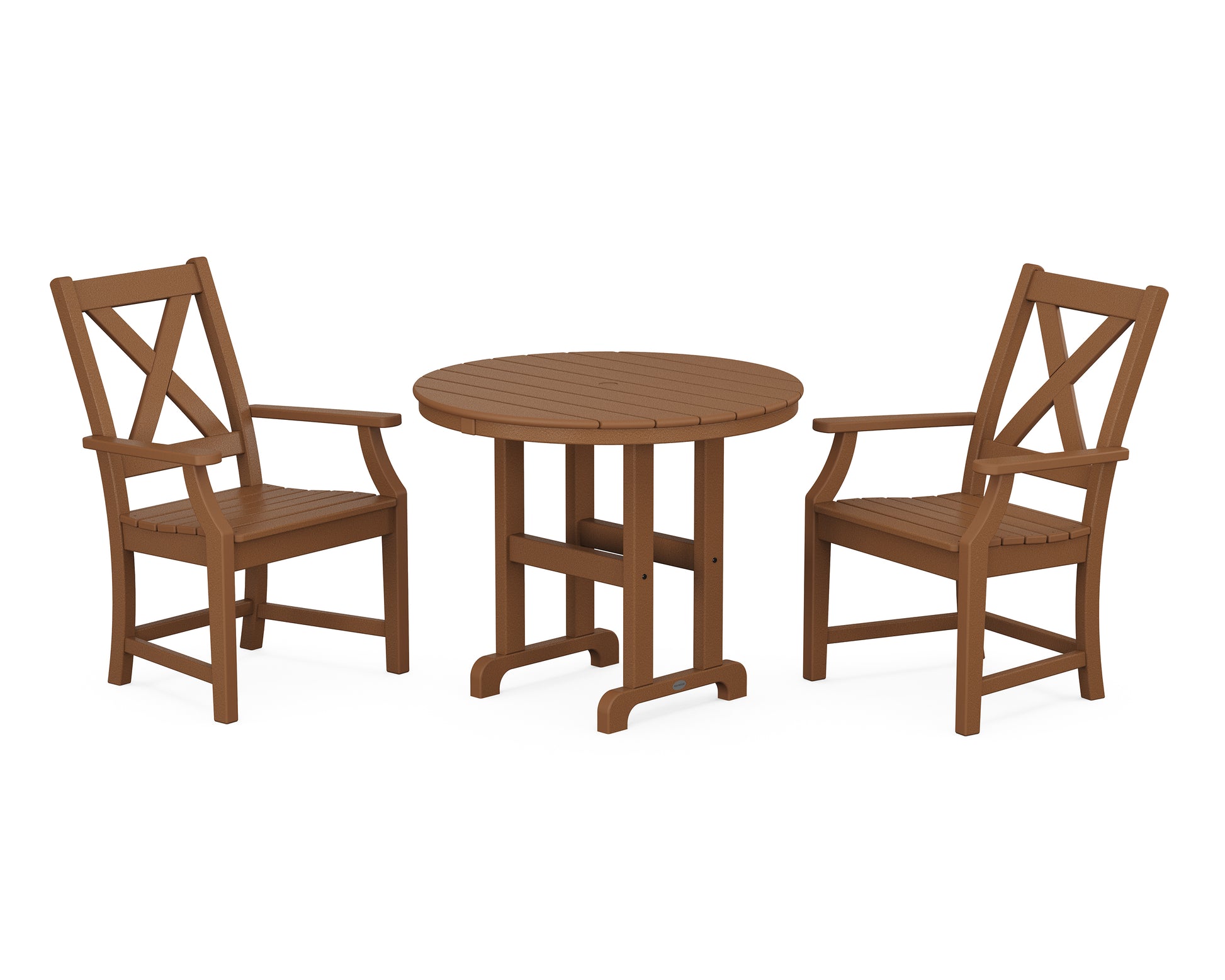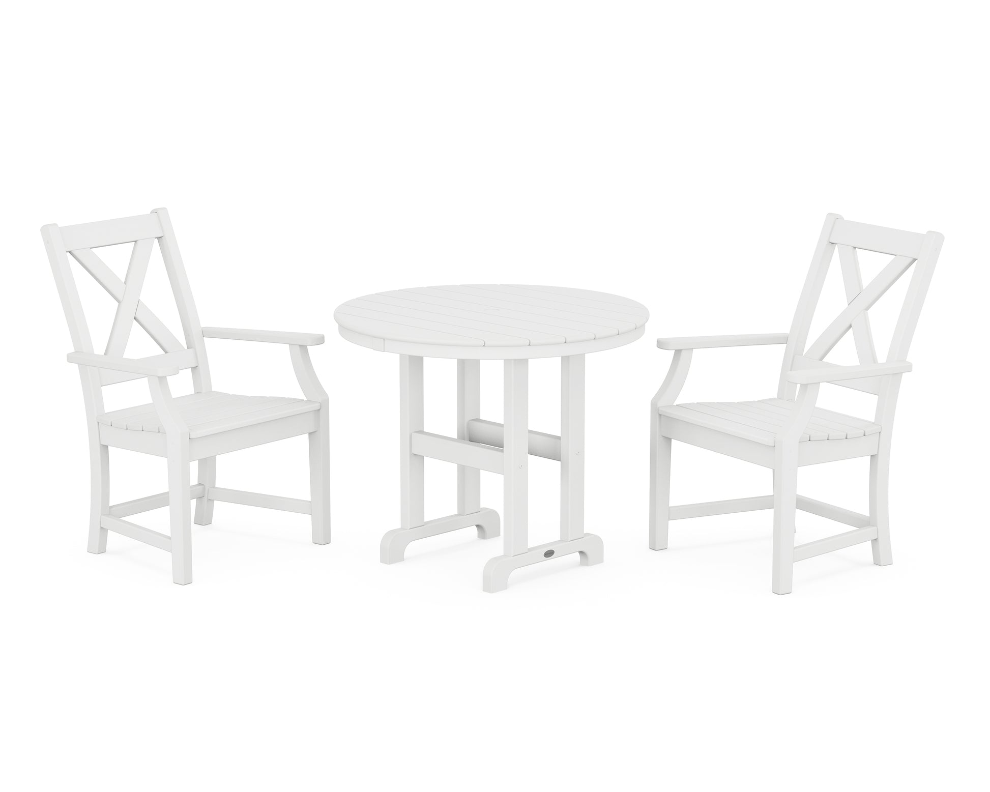 A blend of modern design and rustic elements, the Braxton Collection is always a conversation starter. Forever in season and forever in style, this all-weather collection finds its balance with clean lines, curved profiles, and farmhouse-inspired x-back design. Set an inviting dinner scene for family and friends with our Braxton 3-Piece Round Dining Set, shown here with two armchairs sitting pretty around a round dining table.