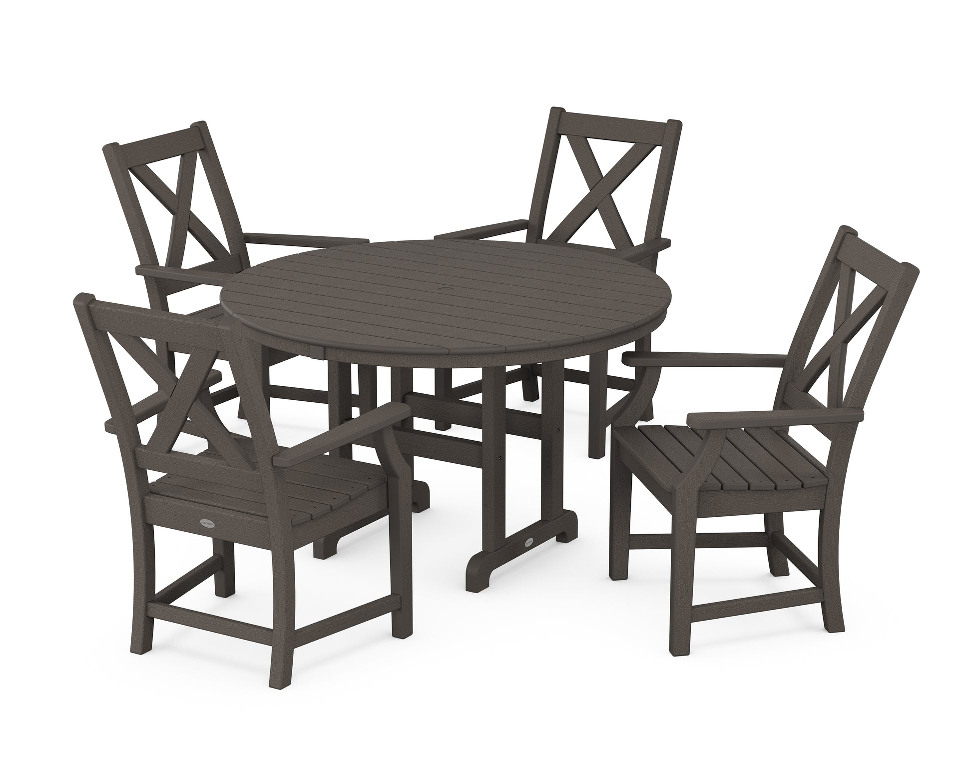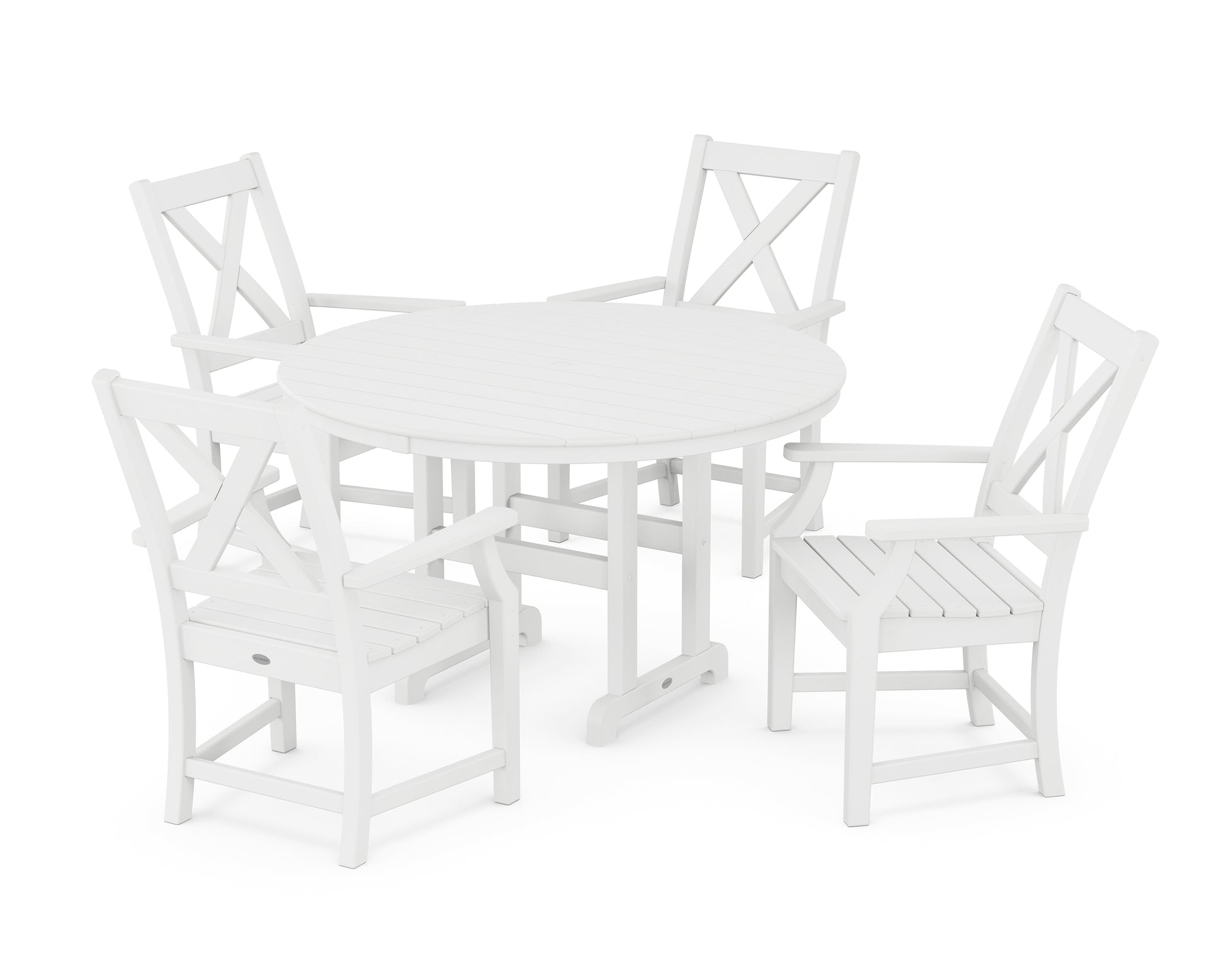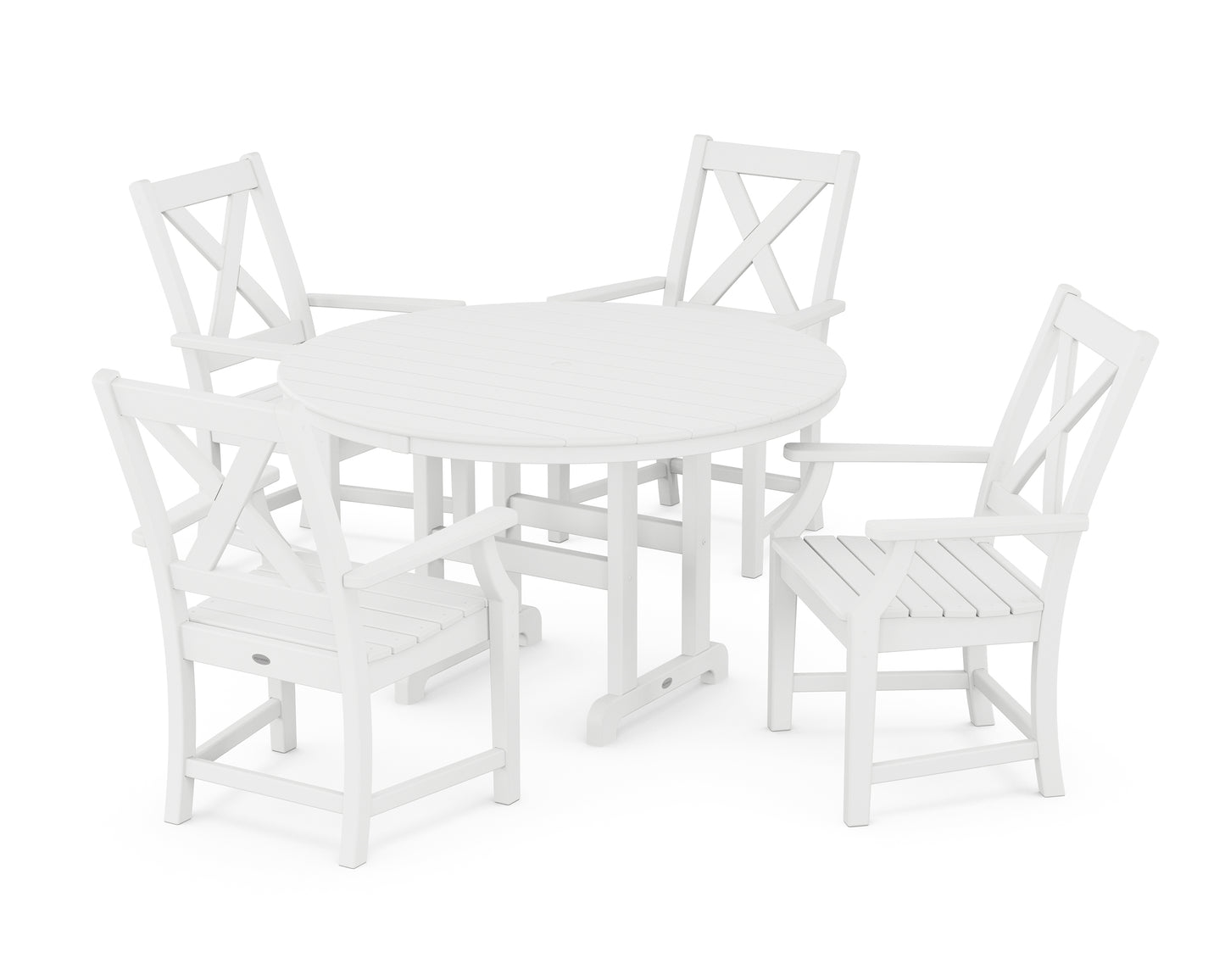 A blend of modern design and rustic elements, the Braxton Collection is always a conversation starter. Forever in season and forever in style, this all-weather collection finds its balance with clean lines, curved profiles, and farmhouse-inspired X-back design. Set an inviting dinner scene for family and friends with our Braxton 5-Piece Round Farmhouse Dining Set, shown here with four armchairs sitting pretty around a round dining table.