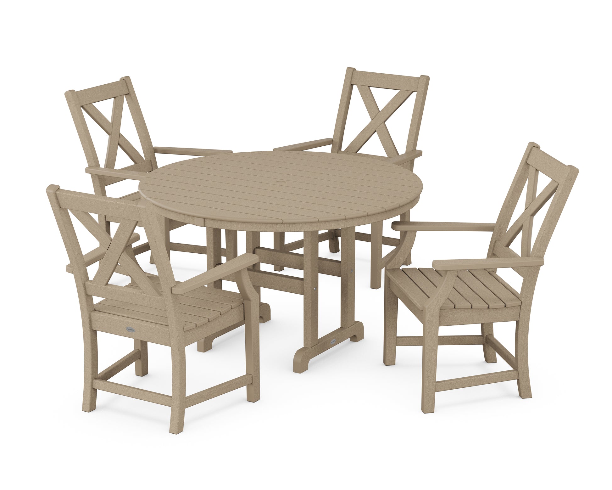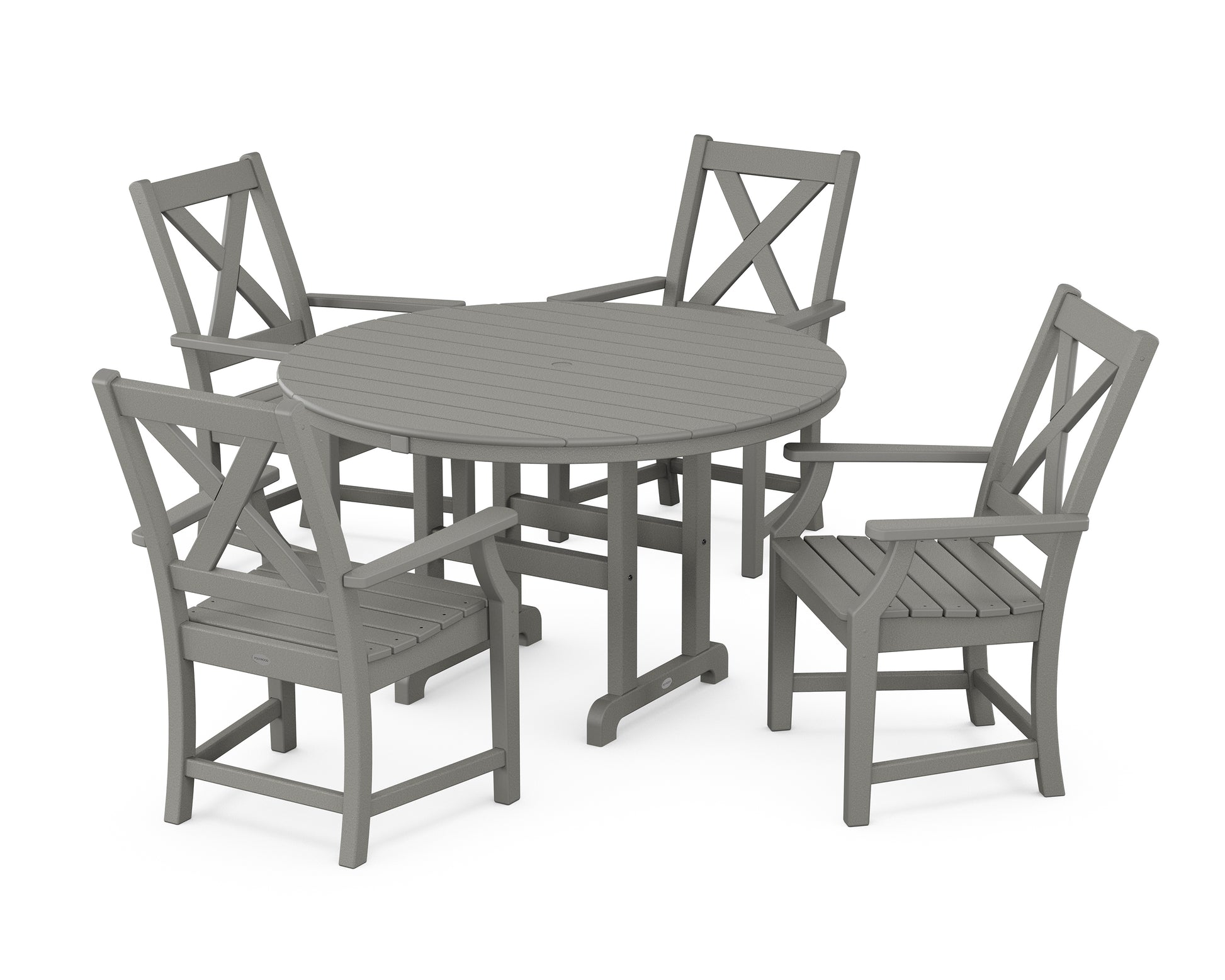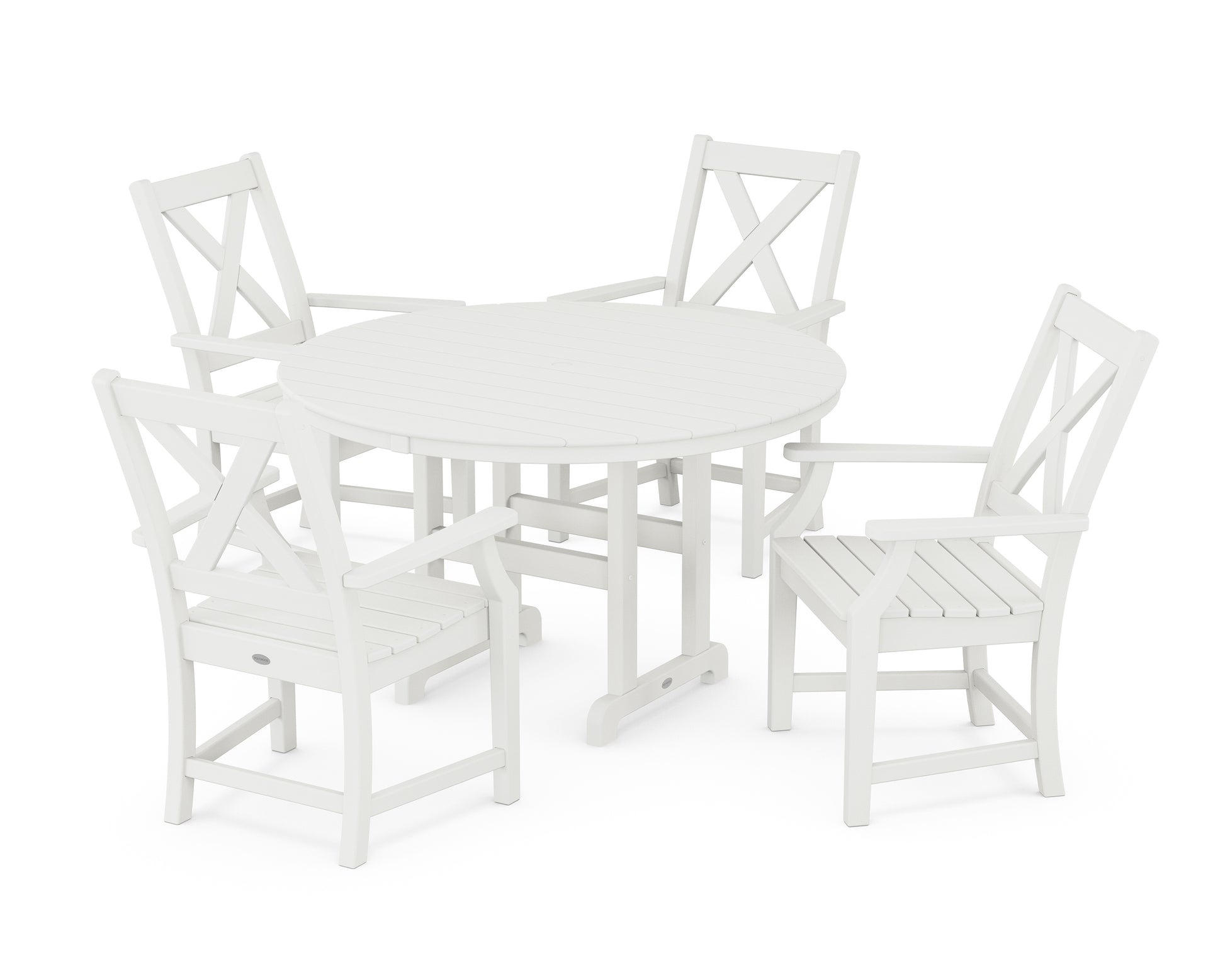 A blend of modern design and rustic elements, the Braxton Collection is always a conversation starter. Forever in season and forever in style, this all-weather collection finds its balance with clean lines, curved profiles, and farmhouse-inspired X-back design. Set an inviting dinner scene for family and friends with our Braxton 5-Piece Round Farmhouse Dining Set, shown here with four armchairs sitting pretty around a round dining table.