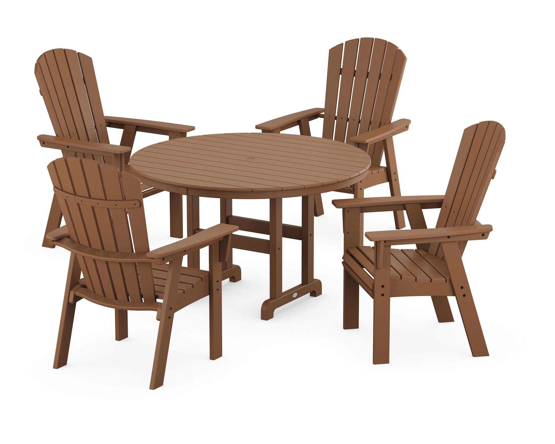 Get away in your own backyard with the Nautical Collection. Offering a marina-inspired aesthetic with its signature curved headboards and reclined profiles, every piece is designed to stand out on any deck. Bring the shore to your outdoors with the all-weather Nautical Adirondack 5-Piece Round Farmhouse Dining Set?four comfortable armchairs surrounding a round dining table.