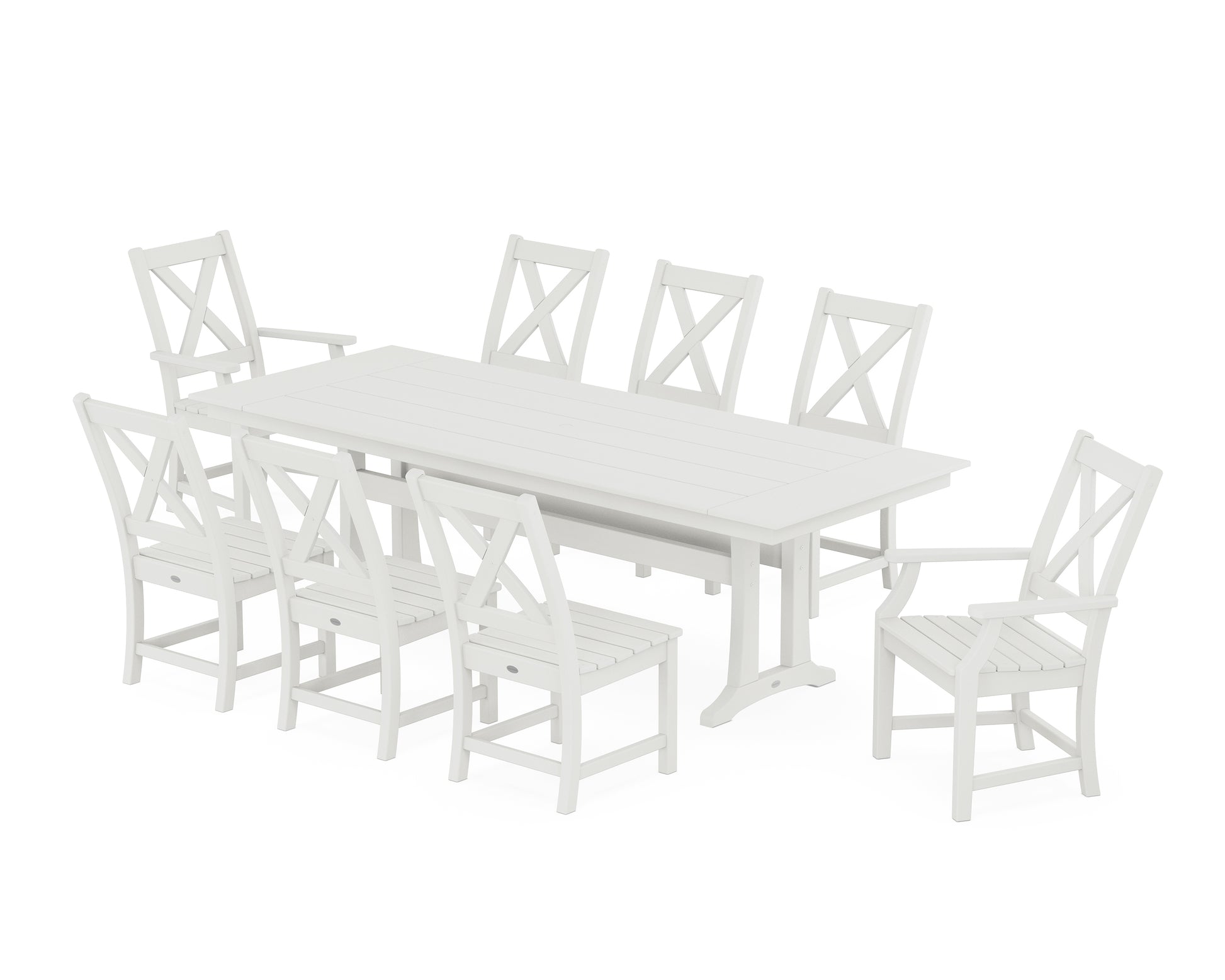 A balance of transitional design and rustic elements, the Braxton Collection is always a conversation starter with clean lines, curved profiles, and a farmhouse-inspired X-back design. Host large family dinners or invite the neighbors for game night with our Braxton 9-Piece Farmhouse Dining Set with Trestle Legs, which comfortably seats eight guests around a sleek plank-style table.