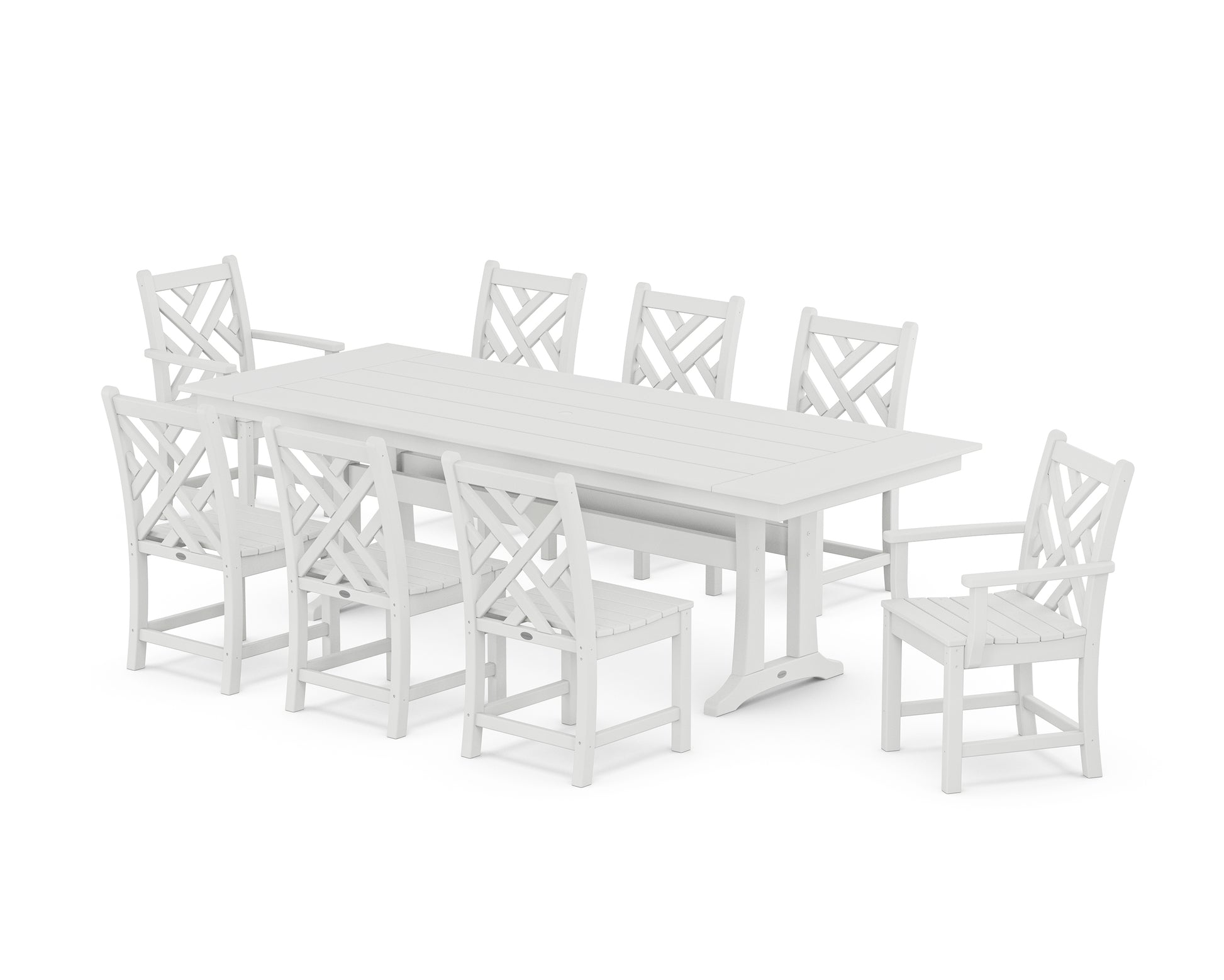 Inspired by the iconic English furniture design of the 18th century, our Chippendale Collection's intricate details invite sophisticated style outside. Starring a sleek plank-style table and room for eight people, the Chippendale 9-Piece Farmhouse Dining Set with Trestle Legs is a win for larger families, all-day celebrations, and spontaneous gatherings with friends.