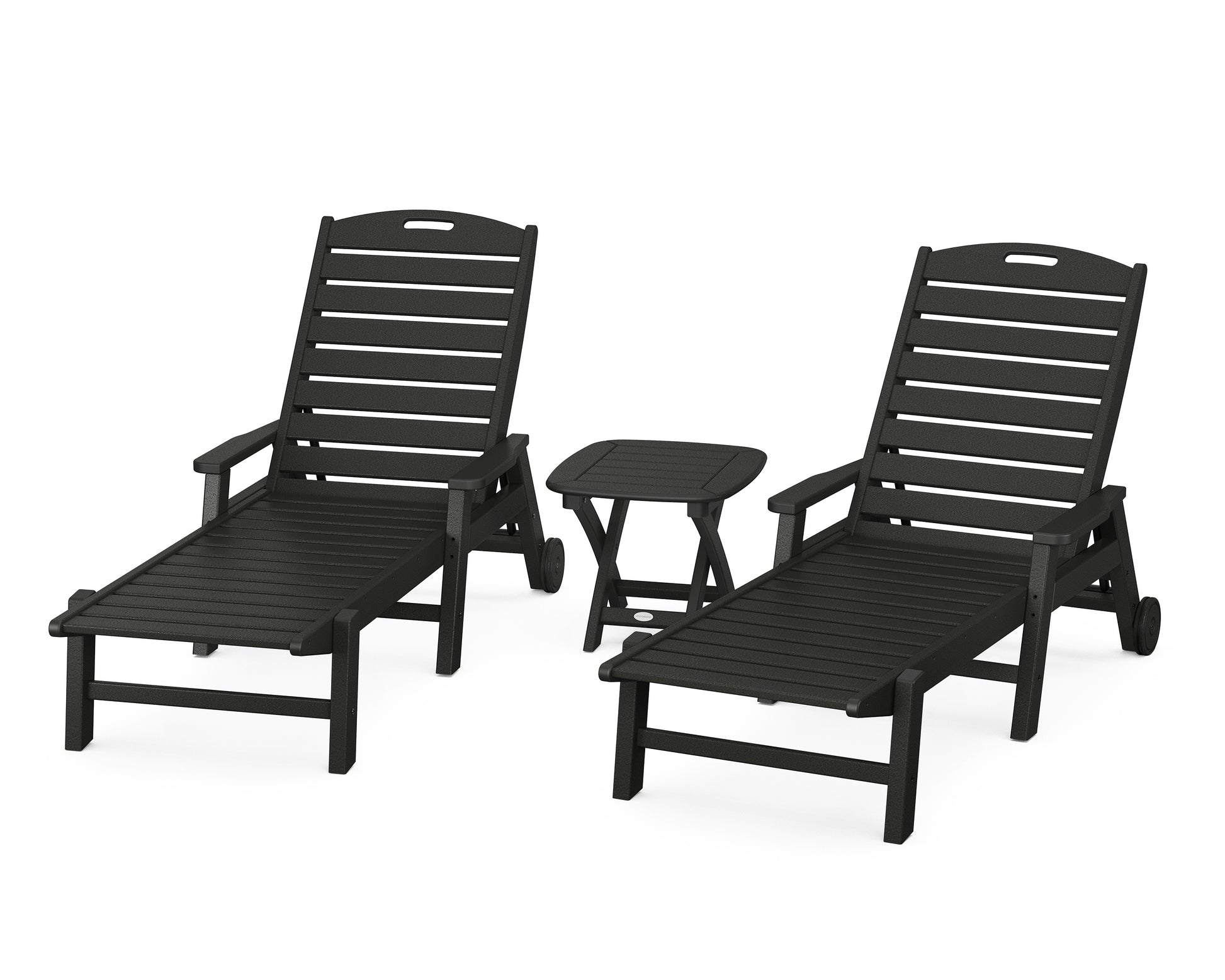 Come for the sun—but stay for the comfort with our Nautical 3-Piece Chaise Set. The two chaises feature adjustable backrests, wheels, and easy-to-carry handles. Plus, they stack for quick storage. Where will your magazines or freshly muddled mojitos go? The coordinating side table is there to serve.