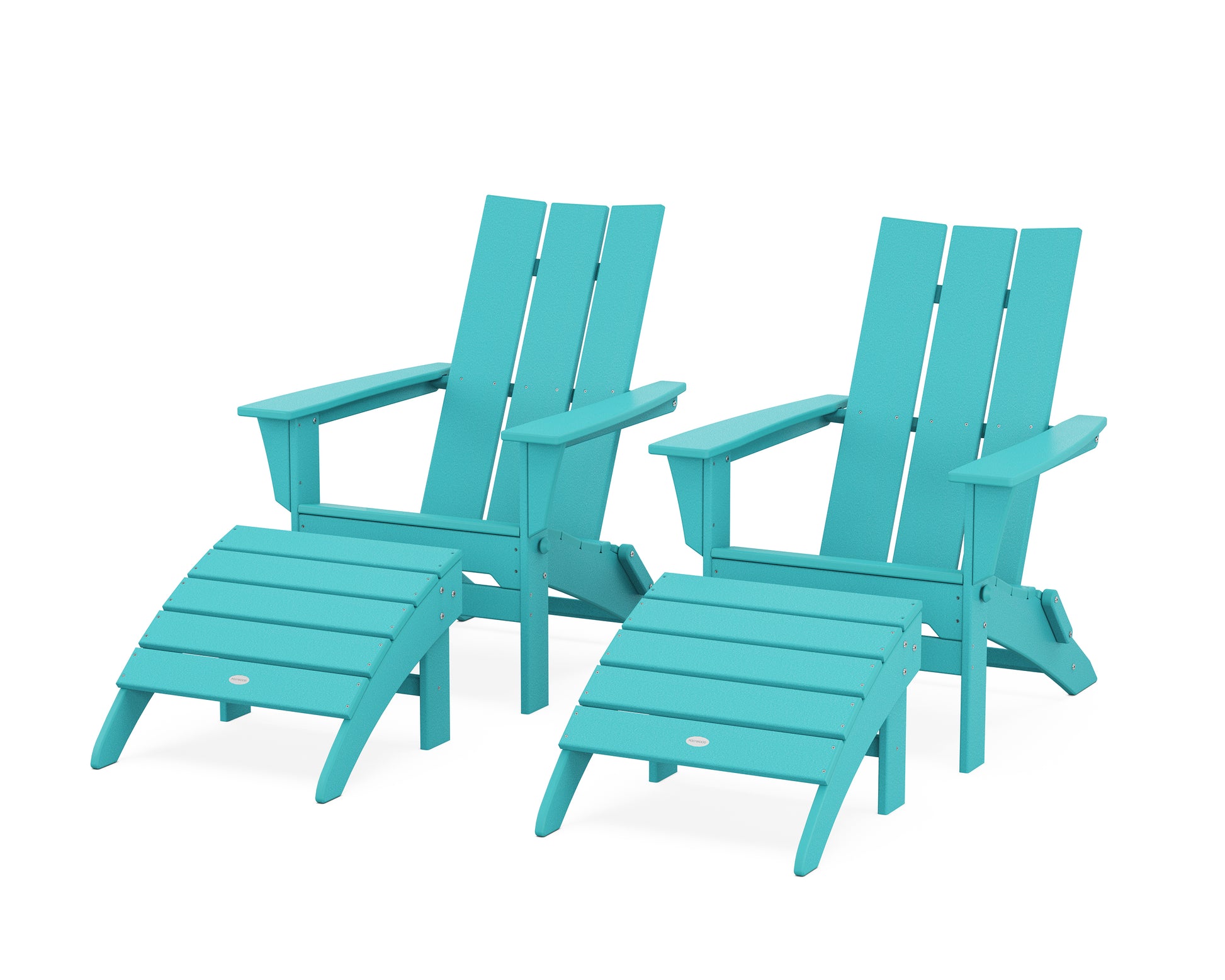 Catch up over drinks by the pool or pack up for a beach trip—the Modern Folding Adirondack Chair 4-Piece Set with Ottomans is ready to relax anytime, anywhere, in any season. The combination of comfy contours and uniform angles really sets these Adirondacks apart, and they fold down flat for easy transport.