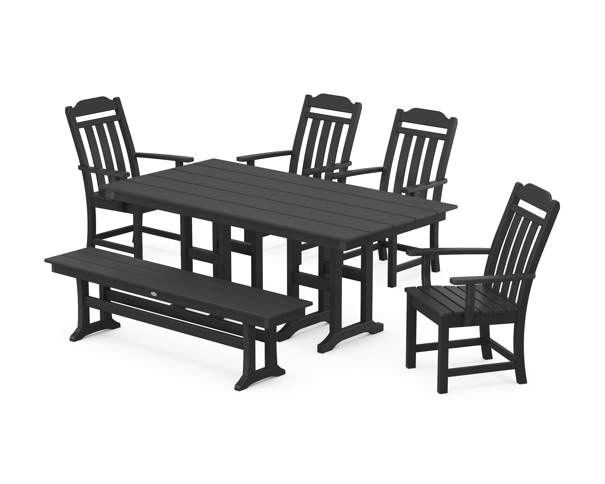 A place to share laughter and serve favorite family recipes, the Cottage 6-Piece Farmhouse Dining Set with Bench brings loved ones together around a spacious table. The chairs' back slats and curved top rail offer timeless appeal, while the well-placed seat contours keep everyone comfortably content. These durable, easy-to-clean designs offer maximum style with minimal effort to keep up their good looks, the perfect setup for years of fuss-free entertaining.