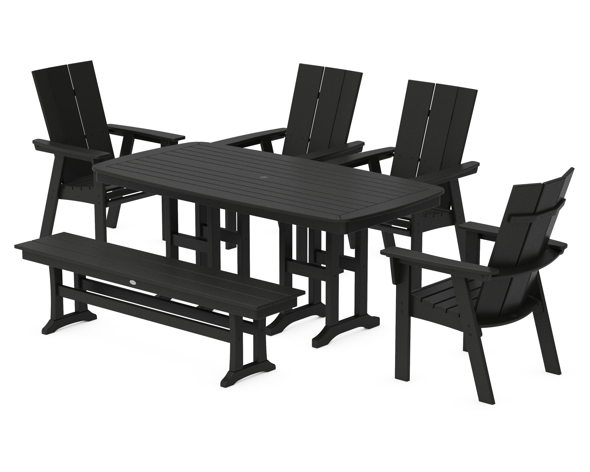 Our best-selling Modern Adirondack Collection reimagines an iconic design in clean, symmetrical lines inspired by minimalist style. The Modern Curveback Adirondack 6-Piece Dining Set with Bench offers comfortable seating around a spacious table. Fire up the grill, invite the neighbors, and savor more moments together—this party-ready set serves as the perfect backdrop for outdoor entertaining.
