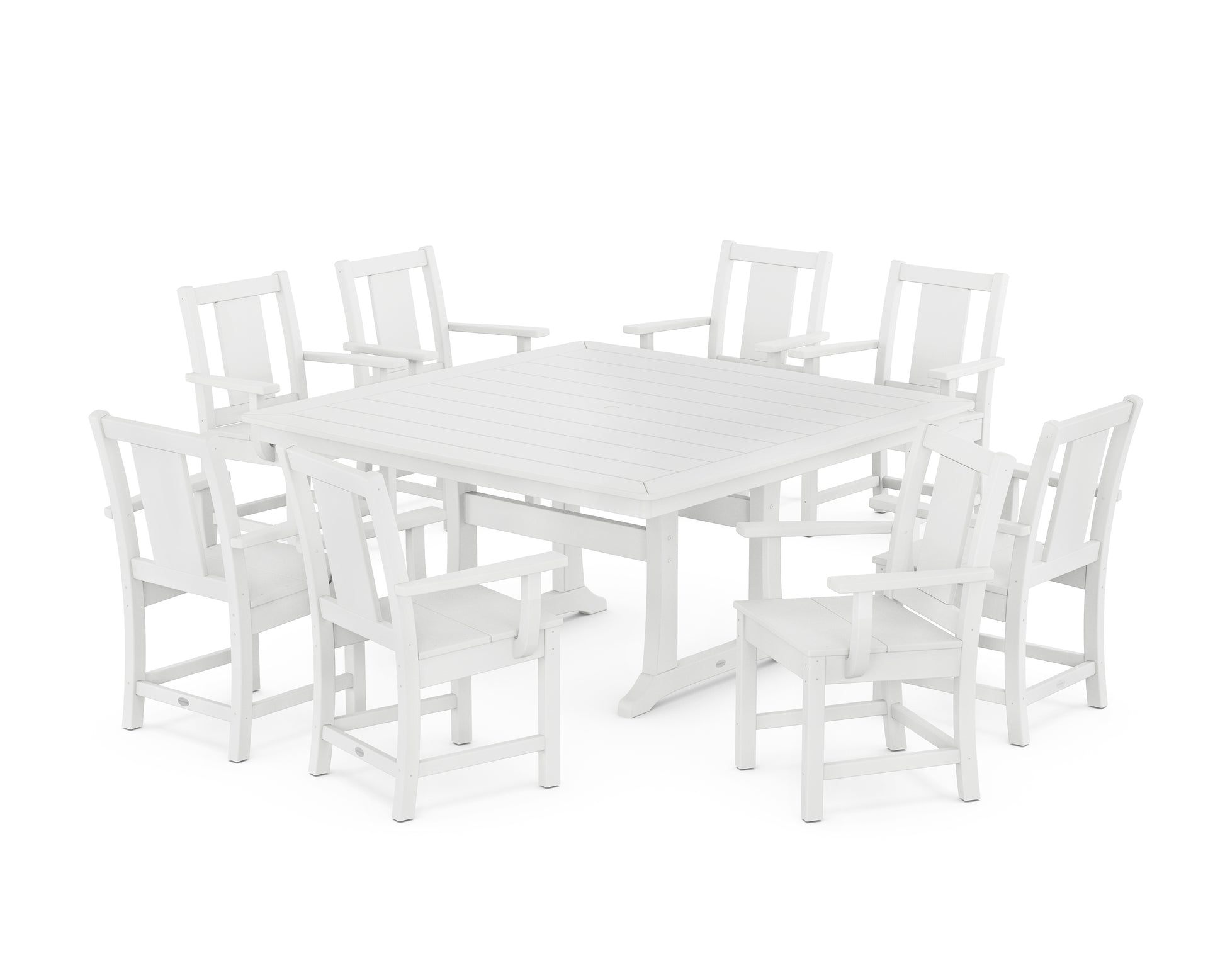 Our Prairie 9-Piece Square Dining Set with Trestle Legs is a bold take on traditional design, and from it comes a style that endures season after season. The chairs give Craftsman seating a modern edit with their clean lines, square angles, and uni-slat back. Paired with an all-weather dining table, this is the total package for alfresco entertaining. Plus, the spill- and stain-resistant materials make post-party cleanup a cinch.