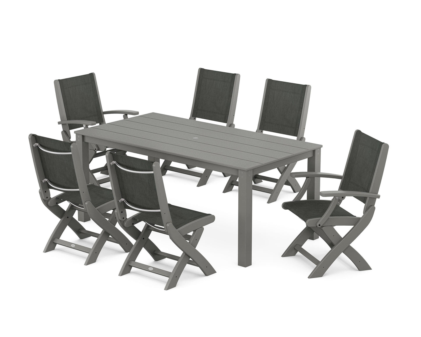 Two words can sum up the Coastal Collection: comfortable and carefree. Designed with materials that withstand all the elements, the Coastal Folding Chair 7-Piece Parsons Dining Set features durable lumber frames and all-weather sling seats with the perfect amount of bounce. Centered around a modernist dining table, this set easily and comfortably accommodates six.