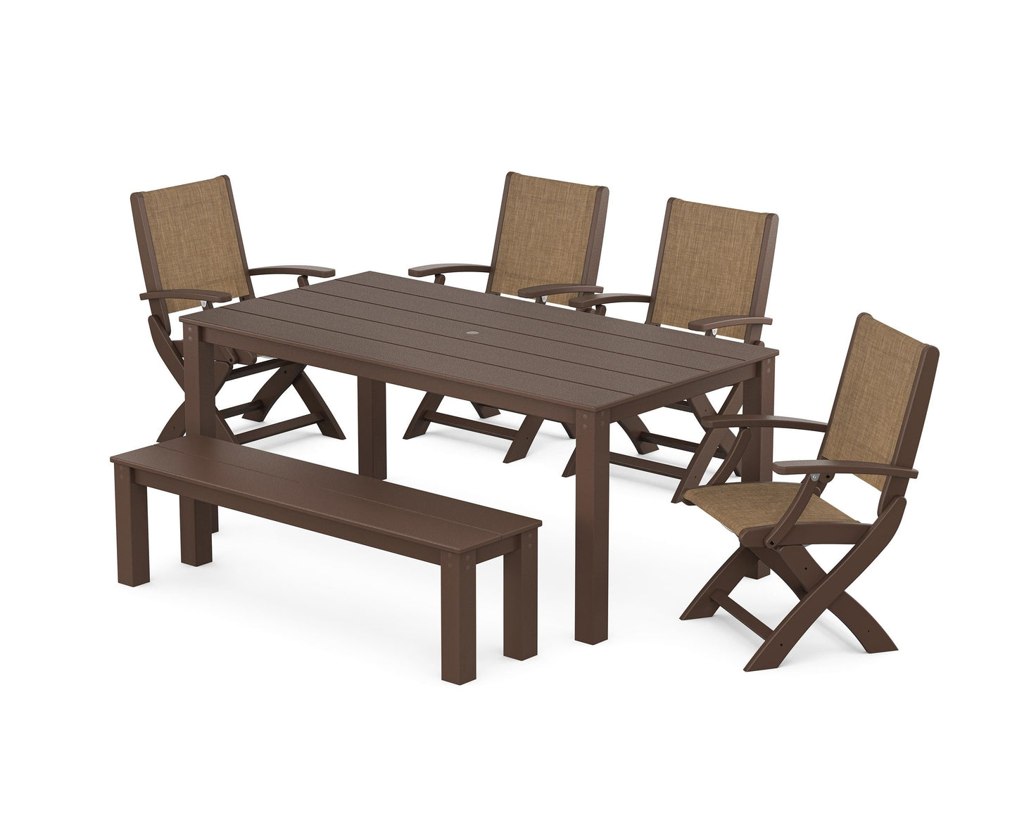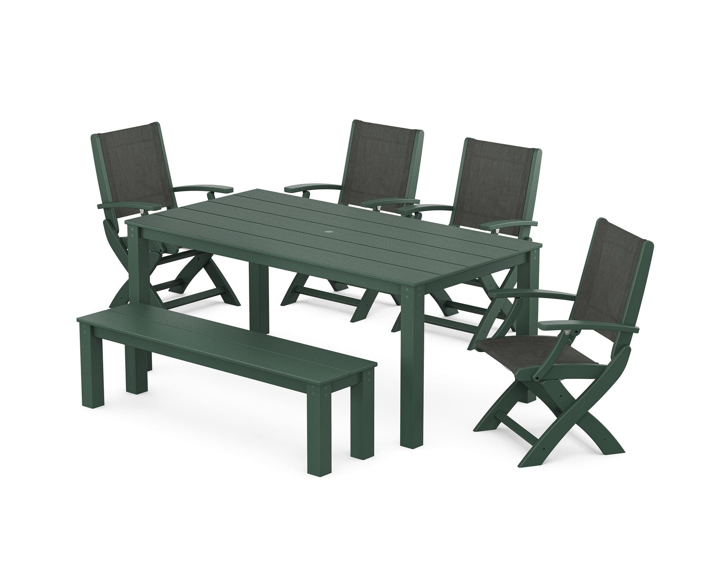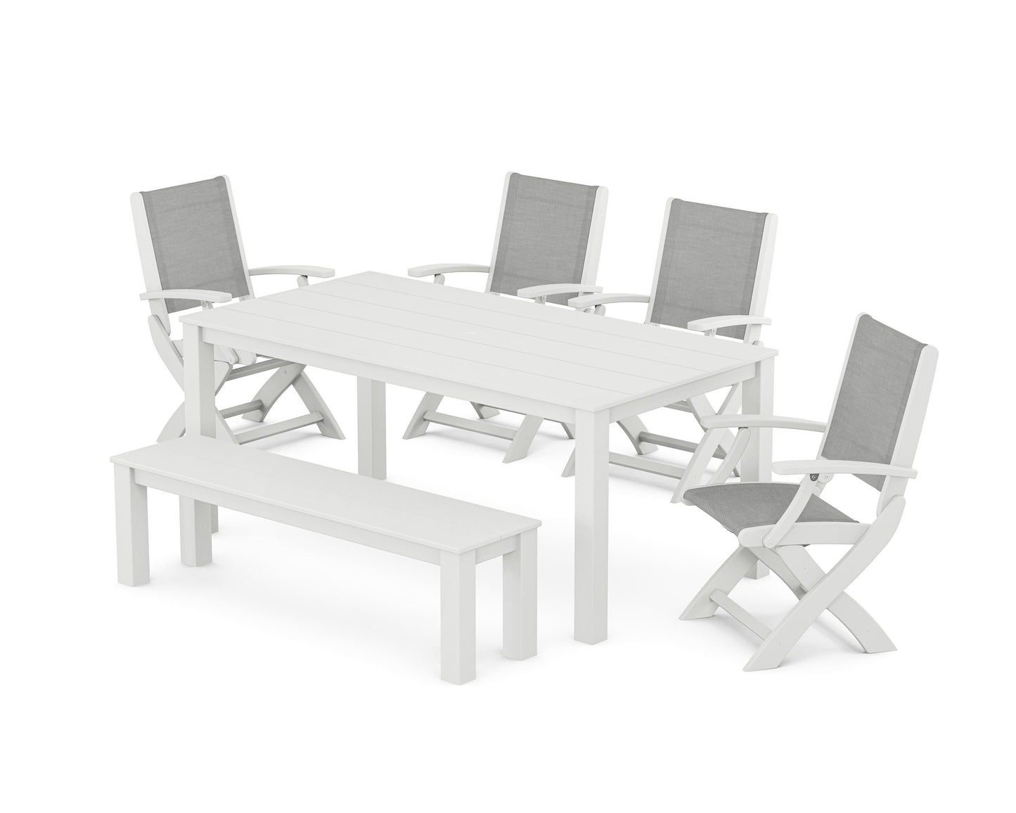 Two words can sum up the Coastal Collection: comfortable and carefree. Designed with materials that withstand all the elements, the Coastal Folding Chair 6-Piece Parsons Dining Set with Bench features durable lumber frames and all-weather sling seats with the perfect amount of bounce. Centered around a modernist dining table and matching bench, this set easily and comfortably accommodates a family or friend group.