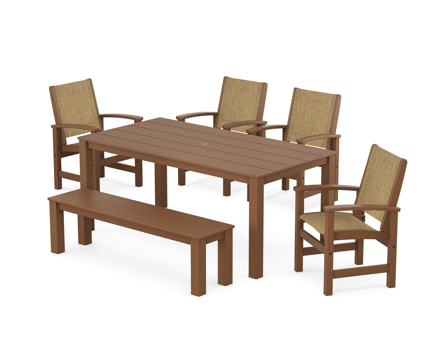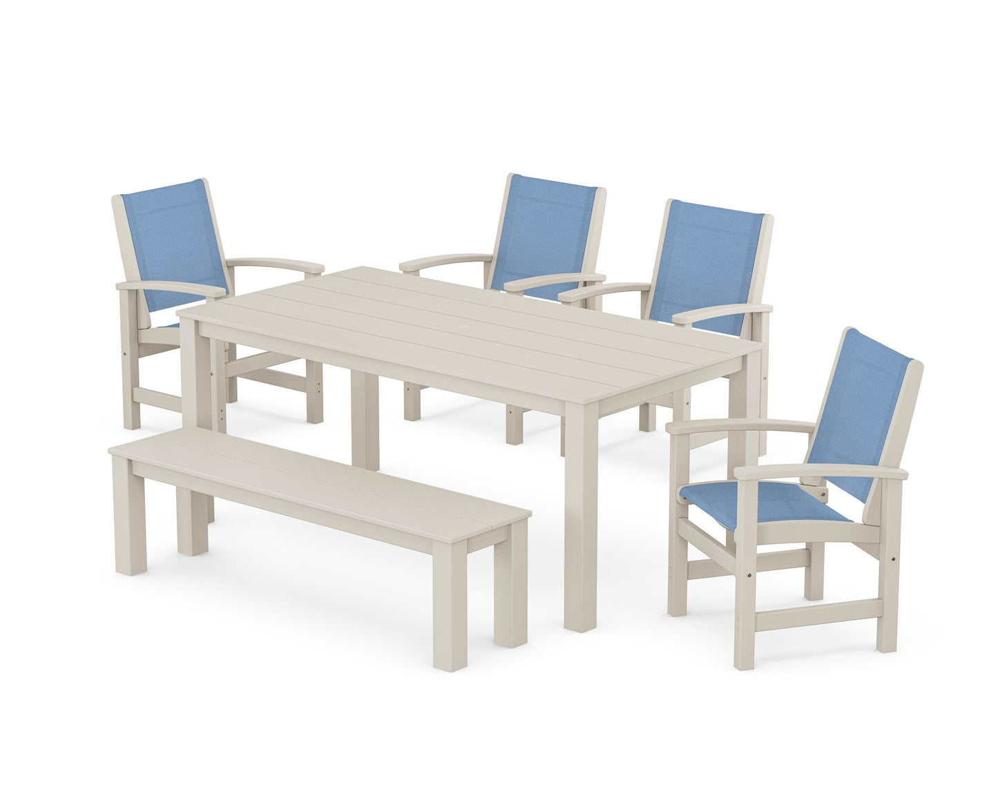 Two words can sum up the Coastal Collection: comfortable and carefree. Designed with materials that withstand all the elements, the Coastal Folding Chair 6-Piece Parsons Dining Set with Bench features durable lumber frames and all-weather sling seats with the perfect amount of bounce. Centered around a modernist dining table and matching bench, this set easily and comfortably accommodates a family or friend group.