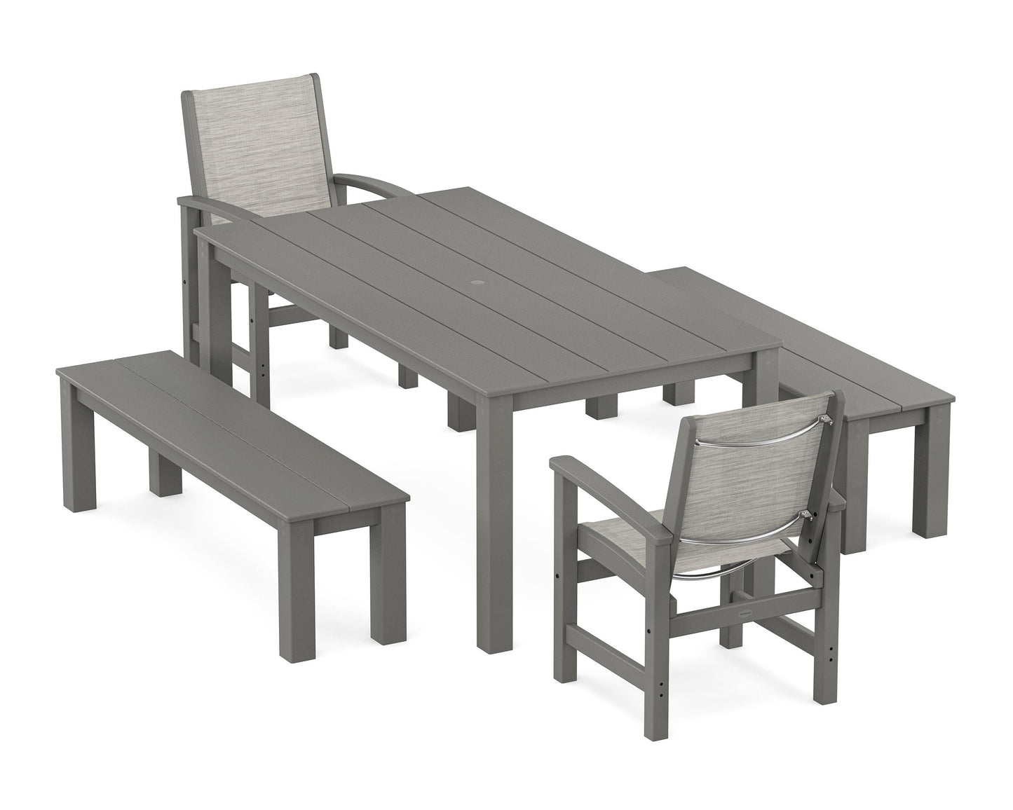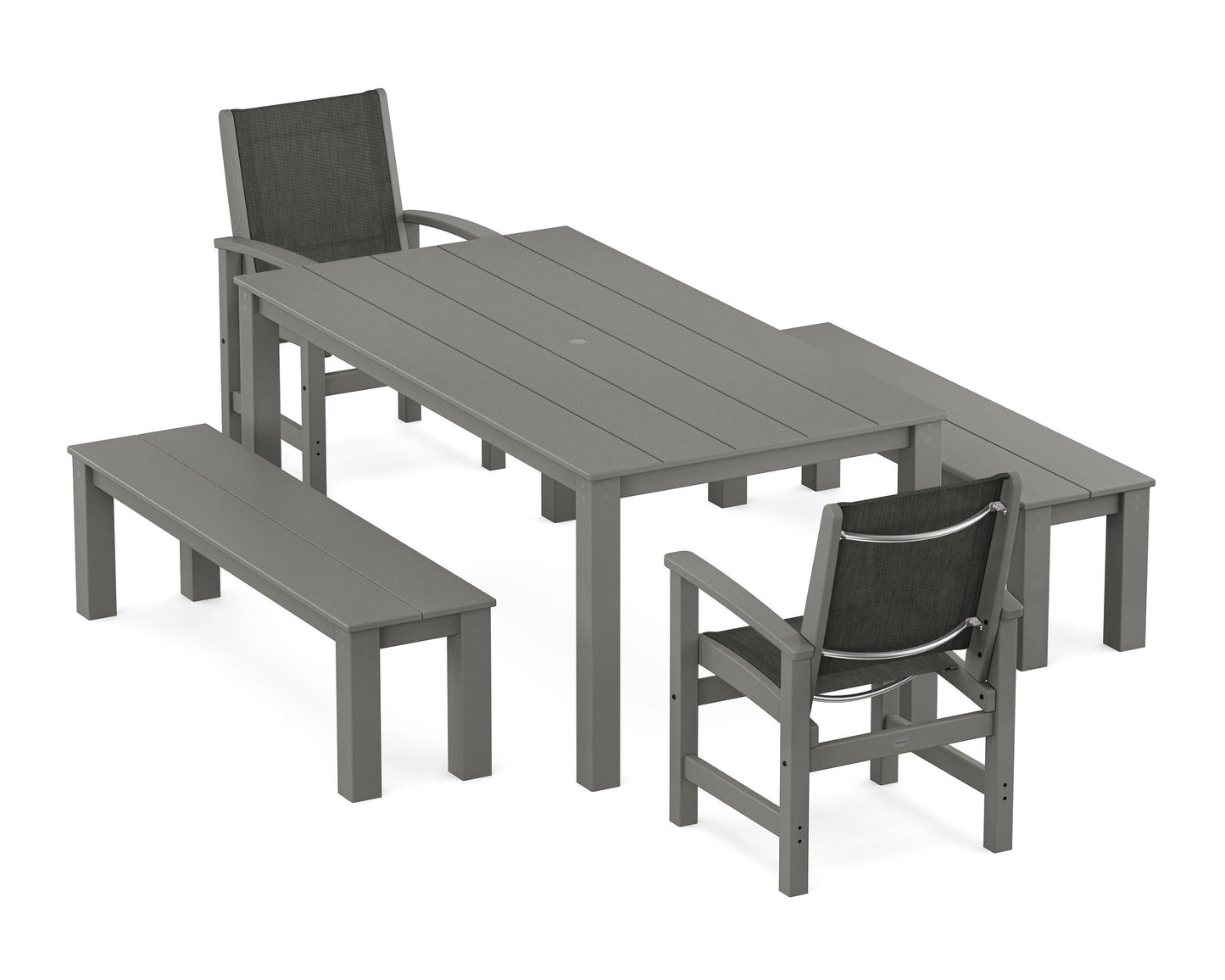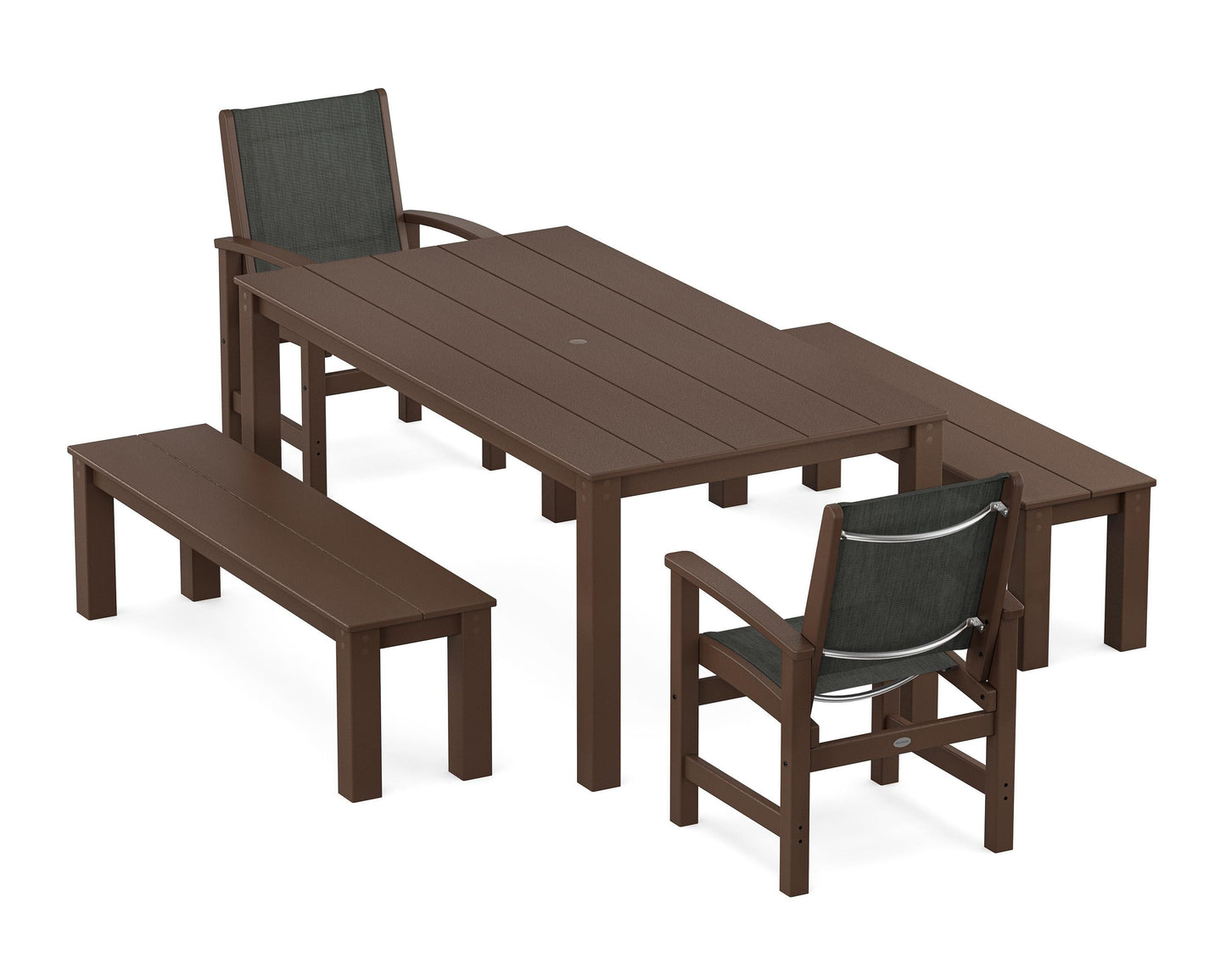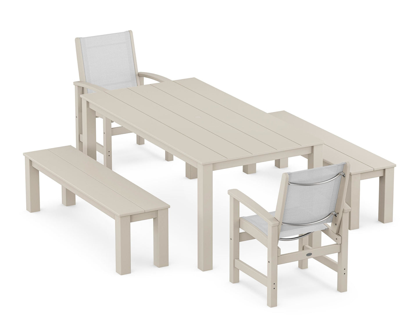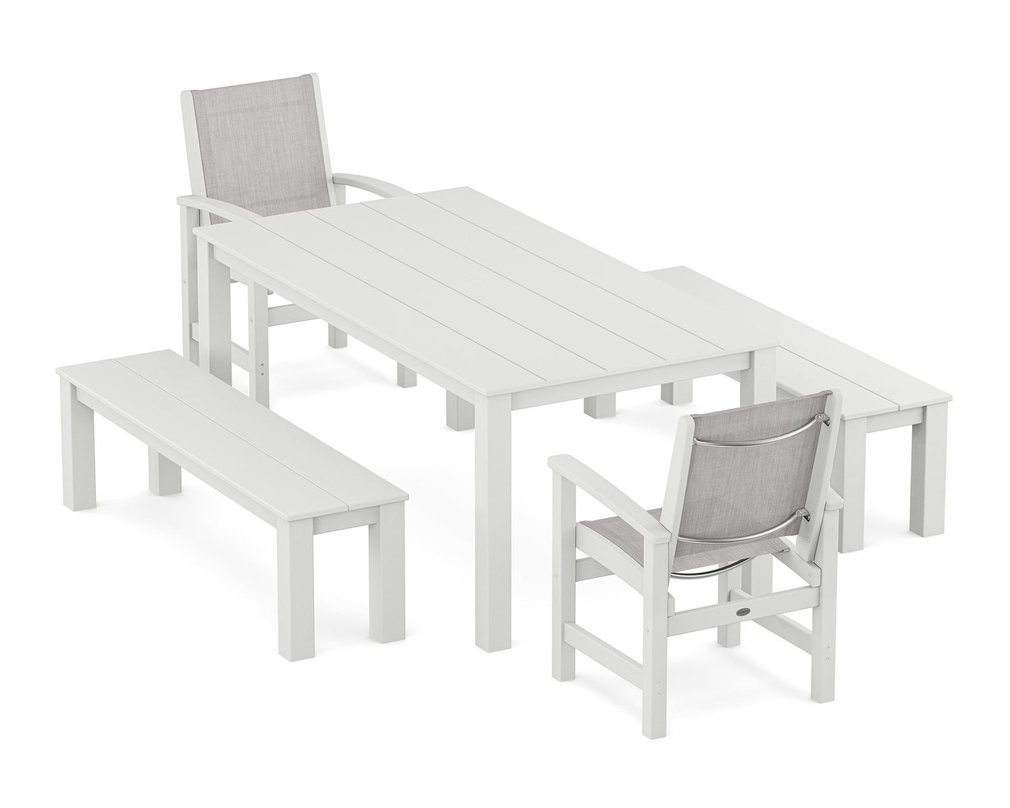 Two words can sum up the Coastal Collection: comfortable and carefree. Designed with materials that withstand all the elements, the Coastal 5-Piece Parsons Dining Set with Benches features durable lumber frames and all-weather sling seats with the perfect amount of bounce. Centered around a modernist dining table and matching bench, this set easily and comfortably accommodates a family or friend group.