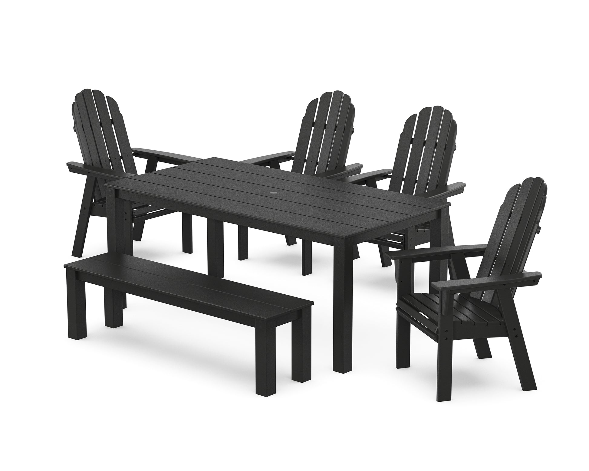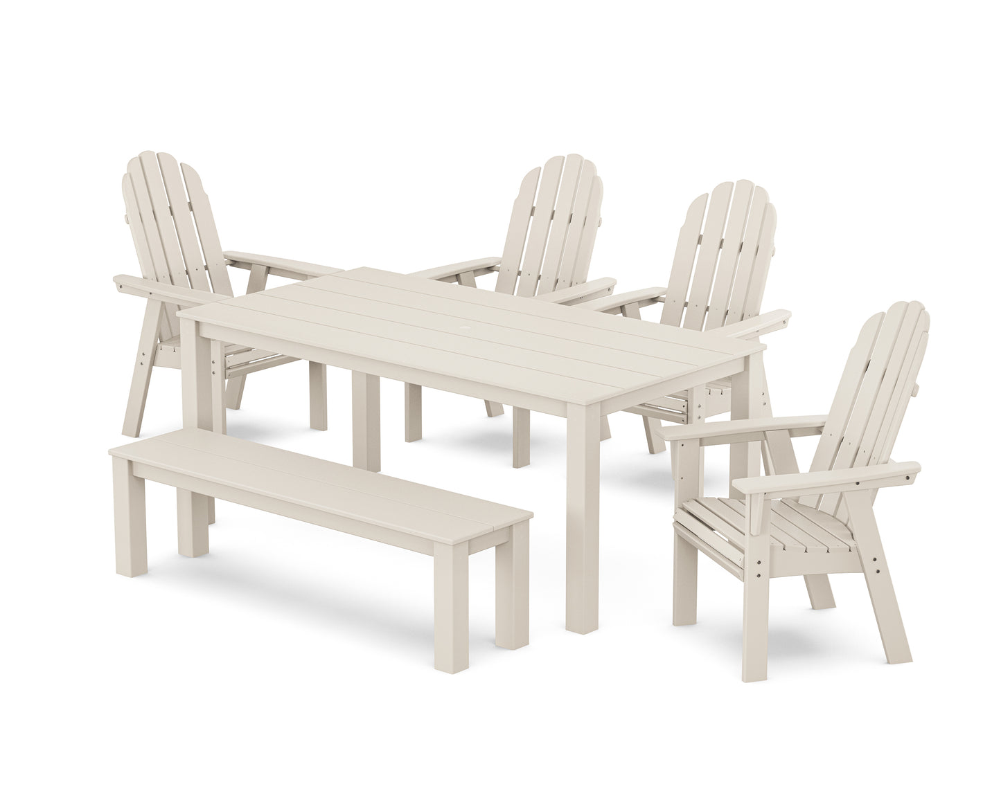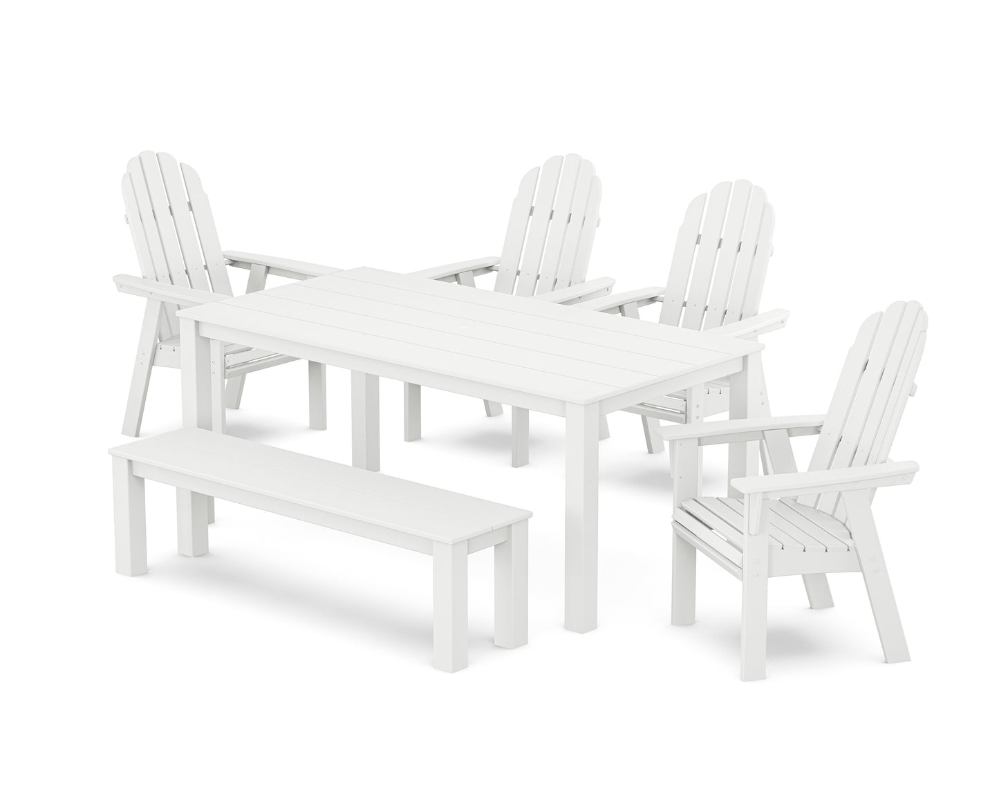 Ideal for everything under the sun (or stars), the Vineyard Curveback Adirondack 6-Piece Parsons Dining Set with Bench includes a modern table, coordinating bench, and Adirondack-style seating. These enduring designs balance classic style with supportive, stay-all-day comfort, encouraging lingering conversations and more meals alfresco. We'll raise a glass to that.