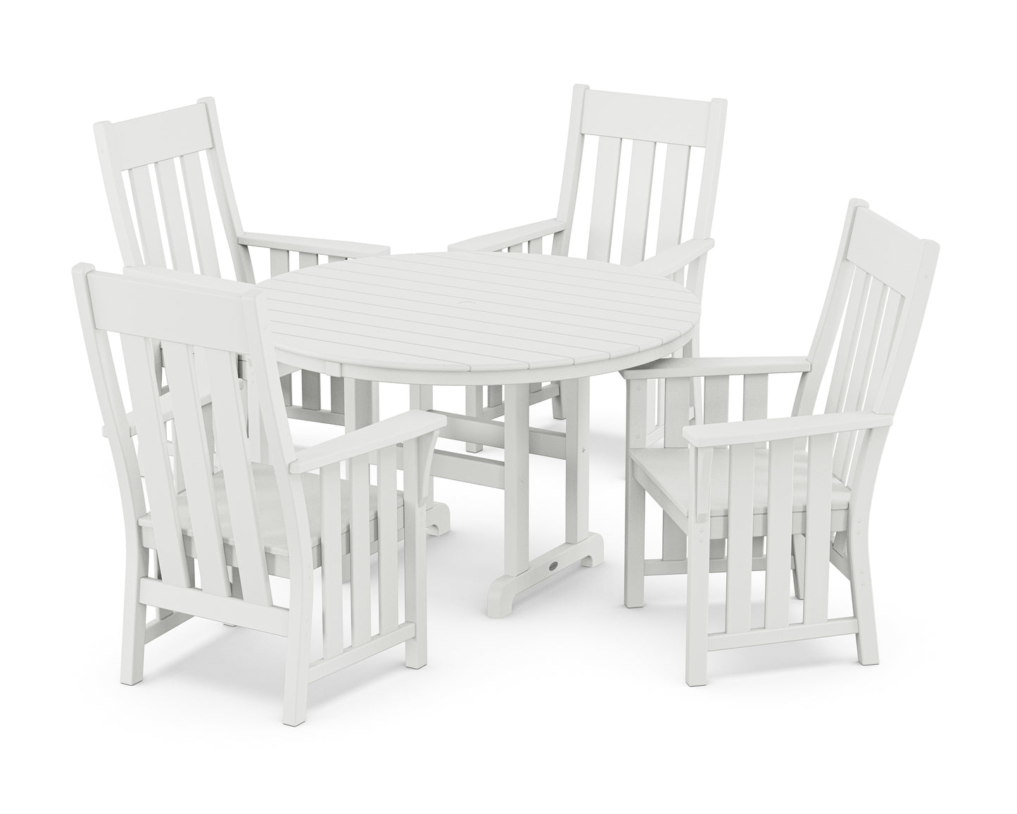 The Martha Stewart by POLYWOOD Acadia 5-Piece Round Farmhouse Dining Set celebrates a return to the forms of Craftsman furniture, defined by strong vertical lines that lend a subtle sense of grandeur. Decorative details on the table and chairs emulate traditional woodworking joinery. This all-weather collection was inspired by pieces at Martha Stewart's residence in Maine, a bucolic beauty built in the 1920s.