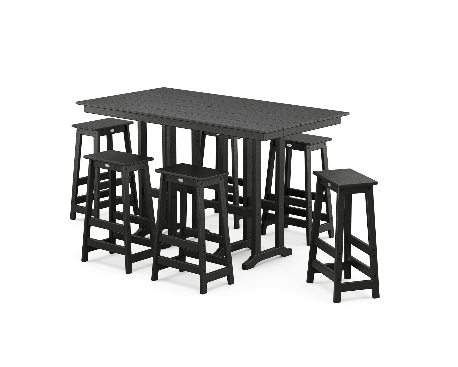 Our Modern Studio Bar Stool 7-Piece Set is the perfect entertaining spot for balconies, poolsides, and decks. The stools nestle neatly under the table to save space when everyone's finished with post-swim snacks or the dinner party's done.
