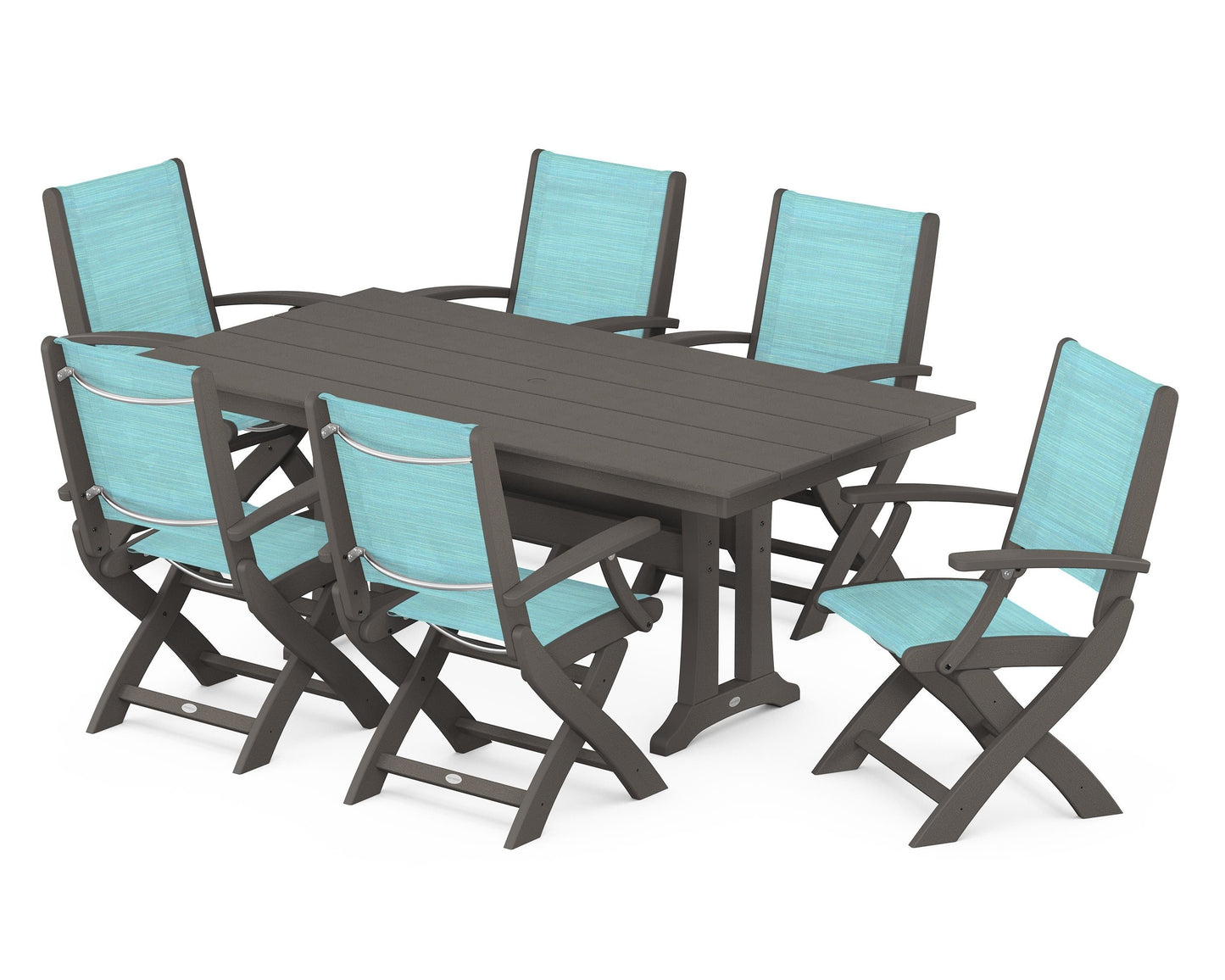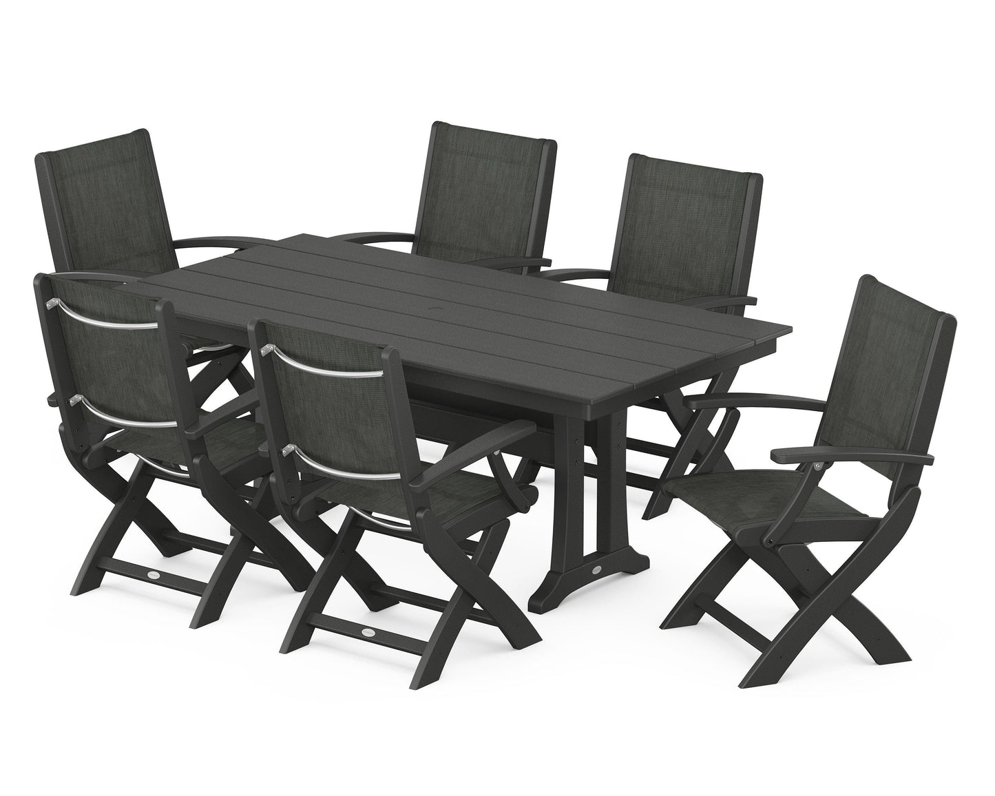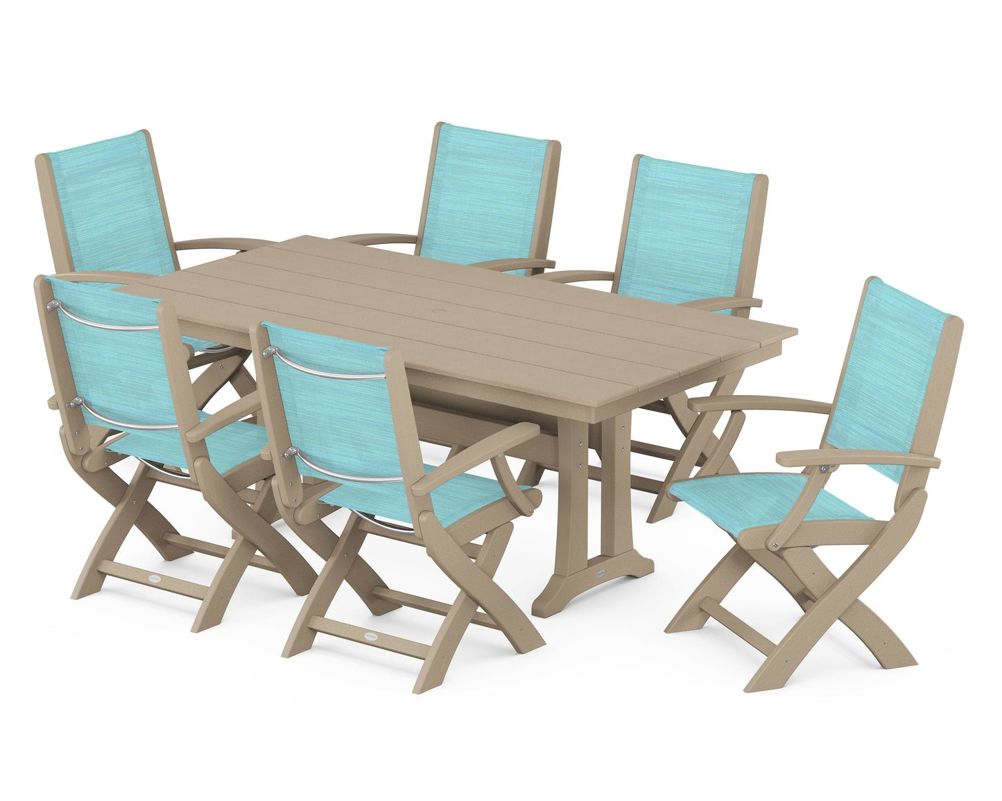 Create a relaxing dining spot on your patio with the Coastal Folding Arm Chair 7-Piece Farmhouse Dining Set with Trestle Legs. Seating up to six guests with comfort and style, the Coastal Folding Chair features a high back and the ability to fold and stand upright when not in use. The all-weather Farmhouse table allows space for plenty of legroom and provides a sleek plank-style tabletop to fit any outdoor style.
