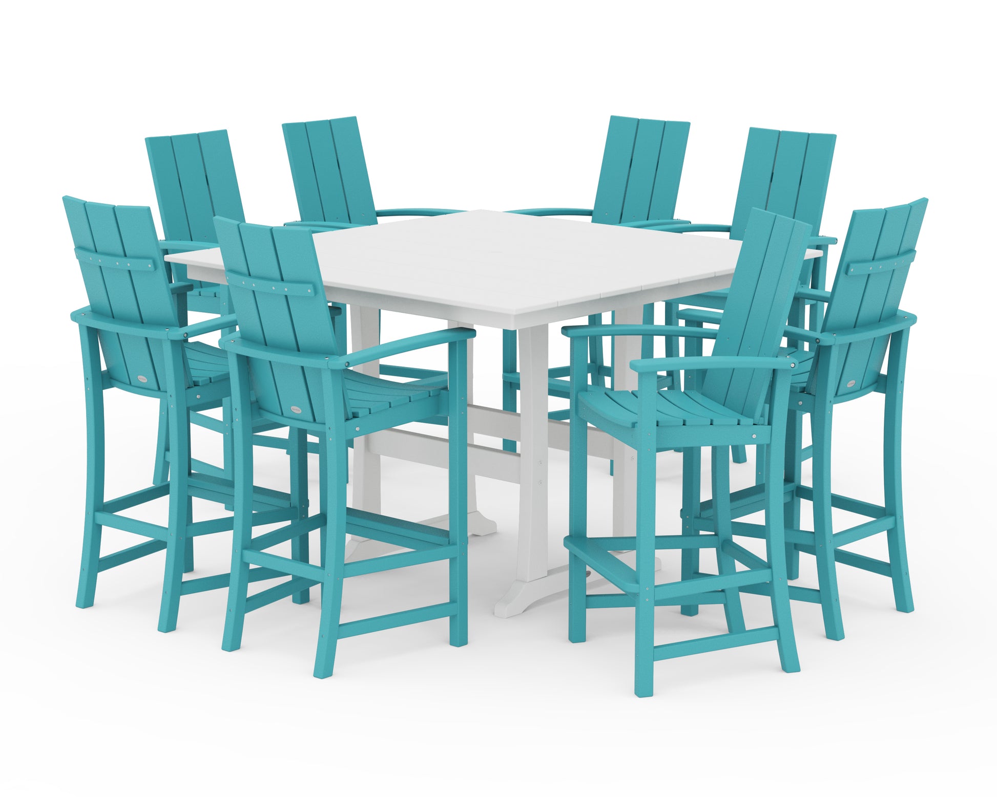 Fire up the grill, invite the neighbors over, and savor more moments together: The Modern Adirondack 9-Piece Farmhouse Trestle Bar Set is here to serve. This party-ready set offers comfortable seating for eight around an oversized bar table, all made with spill-proof surfaces for fuss-free hosting. From our best-selling collection, these bar chairs reimagine the iconic Adirondack in clean, symmetrical lines inspired by minimalist style.