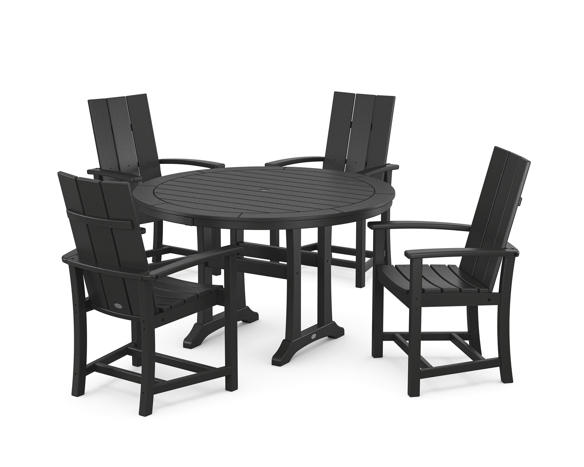 Our best-selling Modern Adirondack Collection reimagines an iconic design in clean, symmetrical lines inspired by minimalist style. The Modern Adirondack 5-Piece Round Dining Set with Trestle Legs offers comfortable seating for four around a stylish circular table. Set out a charcuterie board, invite your best friends over, and savor more moments together?this all-weather set serves as the perfect backdrop for casual outdoor entertaining.