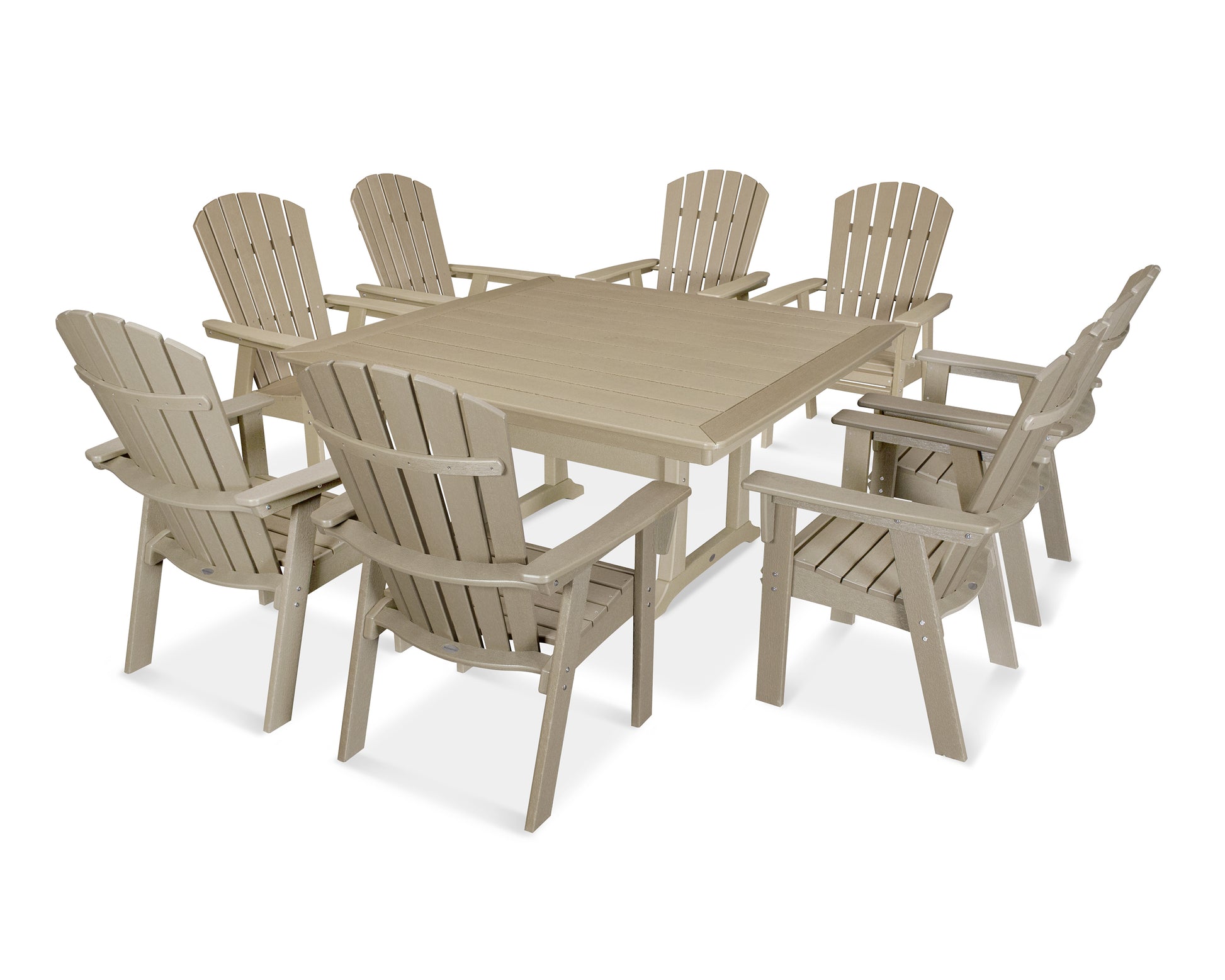 Gather around the table for a laid back meal outdoors with this all-weather dining set. With seating for eight, the Nautical Adirondack 9-Piece Trestle Dining Set allows everyone at the table to be a part of the conversation. The Nautical Adirondack Dining Chairs feature an oversized seat while the Nautical Trestle 59" Dining Table provides a spacious tabletop and plenty of legroom underneath.