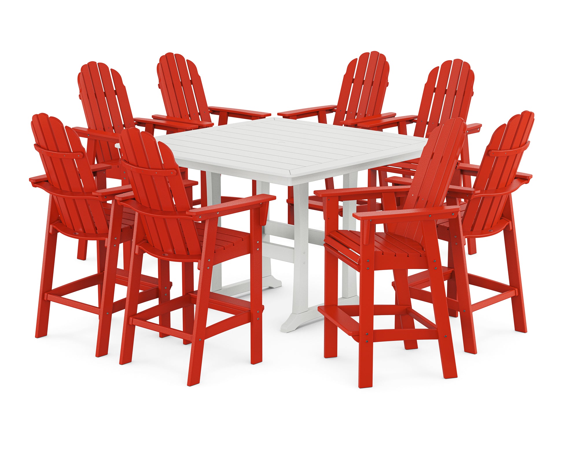 Bring your loved ones together around the Vineyard Curveback Adirondack 9-Piece Trestle Bar Set for a relaxing meal outdoors. This attractive set seats up to eight guests for a relaxing alfresco dining experience. The Vineyard Curveback Adirondack Bar Chairs feature oversized seats and convenient footrests while the Nautical Trestle 59" Bar Table provides a spacious tabletop and plenty of legroom underneath.