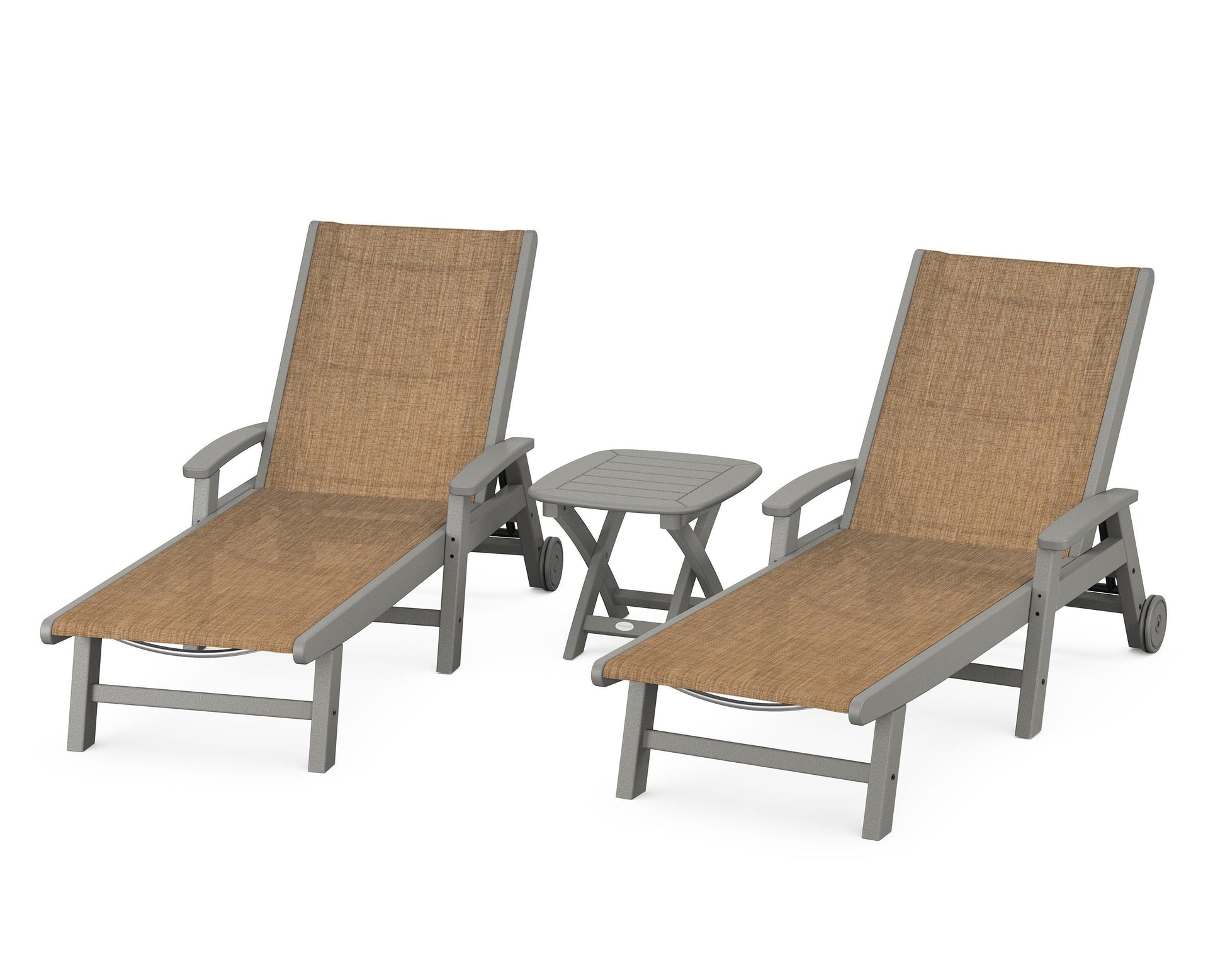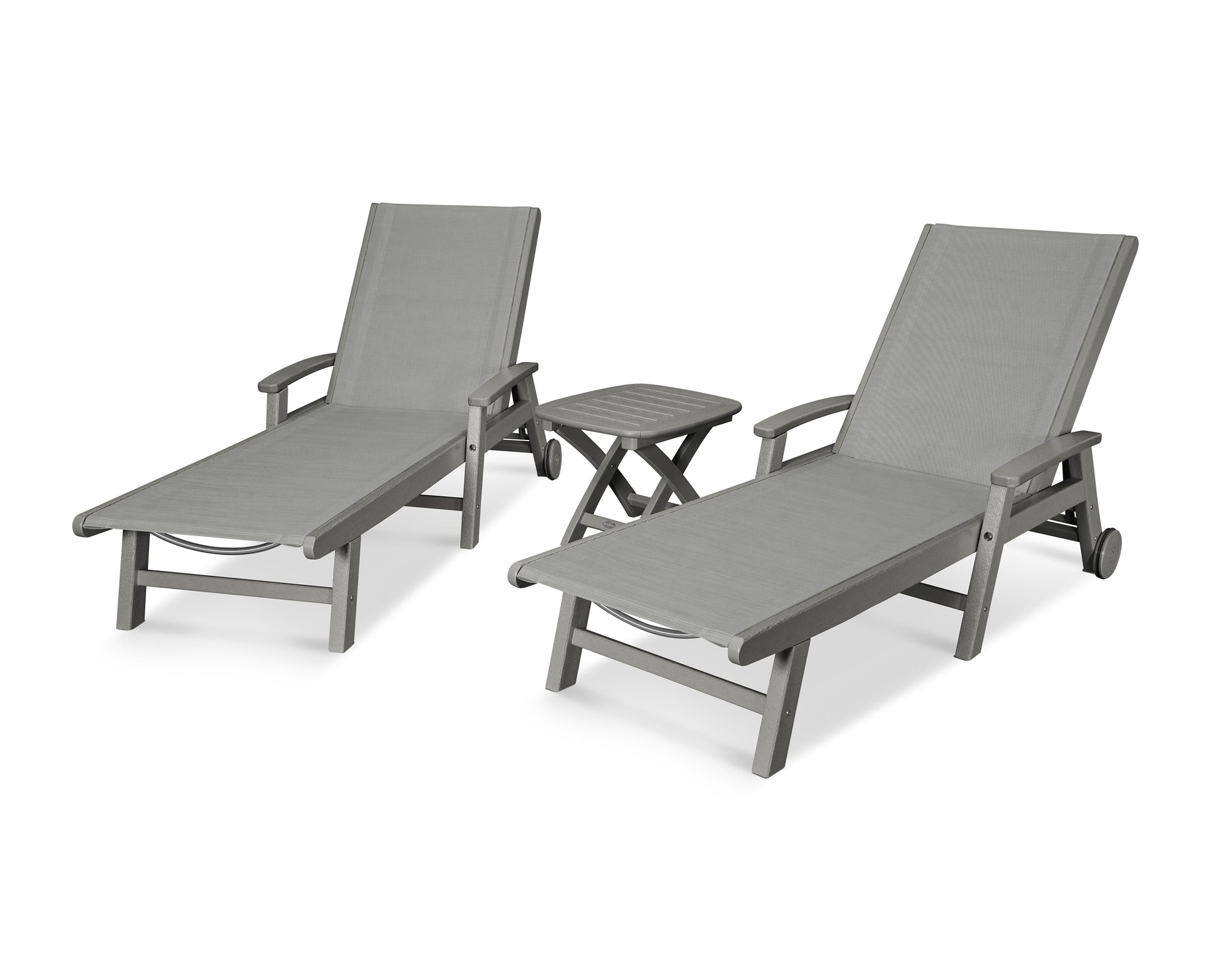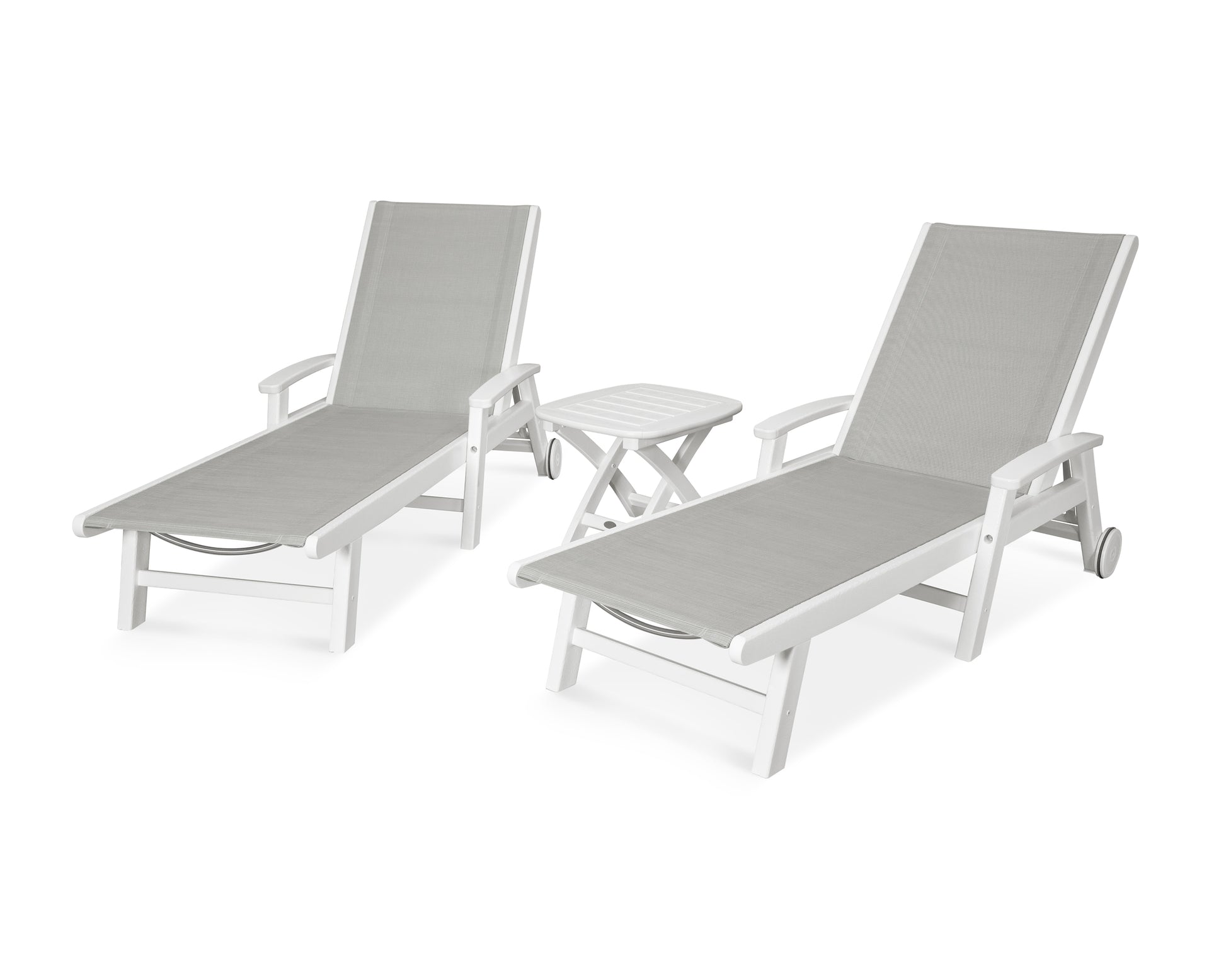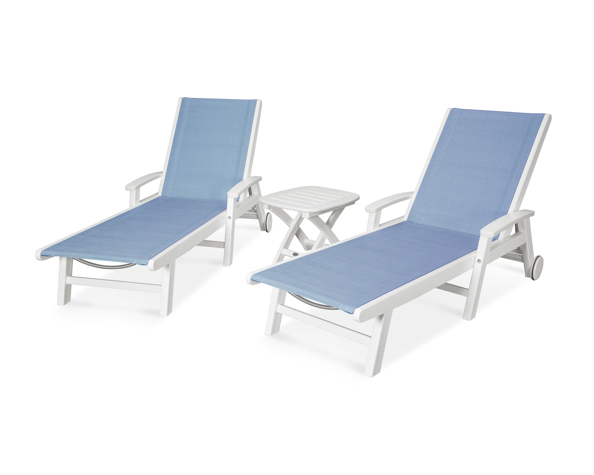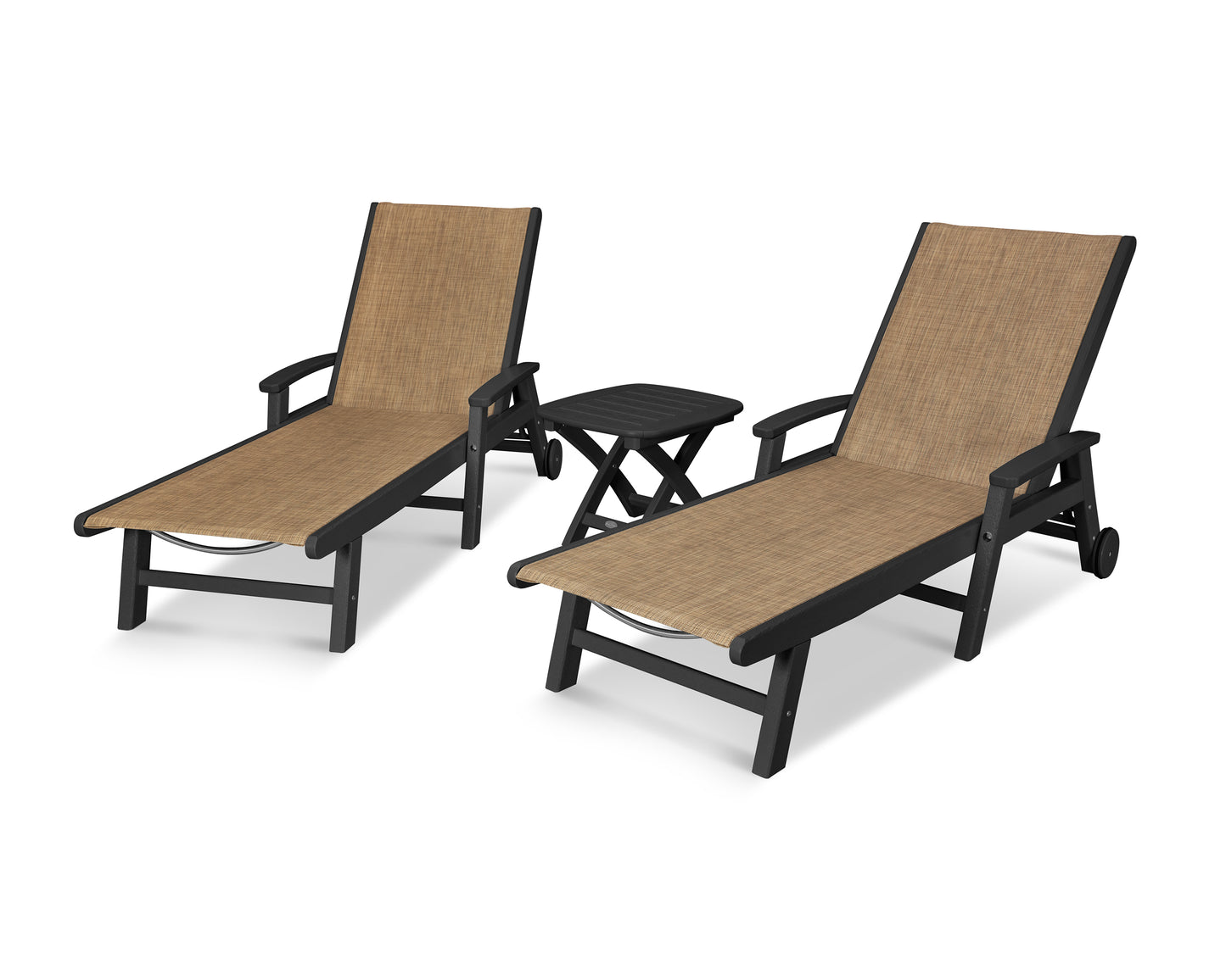Lie back and relax in the Coastal 3-Piece Chaise with Wheels Set, fitted with a breathable fabric sling for optimal comfort. Conveniently equipped with wheels, you can easily move your all-weather chaise lounges to wherever the sun takes you, and the coordinating side table is the perfect place to set your drinks. Whether poolside or on your patio or deck, this set will look great for many years to come.