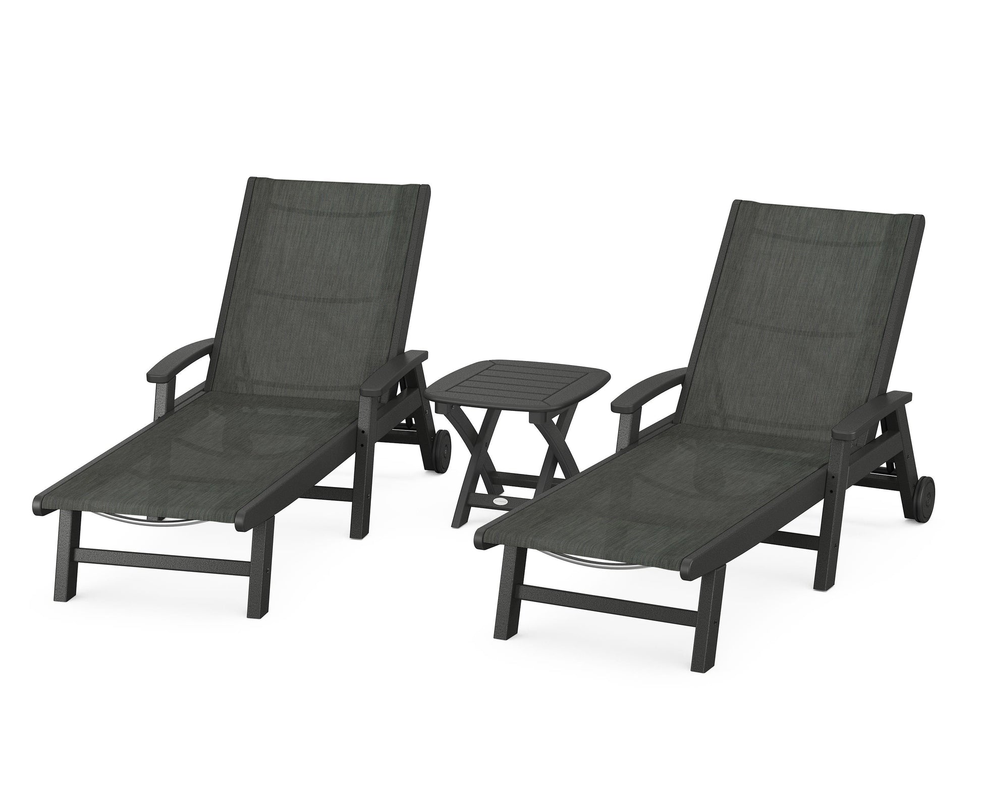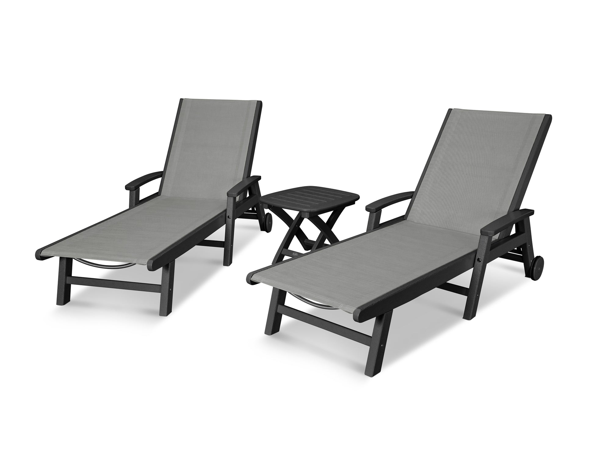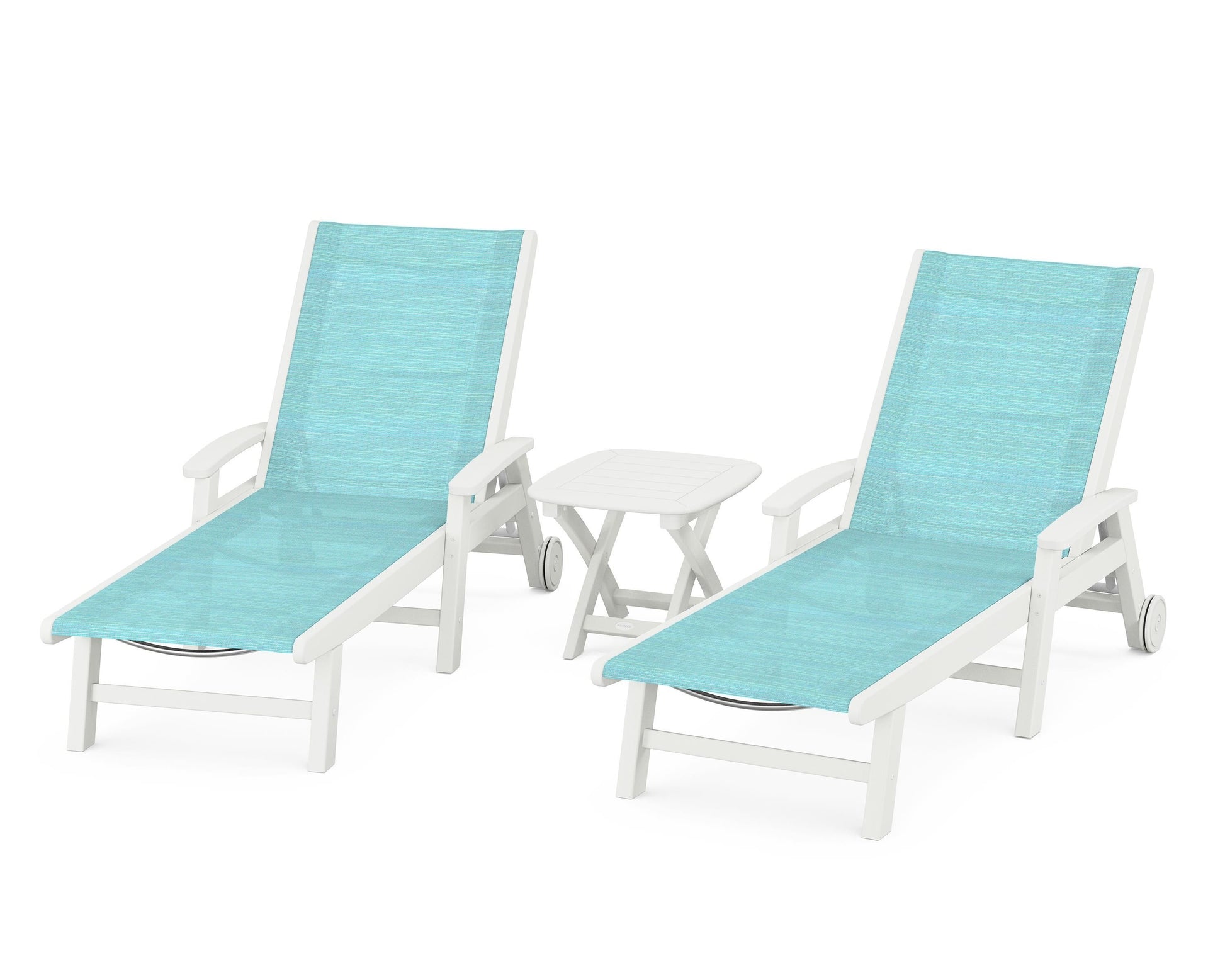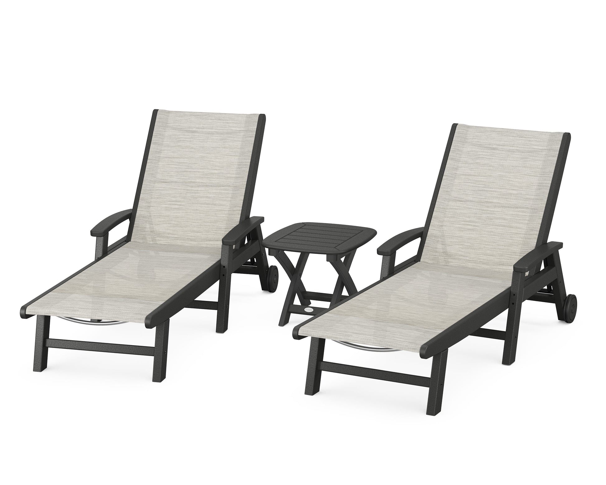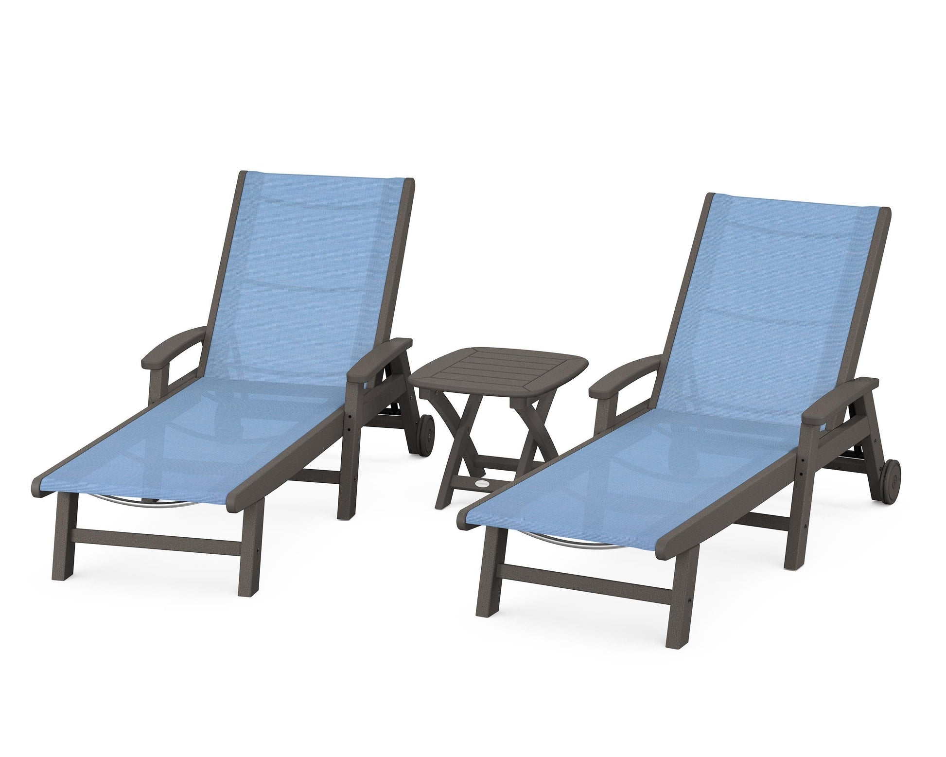 Lie back and relax in the Coastal 3-Piece Chaise with Wheels Set, fitted with a breathable fabric sling for optimal comfort. Conveniently equipped with wheels, you can easily move your all-weather chaise lounges to wherever the sun takes you, and the coordinating side table is the perfect place to set your drinks. Whether poolside or on your patio or deck, this set will look great for many years to come.