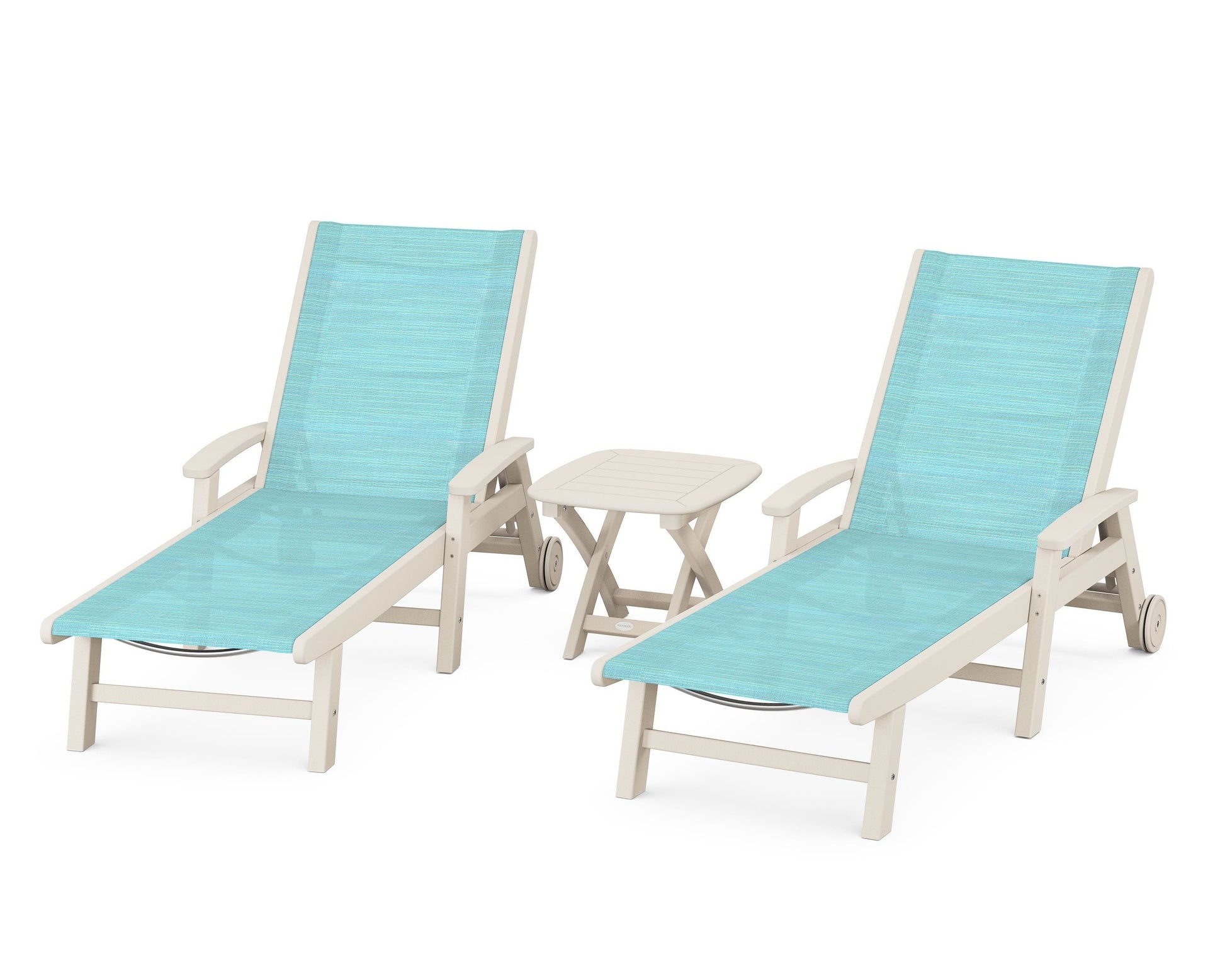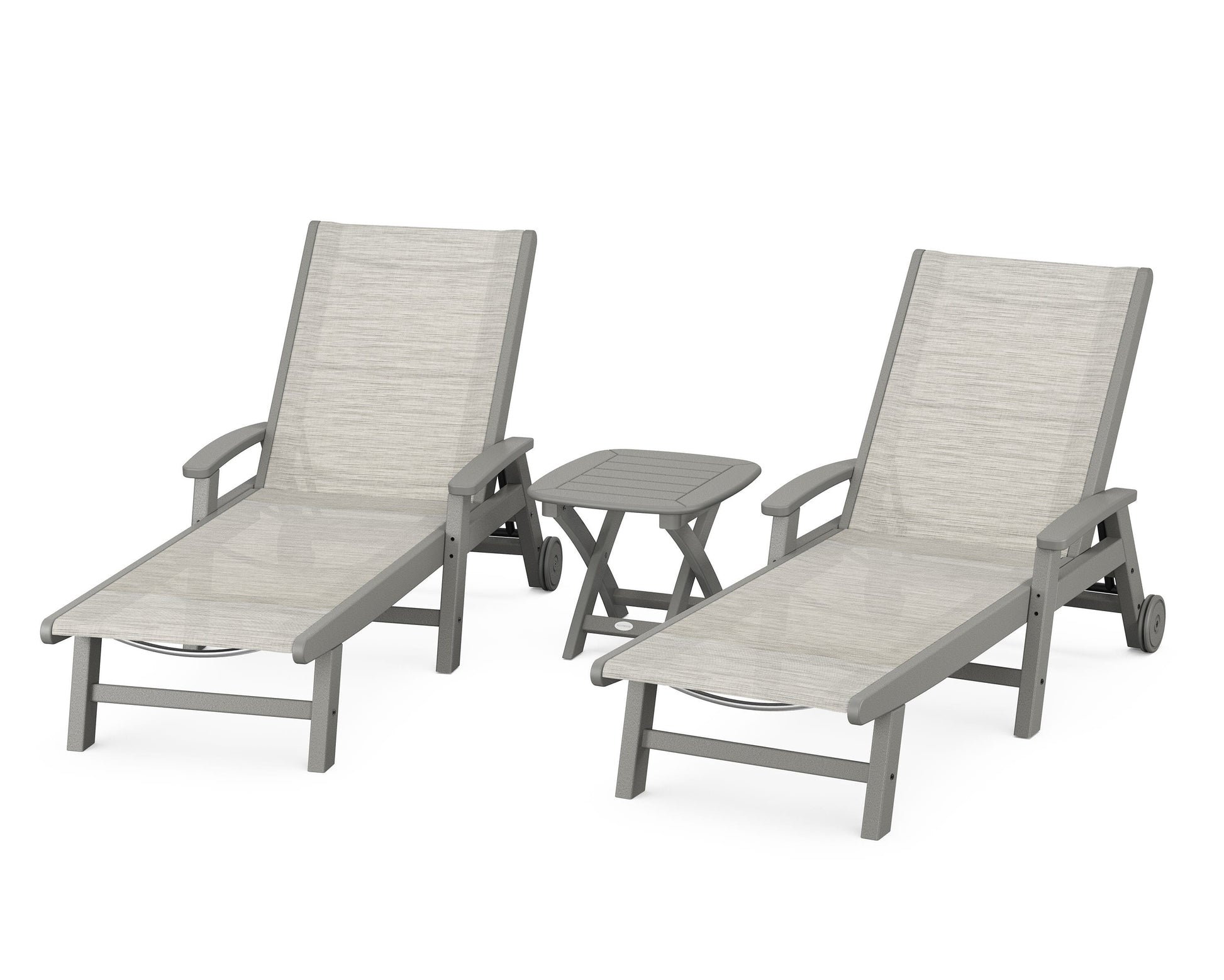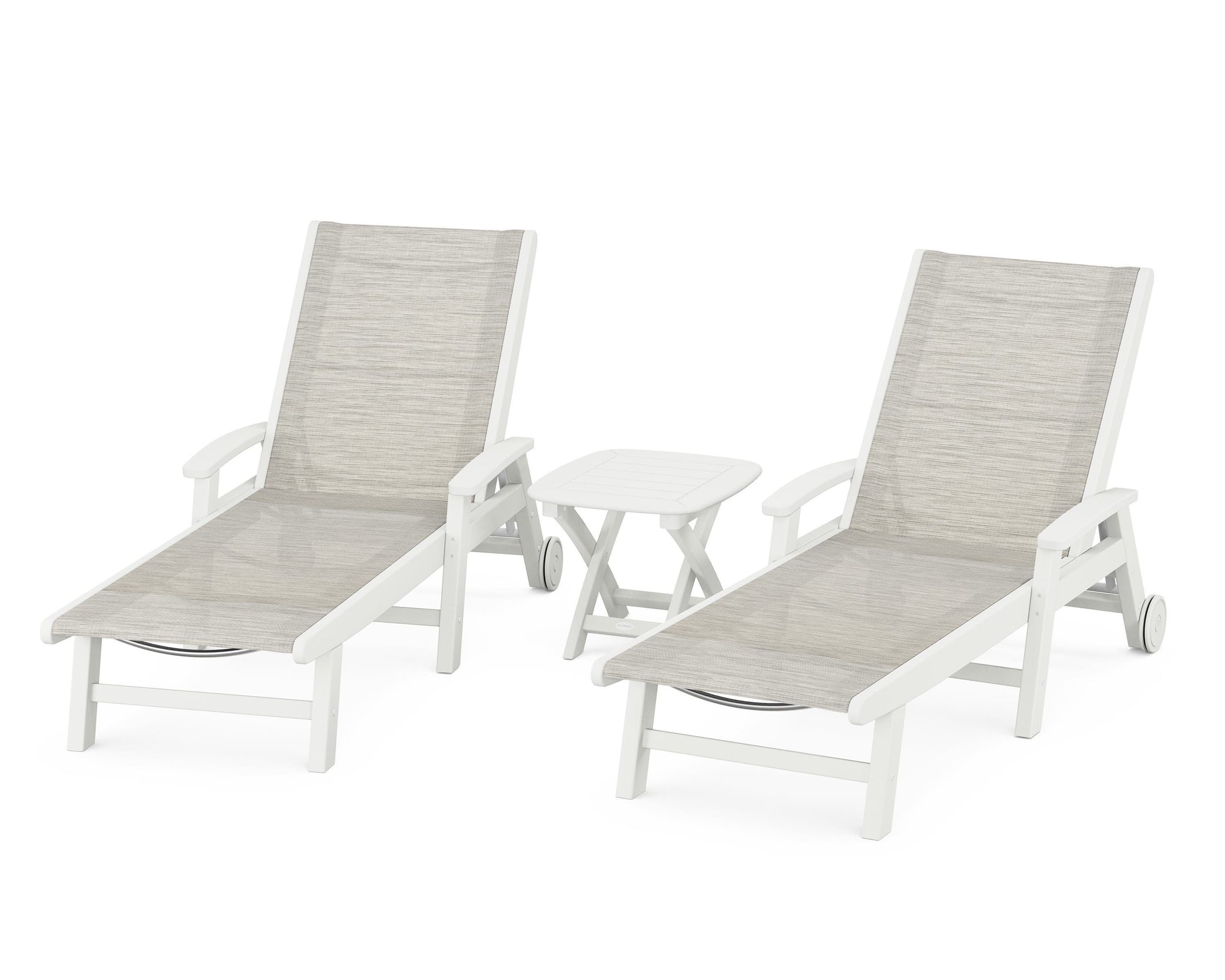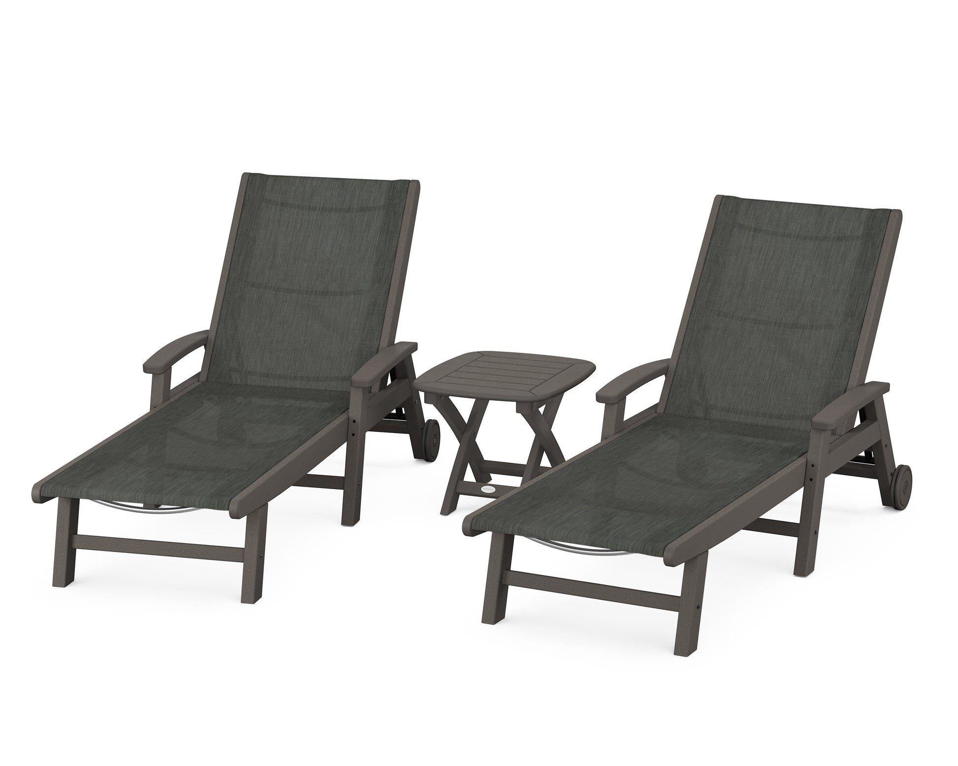 Lie back and relax in the Coastal 3-Piece Chaise with Wheels Set, fitted with a breathable fabric sling for optimal comfort. Conveniently equipped with wheels, you can easily move your all-weather chaise lounges to wherever the sun takes you, and the coordinating side table is the perfect place to set your drinks. Whether poolside or on your patio or deck, this set will look great for many years to come.