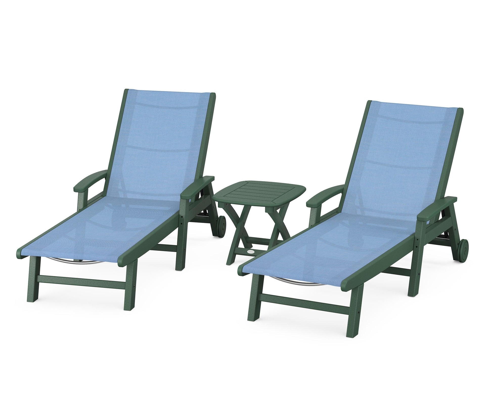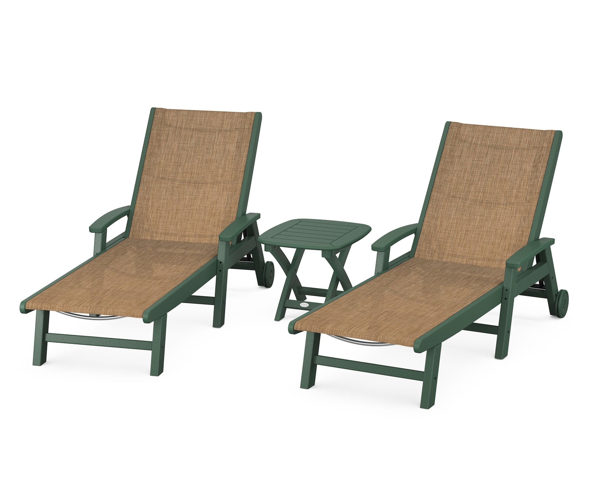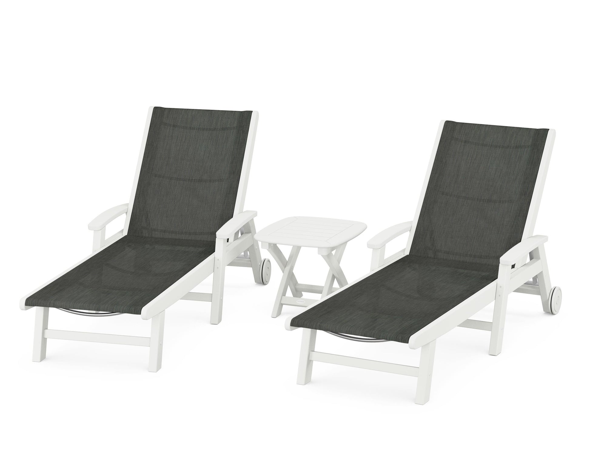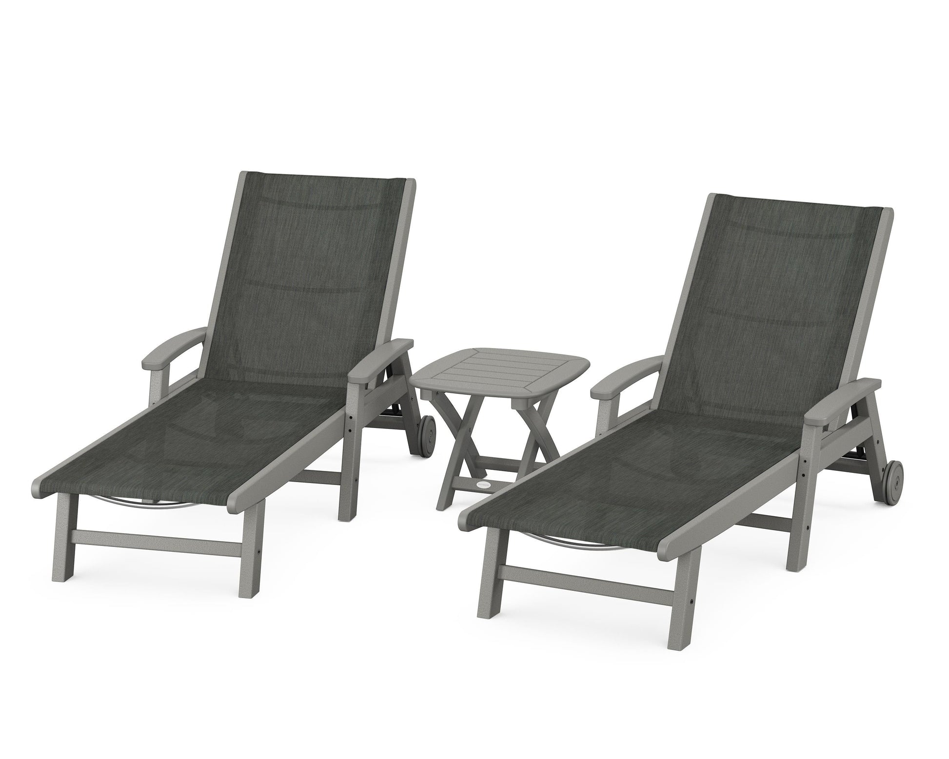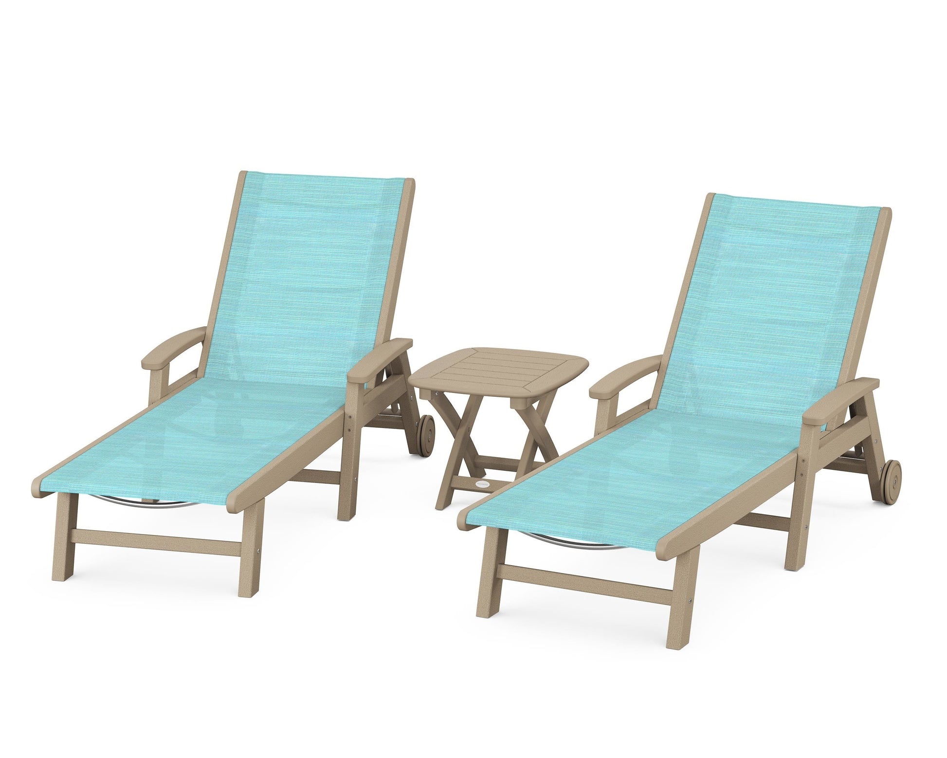 Lie back and relax in the Coastal 3-Piece Chaise with Wheels Set, fitted with a breathable fabric sling for optimal comfort. Conveniently equipped with wheels, you can easily move your all-weather chaise lounges to wherever the sun takes you, and the coordinating side table is the perfect place to set your drinks. Whether poolside or on your patio or deck, this set will look great for many years to come.