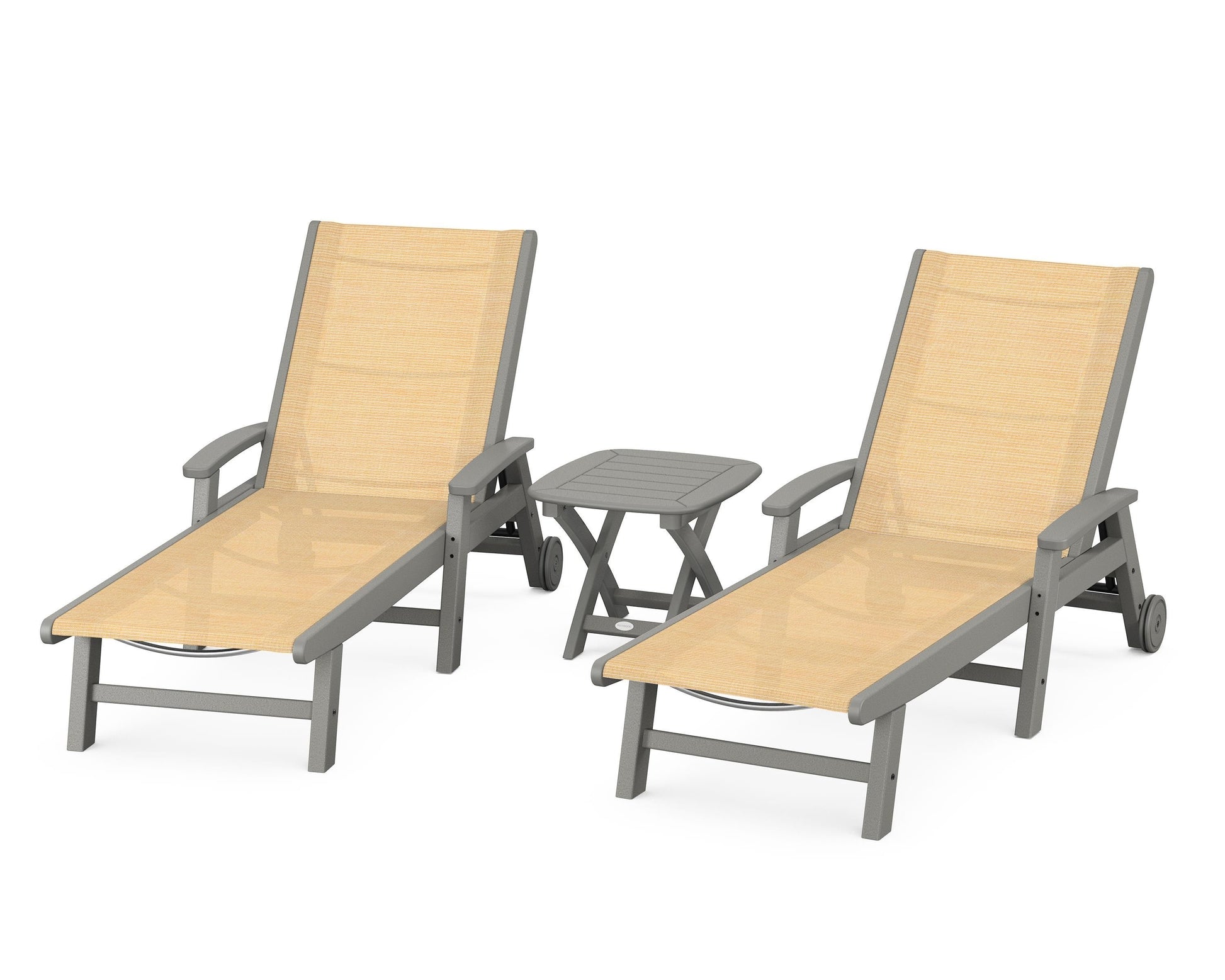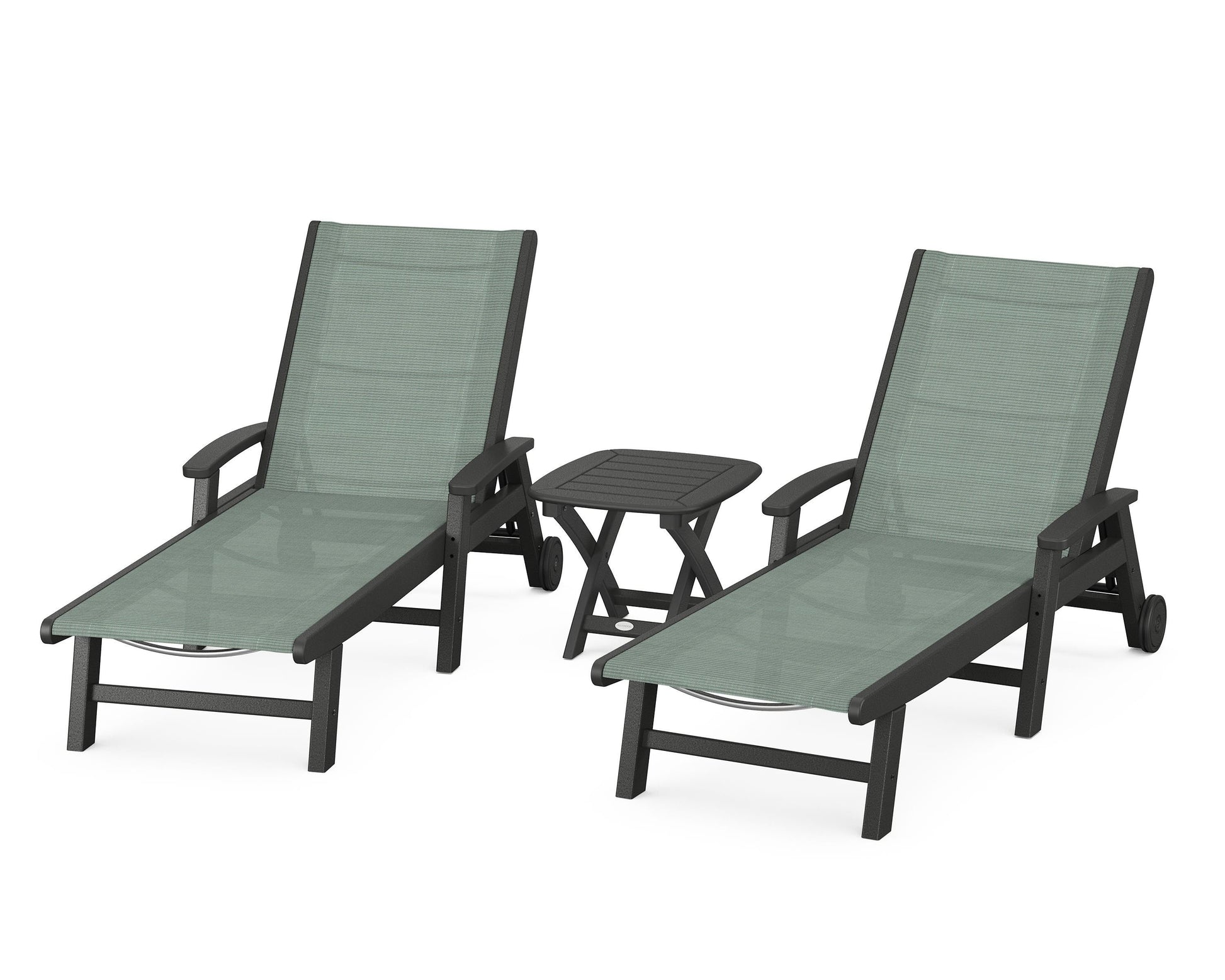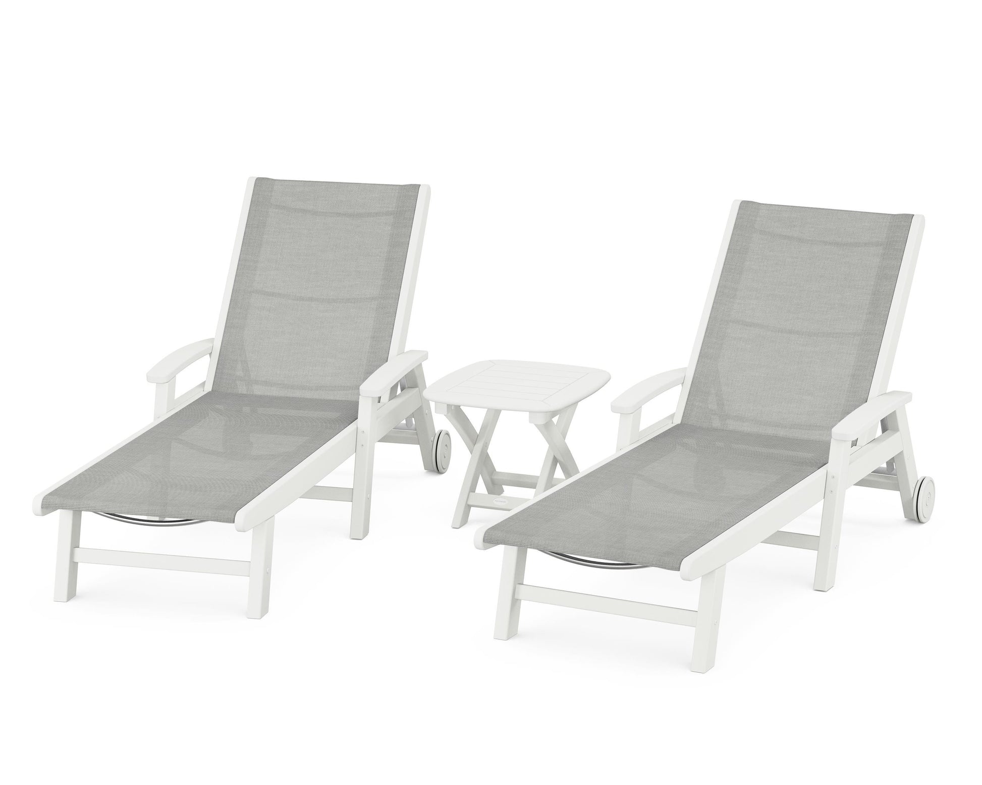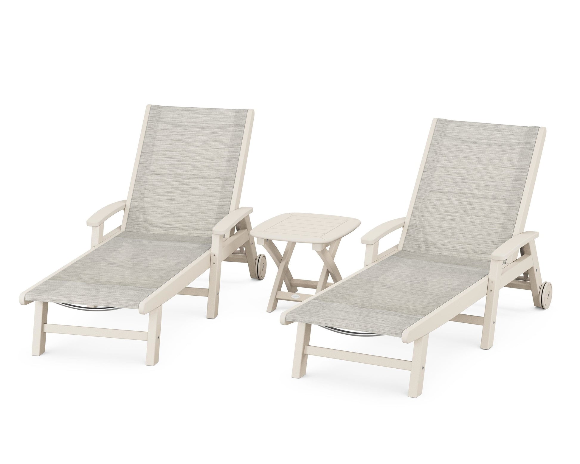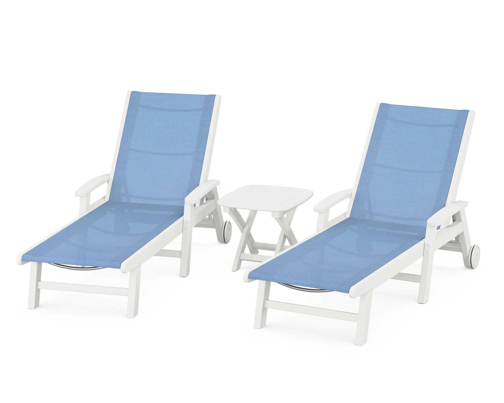 Lie back and relax in the Coastal 3-Piece Chaise with Wheels Set, fitted with a breathable fabric sling for optimal comfort. Conveniently equipped with wheels, you can easily move your all-weather chaise lounges to wherever the sun takes you, and the coordinating side table is the perfect place to set your drinks. Whether poolside or on your patio or deck, this set will look great for many years to come.