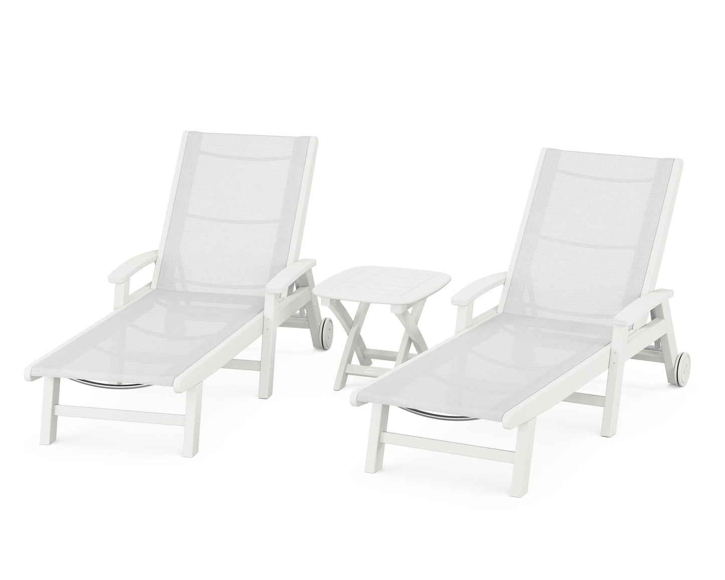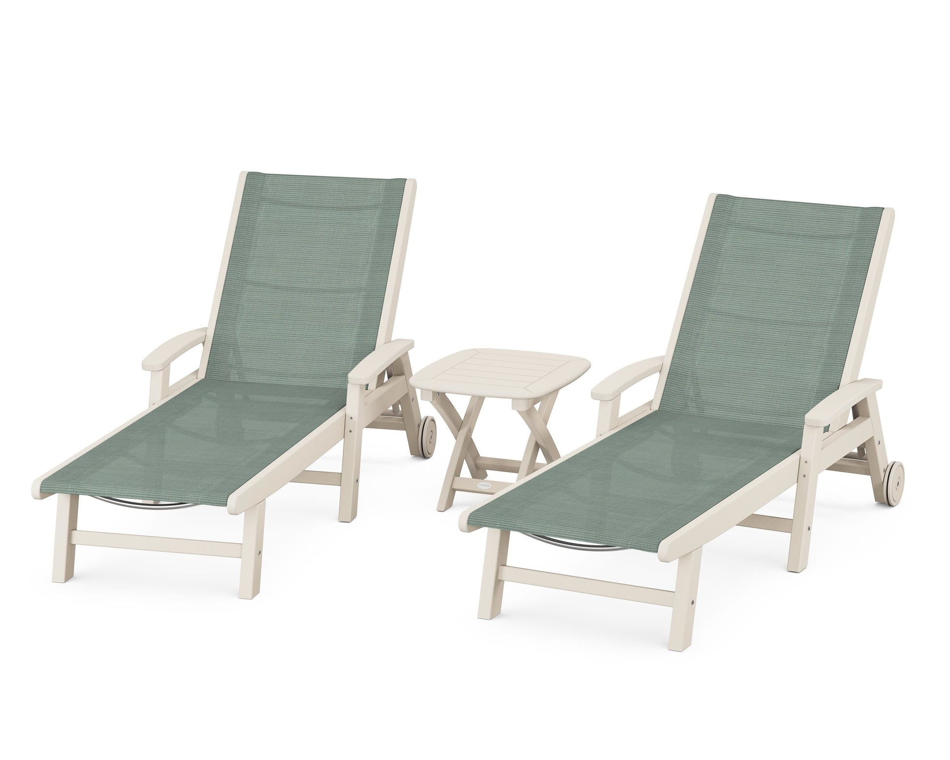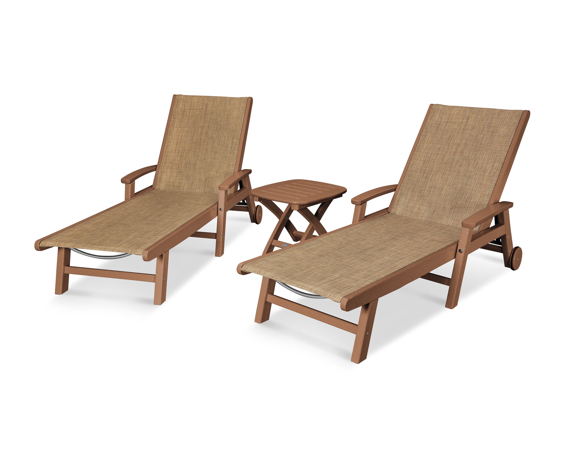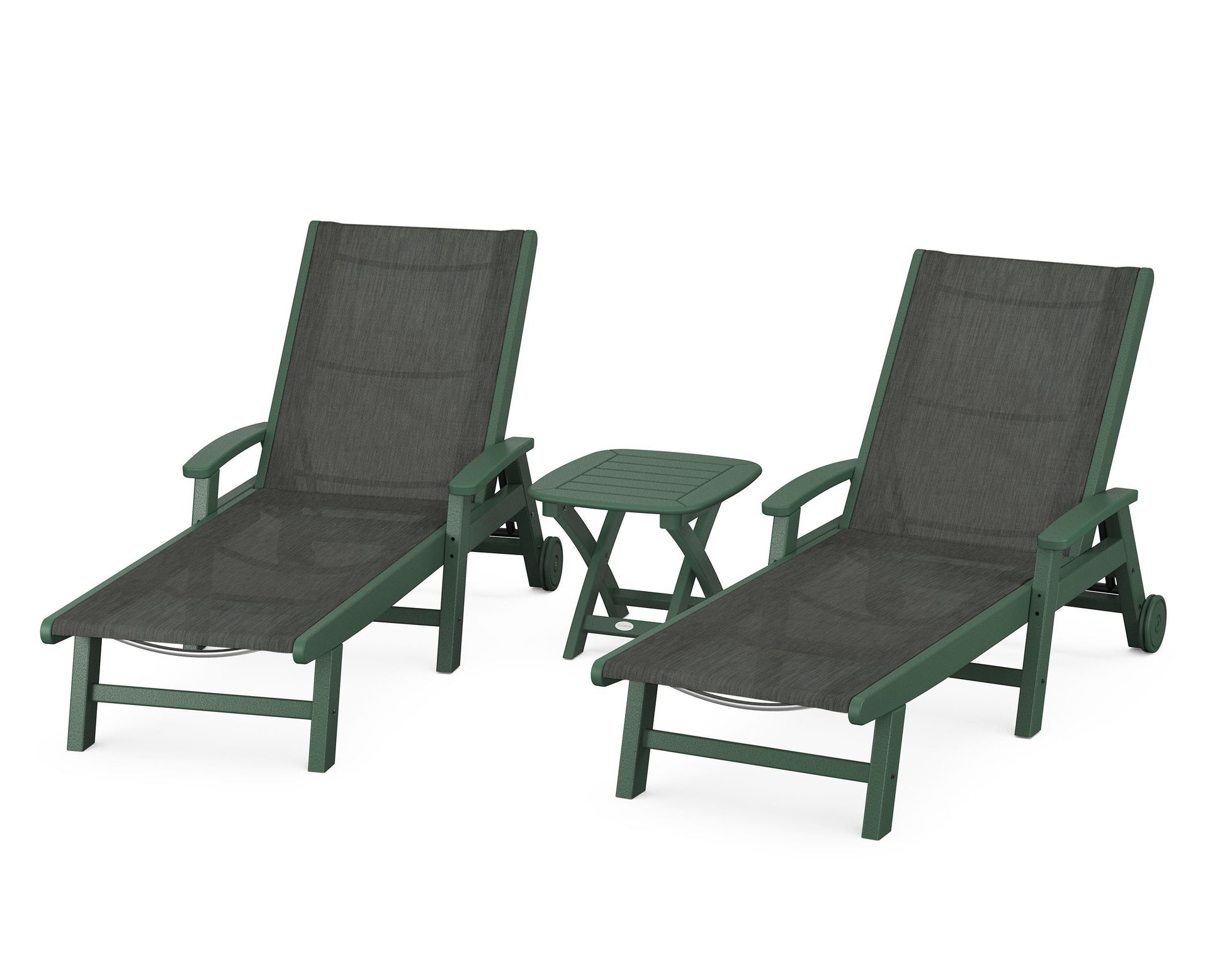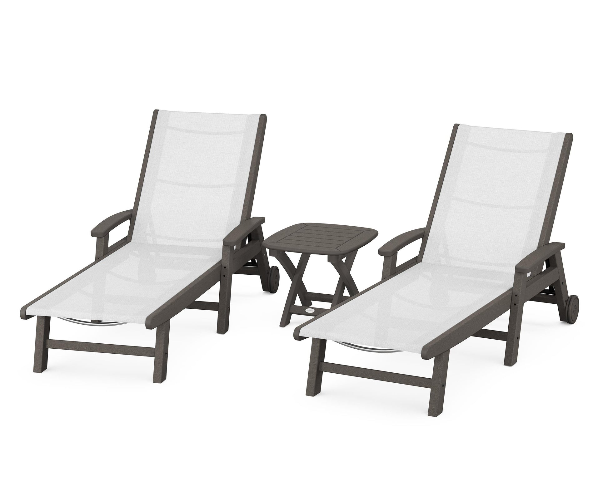 Lie back and relax in the Coastal 3-Piece Chaise with Wheels Set, fitted with a breathable fabric sling for optimal comfort. Conveniently equipped with wheels, you can easily move your all-weather chaise lounges to wherever the sun takes you, and the coordinating side table is the perfect place to set your drinks. Whether poolside or on your patio or deck, this set will look great for many years to come.