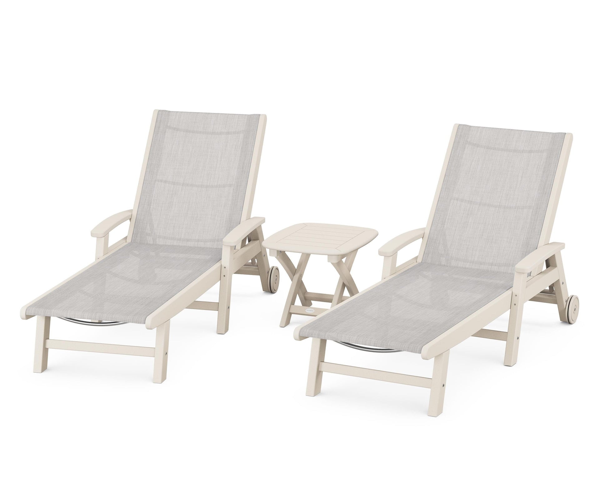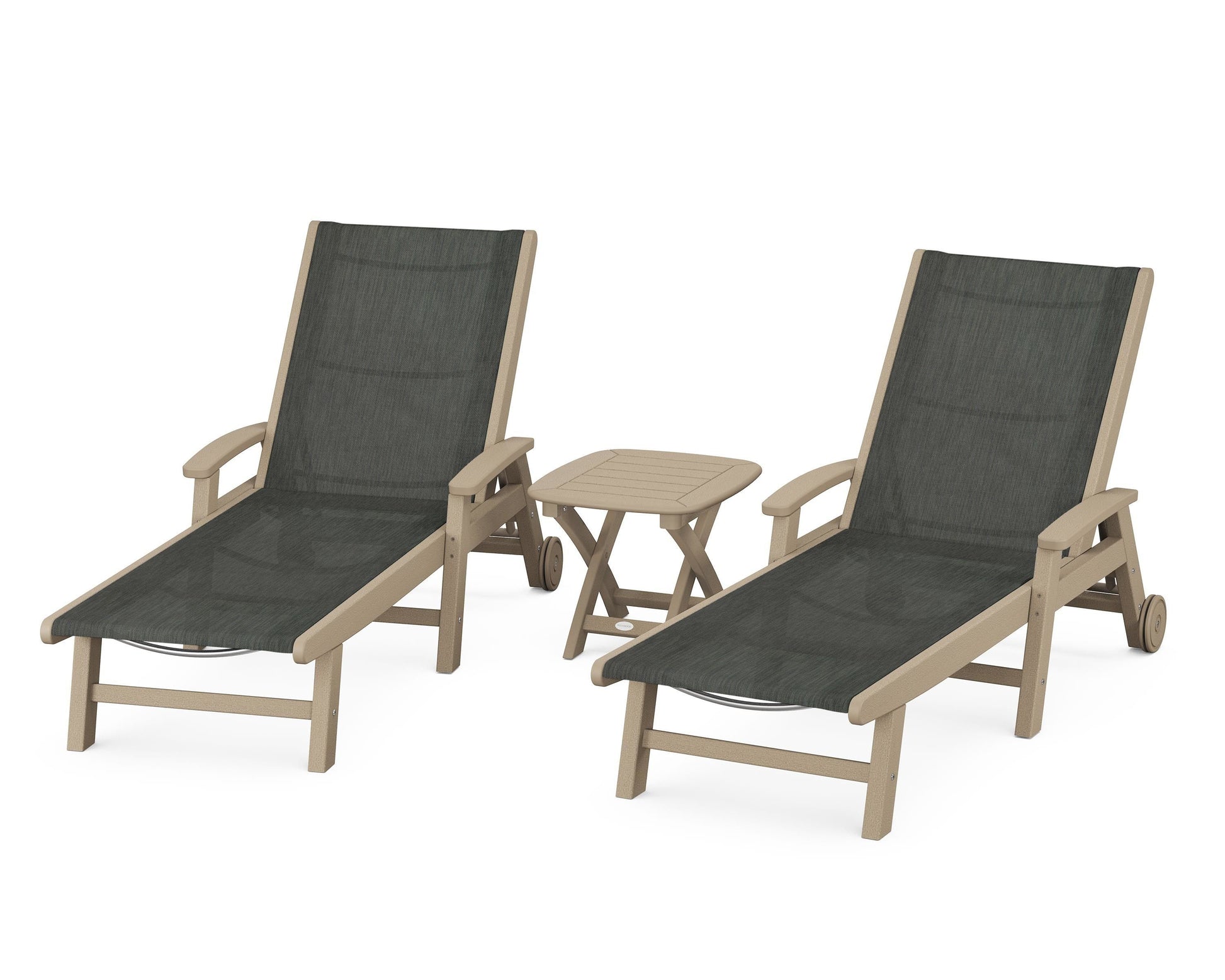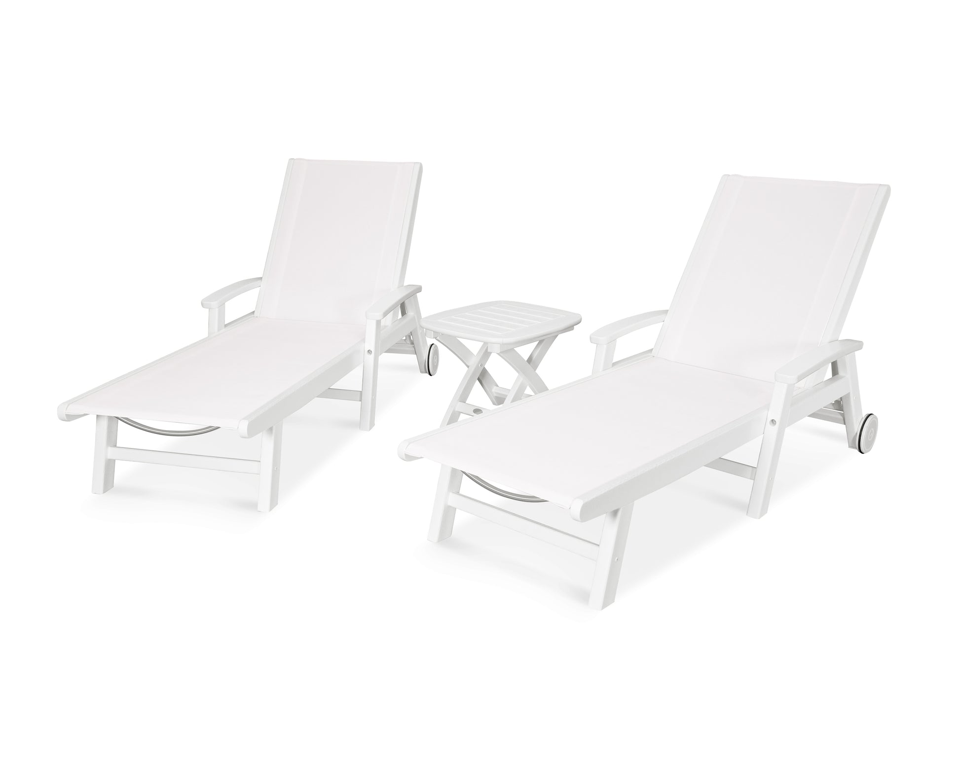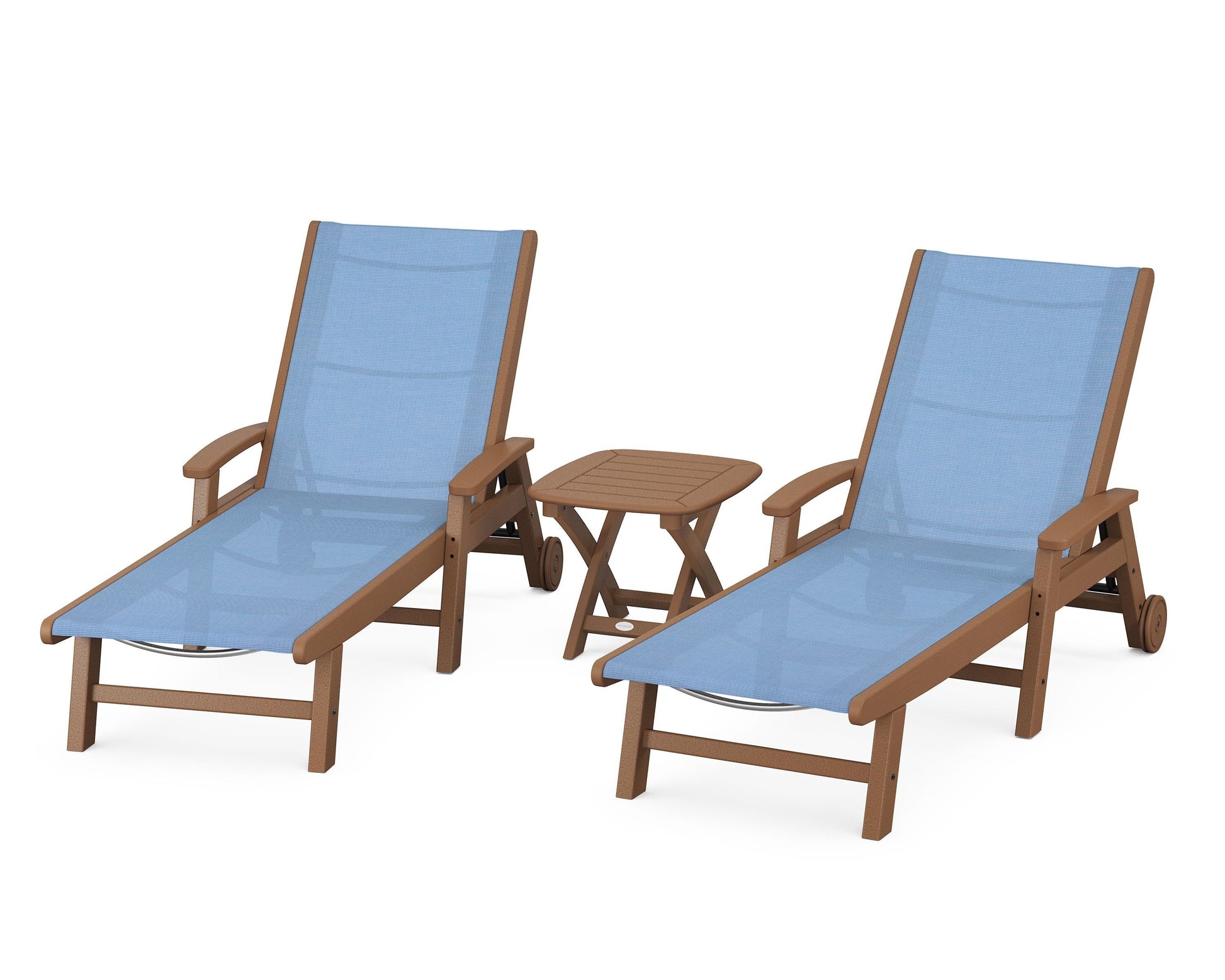 Lie back and relax in the Coastal 3-Piece Chaise with Wheels Set, fitted with a breathable fabric sling for optimal comfort. Conveniently equipped with wheels, you can easily move your all-weather chaise lounges to wherever the sun takes you, and the coordinating side table is the perfect place to set your drinks. Whether poolside or on your patio or deck, this set will look great for many years to come.